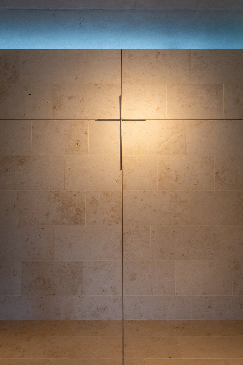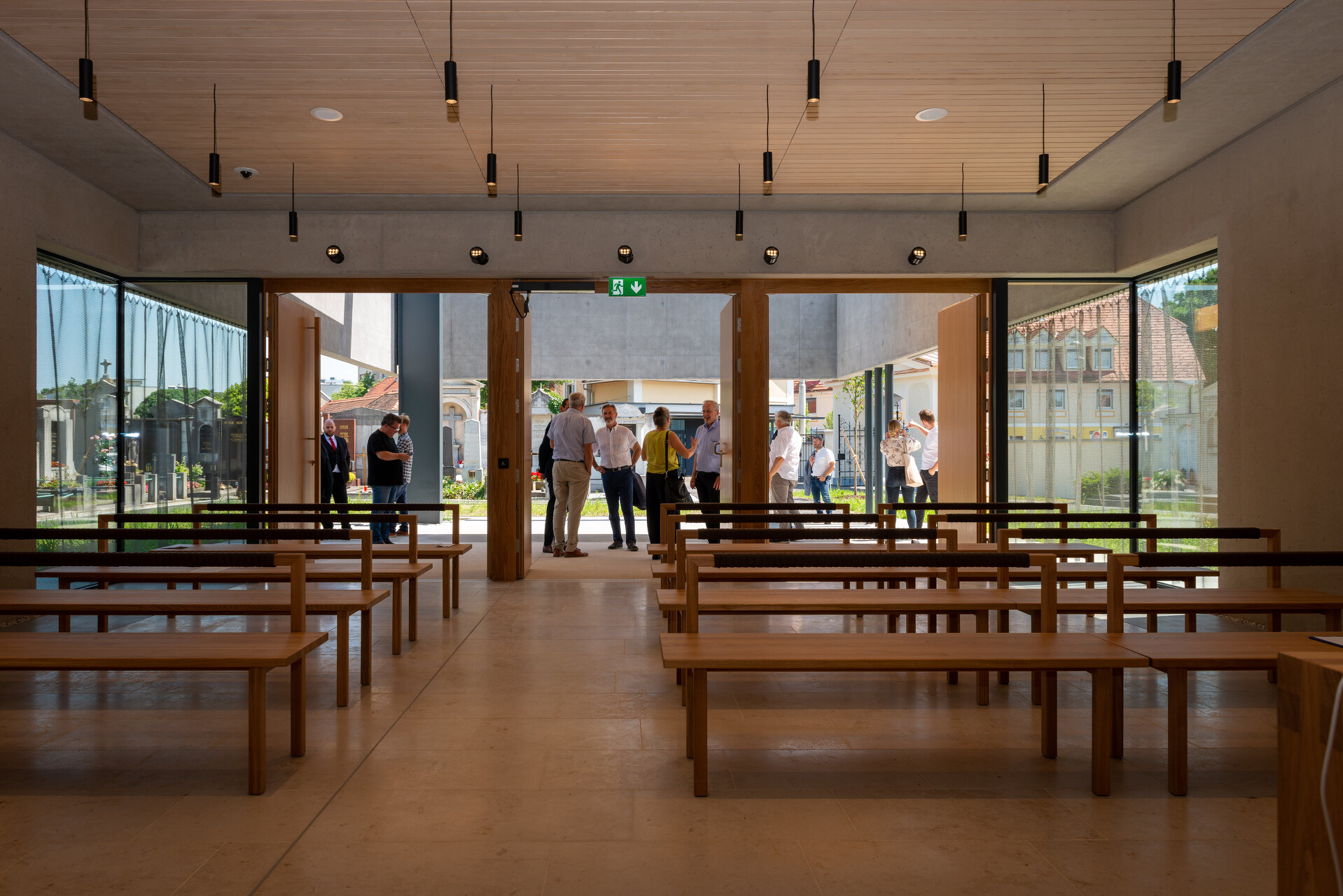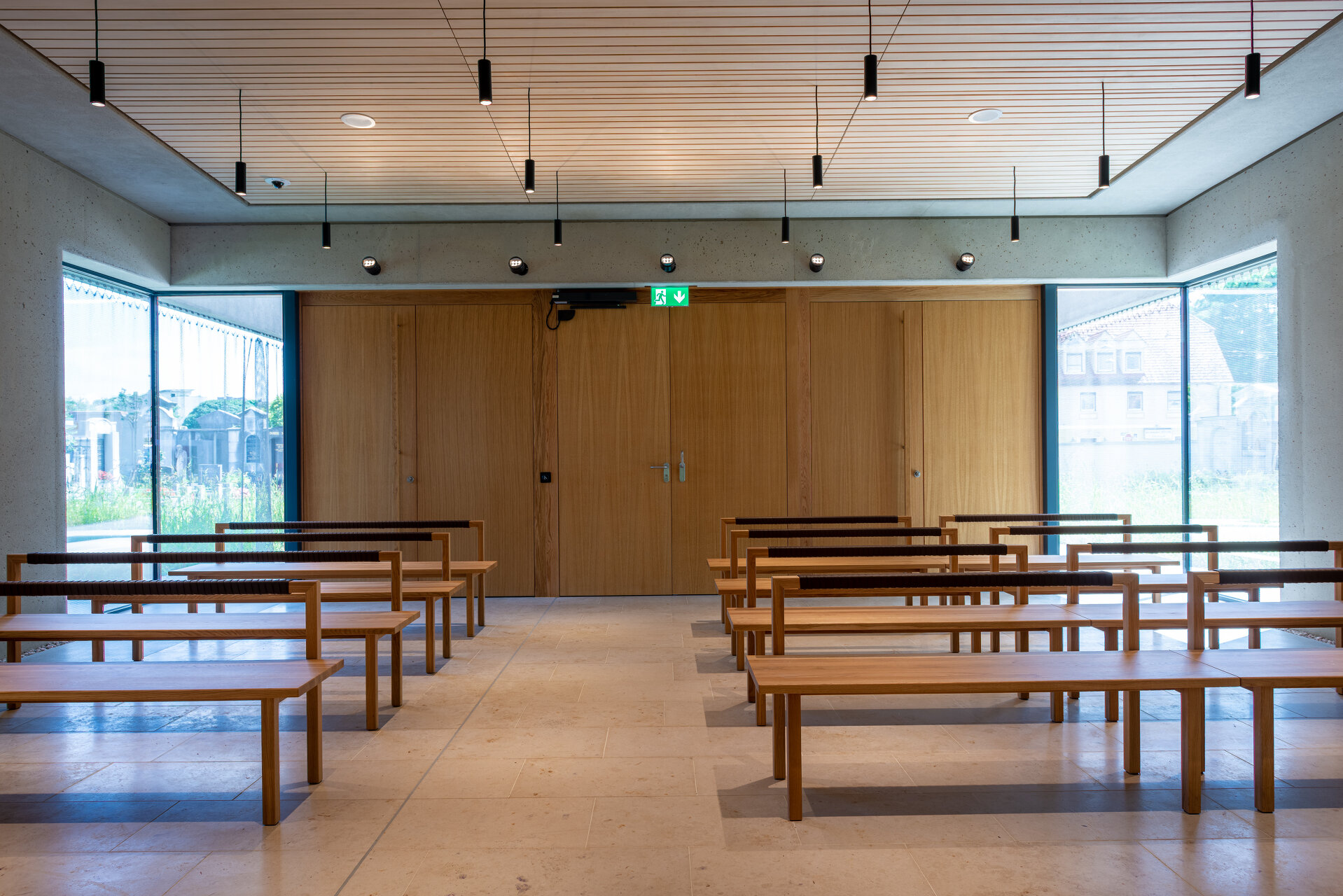 Der etwa 70 m² große Verabschiedungsraum bietet Sitzplätze für bis zu 40 Personen, die hier zwischen geschlossenen Flächen im Materialdreiklang aus Sichtbeton, Naturstein und Holz eine ebenso neutrale wie angenehm geschützte Atmosphäre finden.