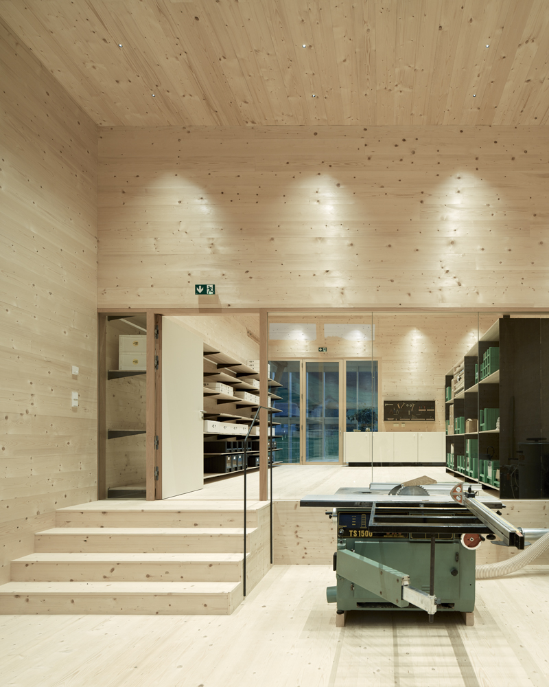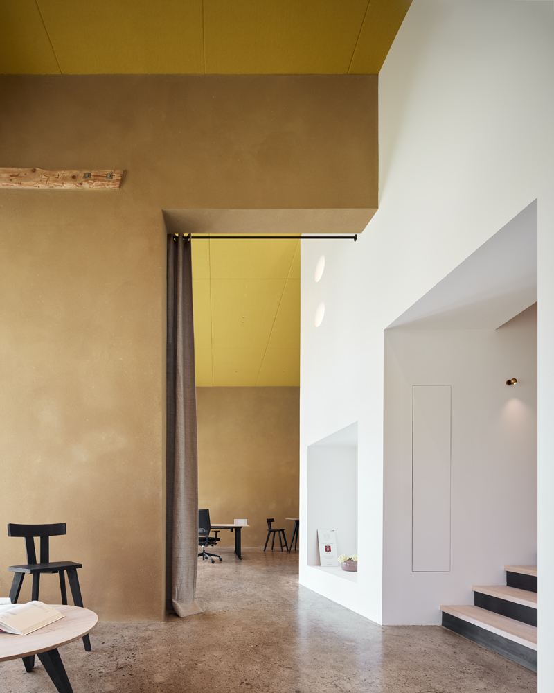 Die vorhandenen Rahmenbedingungen des vierzig Jahre alten Stalls wurden nicht als Einschränkung verstanden, sondern mit neuen Qualitäten verbunden und verwandelt. Im Zusammenspiel von natürlichen Farben, Strukturen und Oberflächen wurde eine ästhetisch und sozial hochwertige Arbeitsumgebung geschaffen. Großen Stellenwert nahm das ressourcenschonende, nachhaltige und regionale Bauen ein. So wurde Stroh – zuvor als Einstreu genutzt – als Dämmstoff eingesetzt, der lehmhaltige Boden fand im Lehmputz an den Wänden Verwendung und für die Decken wurden Paneele aus österreichischer Schafwolle verbaut.