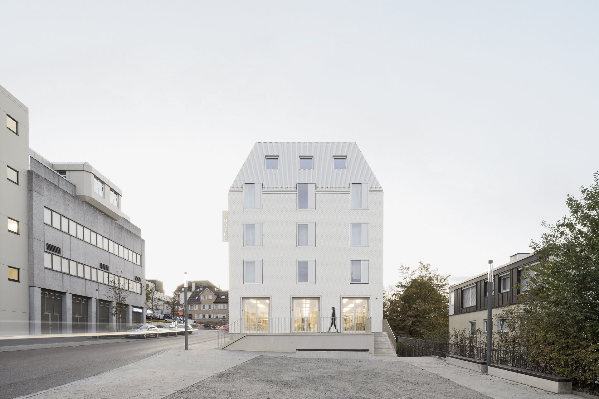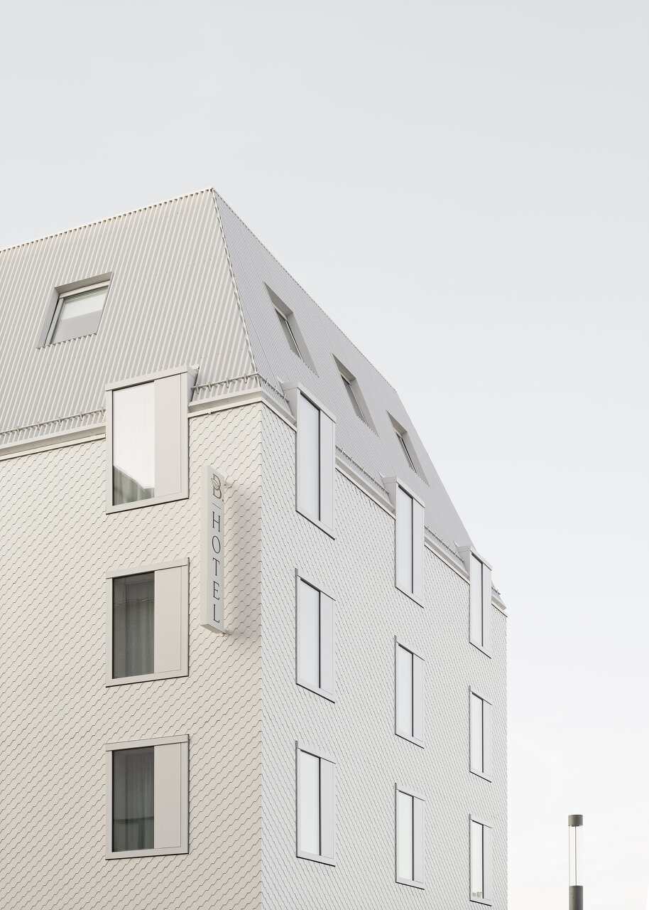 Ein Betontreppenkern steift das Gebäude aus. Sowohl im Treppenhaus als auch in den Räumen bleiben die Oberflächen in ihrer Eigenkonstruktion sichtbar und erzeugen so eine besondere Atmosphäre: Sichtbeton und lackiertes Metall auf der einen Seite, Fichtenholz und natürliche Stoffe auf der anderen. Die Verschalung mit weißen Faserzementplatten verrät nicht, dass es sich um ein Holzgebäude handelt. (Text: Architekten, Bearbeitung: Achim Geissinger)