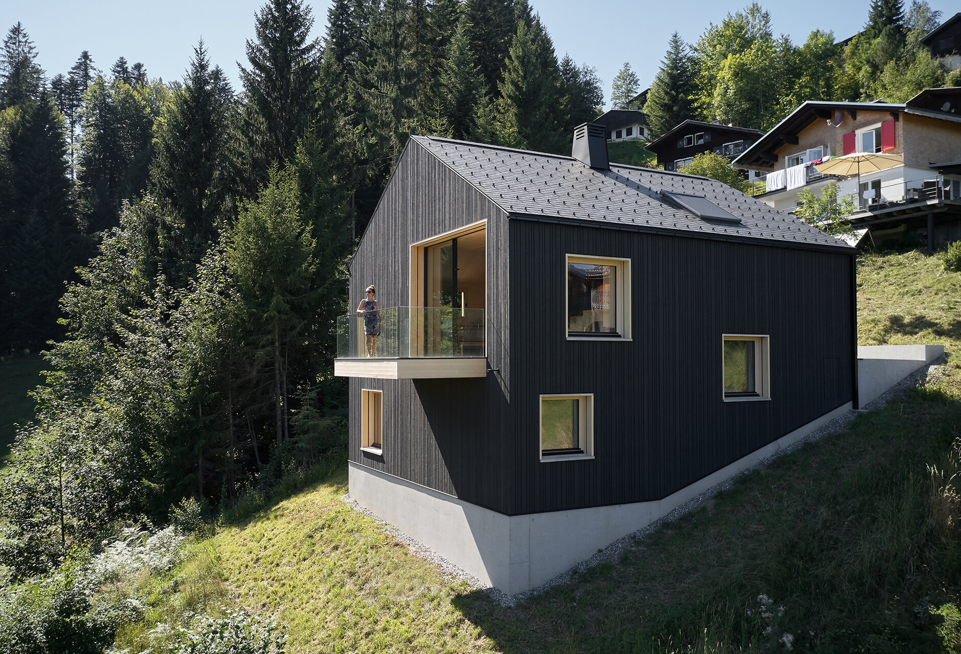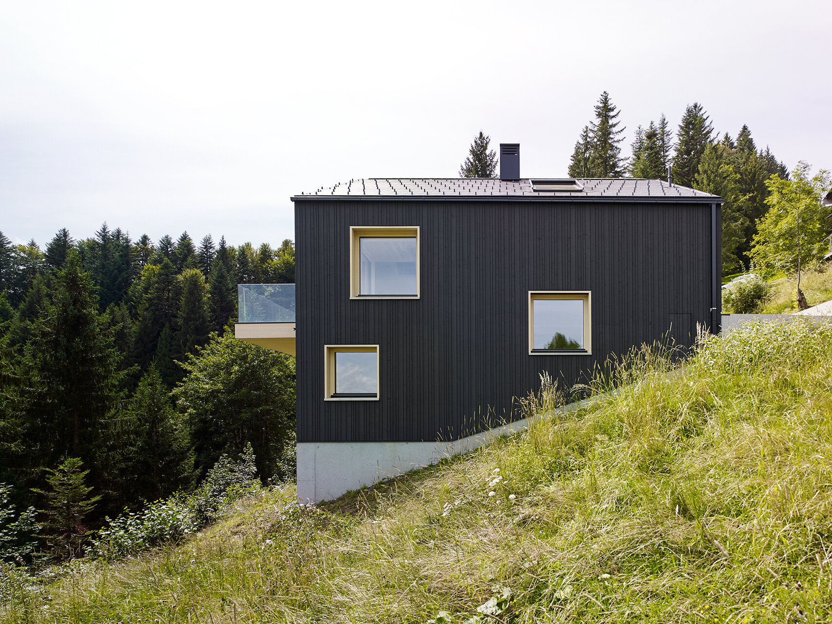 Die Ausführung in Massivholz macht das statische Gerüst des Gebäudes sichtbar und ist vor allem im Innenbereich direkt erlebbar. Die Fensteröffnungen gliedern den Baukörper von außen, innen bilden sie ausgesuchte Sichtachsen in die Umgebung. Die abgetreppte Gebäudestruktur ermöglicht die optimale Anpassung des Baukörpers an das steile Gelände und sorgt innen für ein besonderes, dreidimensionales Raumerlebnis. Im Untergeschoß liegen die Rückzugsbereiche mit bewusst reduzierten und kleinen Schlafräumen. Im Erdgeschoß öffnet sich der über mehrere Ebenen gegliederte Wohnbereich Richtung Tal und Terrasse. Die großzügige Verglasung kann durch eine wandintegrierte Schiebetüre vollständig zum unmittelbar angrenzenden Wald geöffnet werden. Der Ofen bildet nicht nur optisch, sondern auch funktional das Zentrum des Wohnbereichs und wärmt fast das ganze Gebäude.