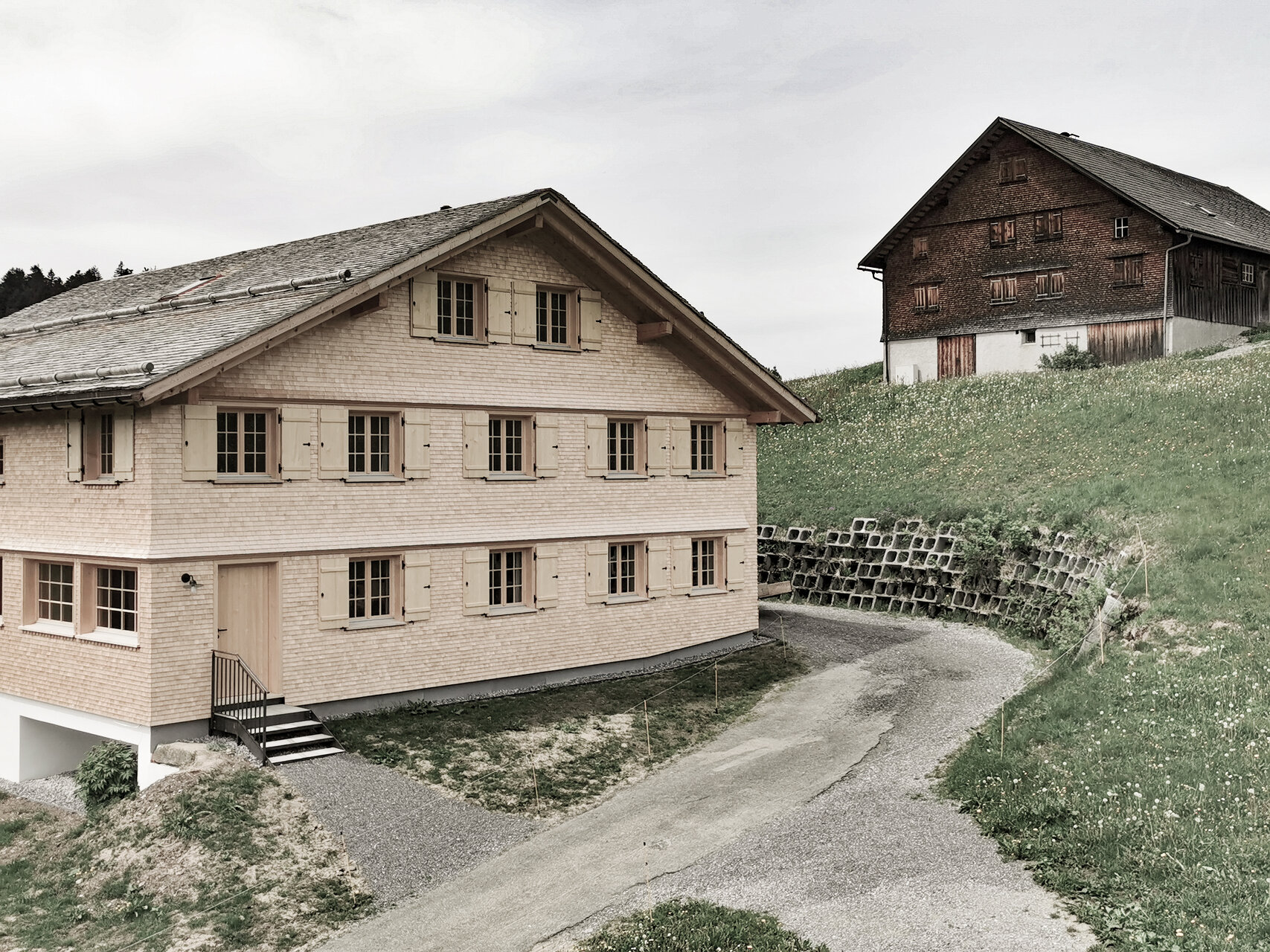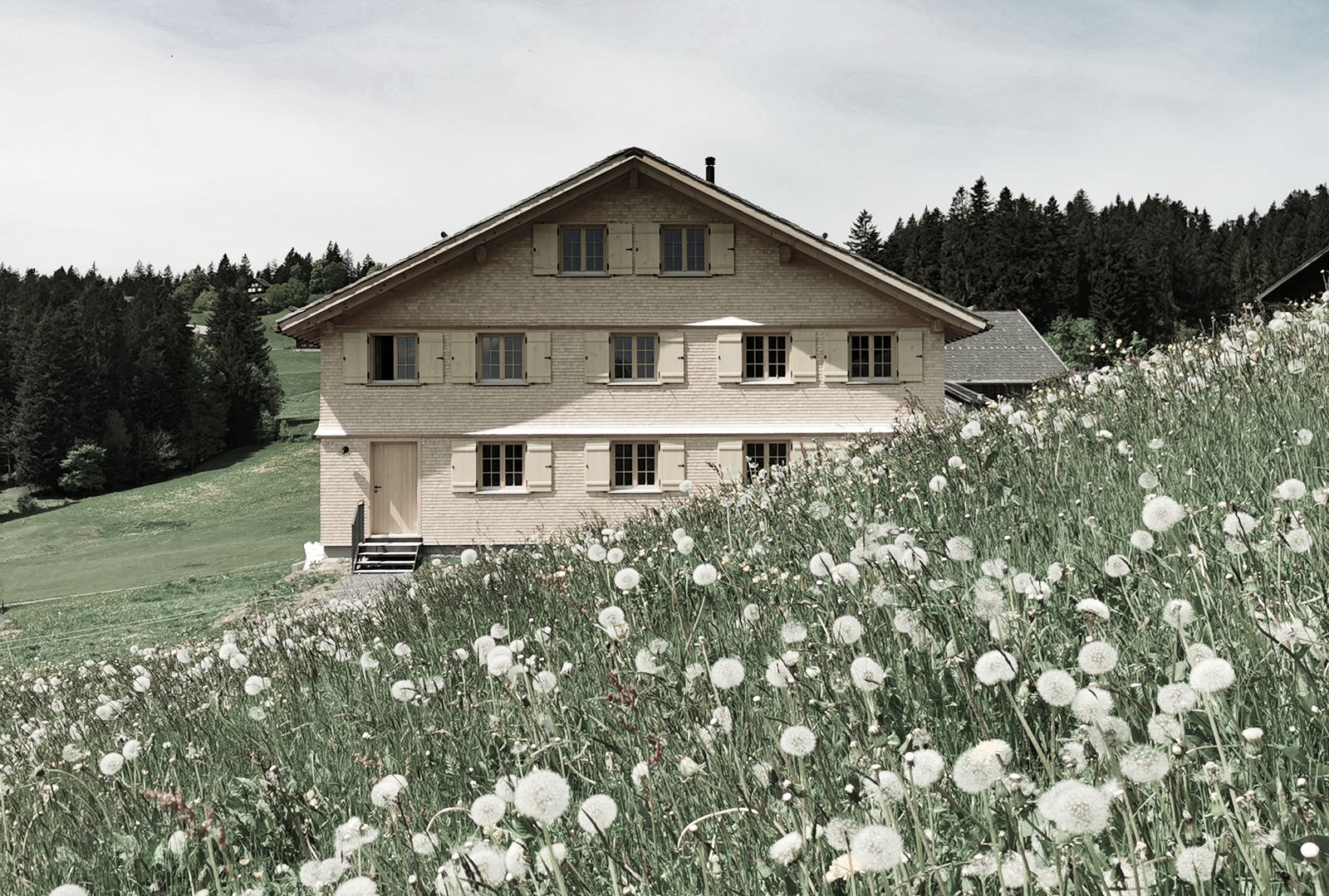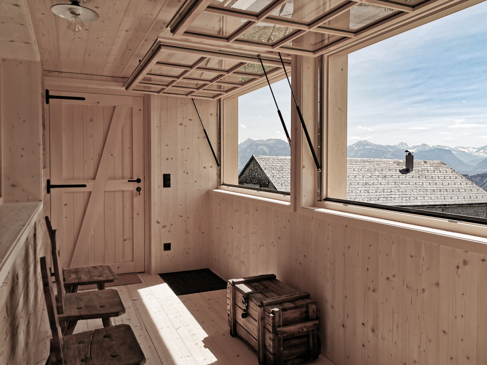 Auch der fast 300-jährige Holzbau des Vorsäßes der Familie Oberhauser am Geißkopf war aufgrund seines schlechten Zustands nicht mehr benutzbar. Der Ersatzneubau respektiert die traditionelle Bregenzerwälder Typologie und verändert sie nur da, wo es für die neue Nutzung als Ferienhaus notwendig ist. So wurden die Erschließung ins Zentrum gelegt und der Eingangsbereich vergrößert. Um die typische Lochfassade in ihren Abständen (sowohl vertikal als auch horizontal) zu erhalten, wurde auf eine Anpassung der Raumhöhen verzichtet. Das Vorderhaus wurde geschindelt und der Stalltrakt mit einem vertikalen Holzschirm verkleidet. (Text: Architekten, bearbeitet)