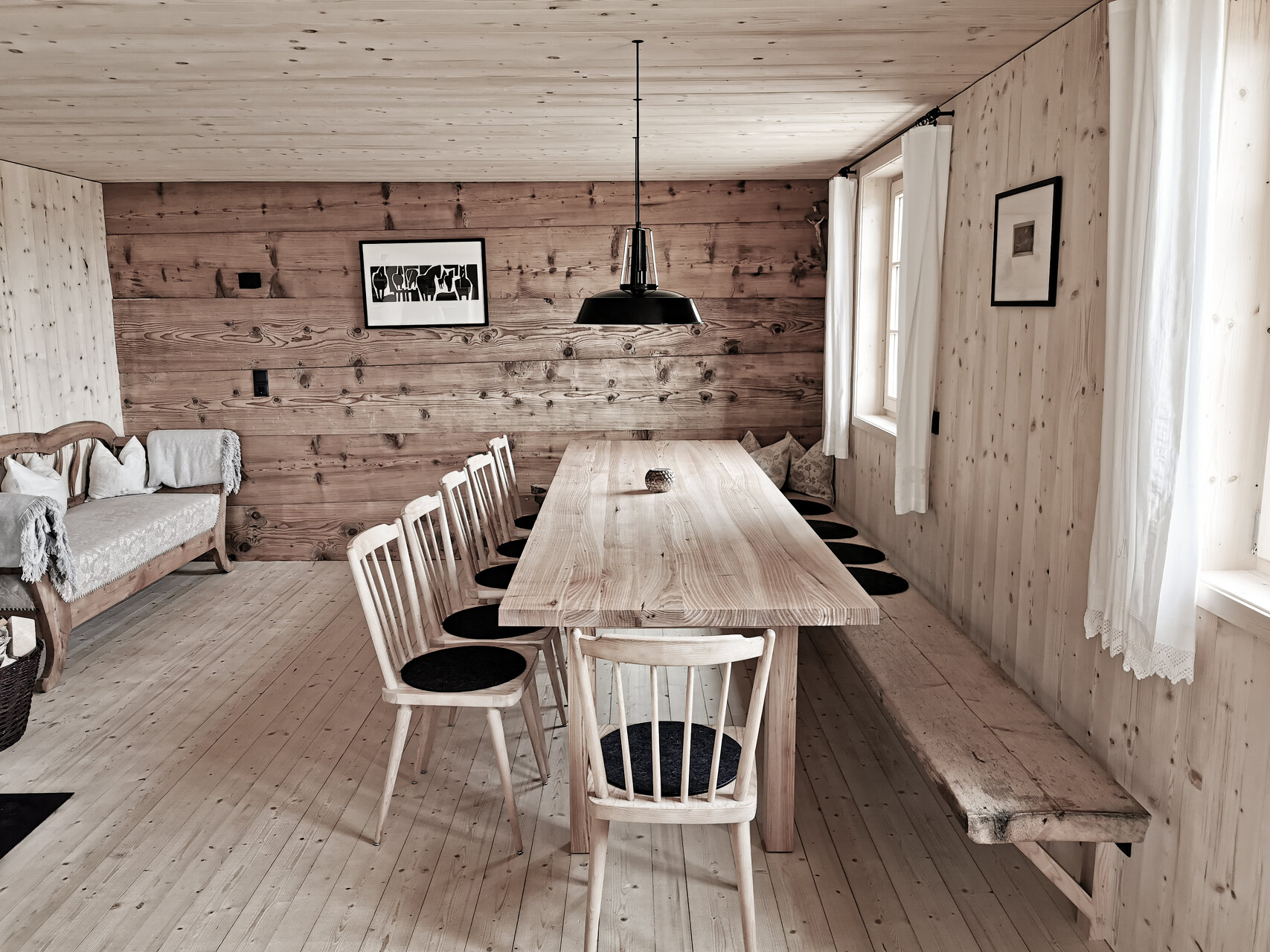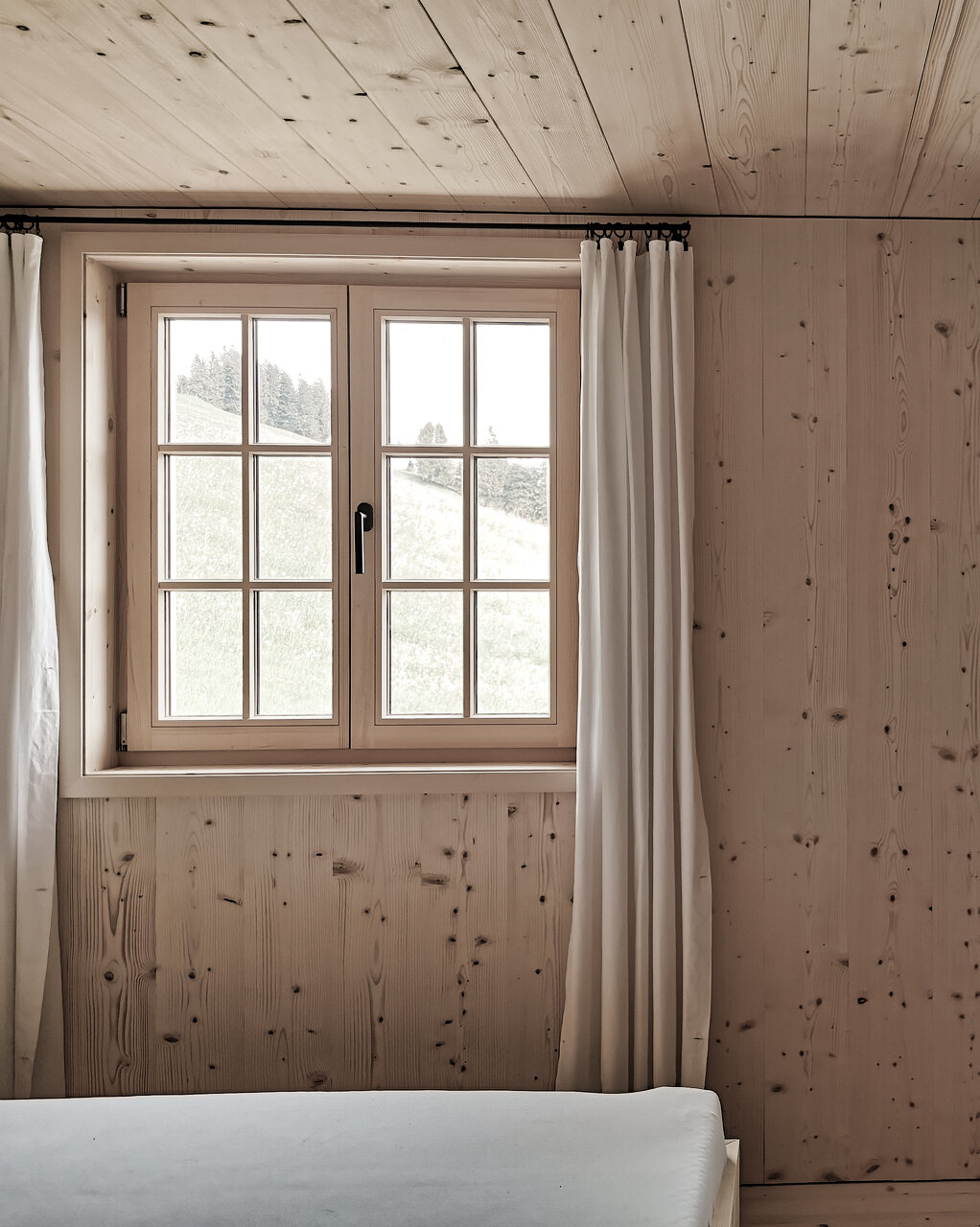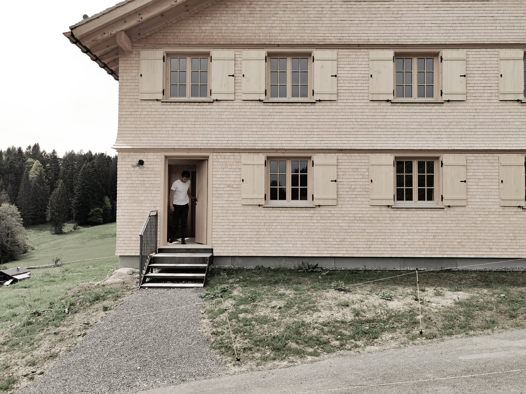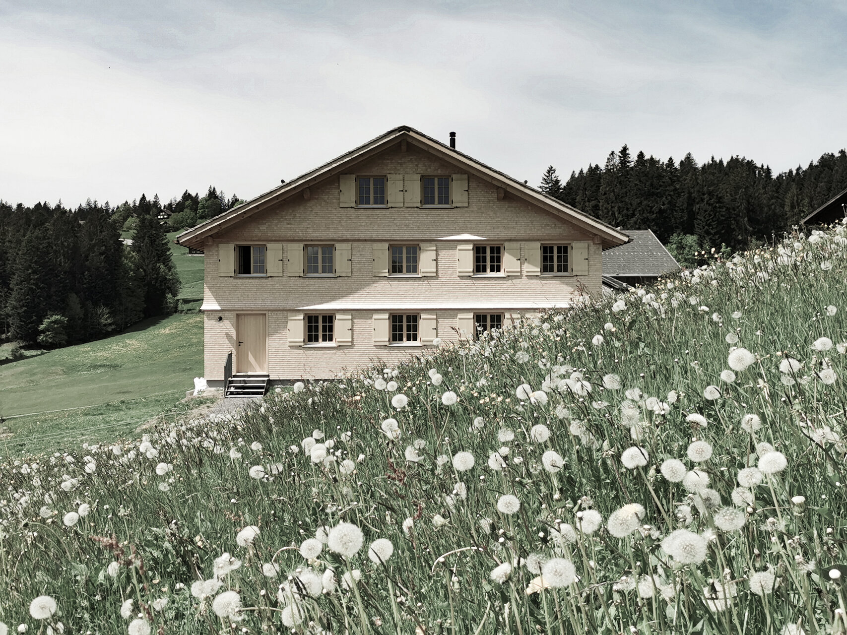 Auch der fast 300-jährige Holzbau des Vorsäßes der Familie Oberhauser am Geißkopf war aufgrund seines schlechten Zustands nicht mehr benutzbar. Der Ersatzneubau respektiert die traditionelle Bregenzerwälder Typologie und verändert sie nur da, wo es für die neue Nutzung als Ferienhaus notwendig ist. So wurden die Erschließung ins Zentrum gelegt und der Eingangsbereich vergrößert. Um die typische Lochfassade in ihren Abständen (sowohl vertikal als auch horizontal) zu erhalten, wurde auf eine Anpassung der Raumhöhen verzichtet. Das Vorderhaus wurde geschindelt und der Stalltrakt mit einem vertikalen Holzschirm verkleidet. (Text: Architekten, bearbeitet)