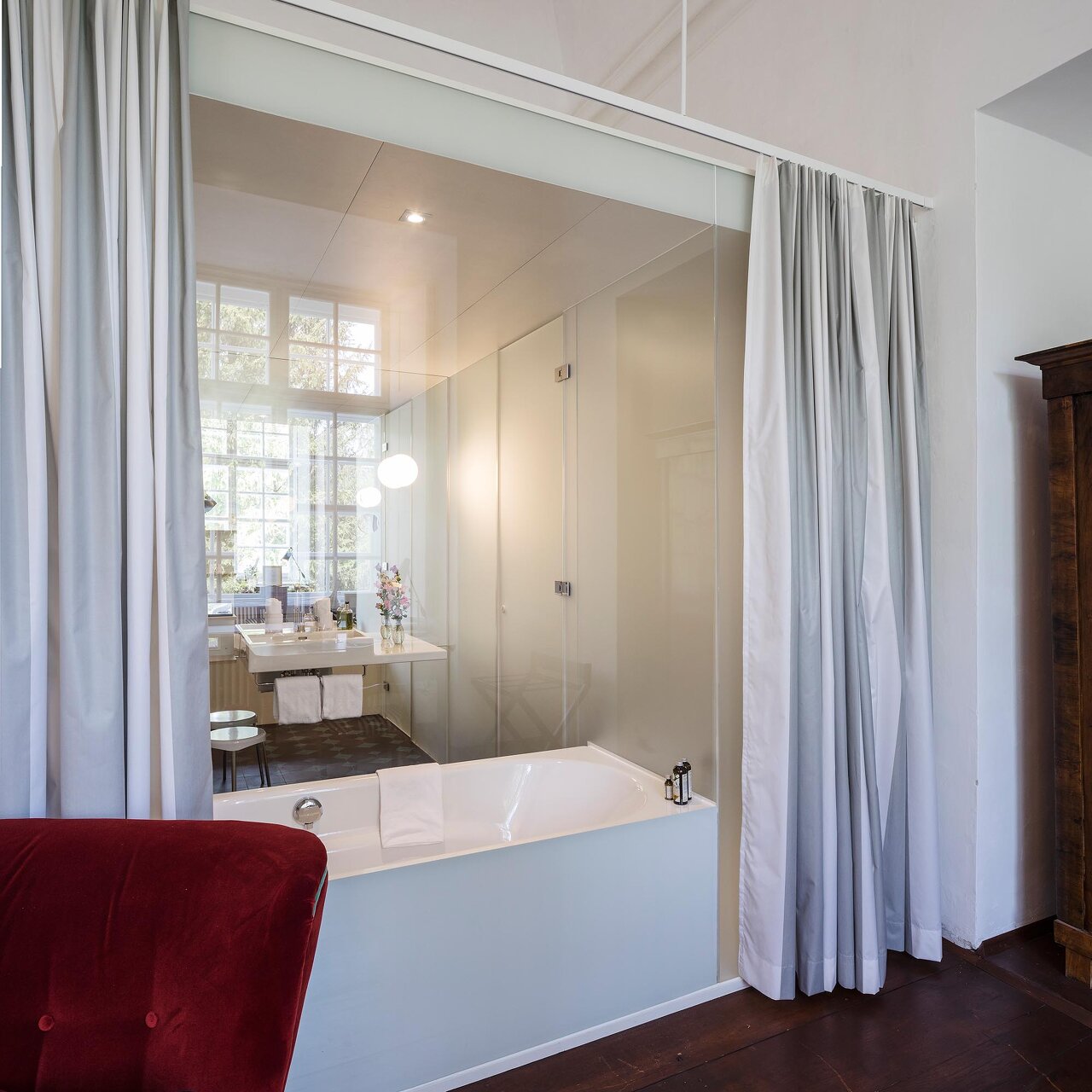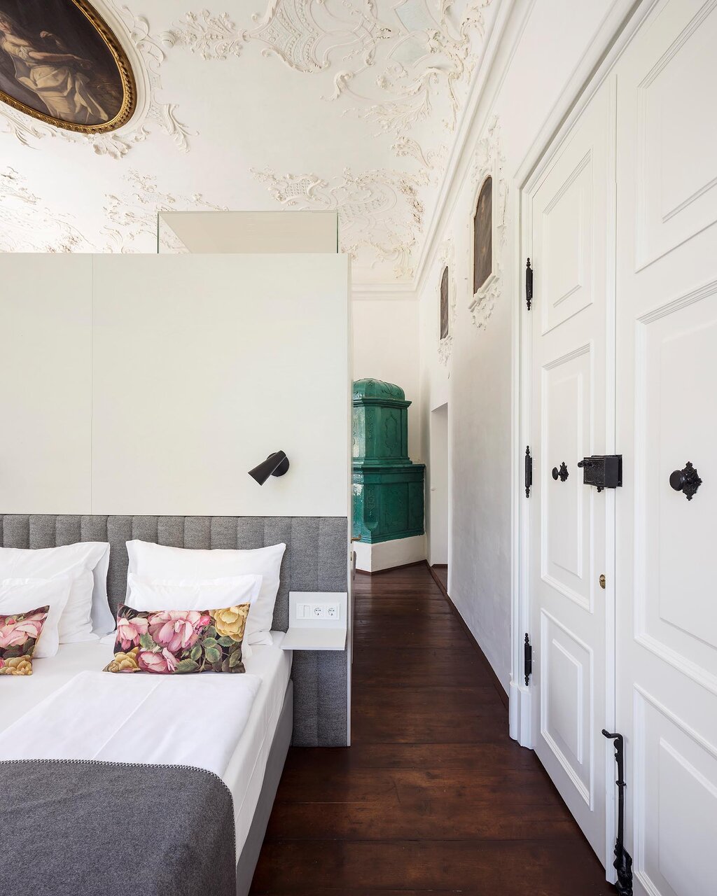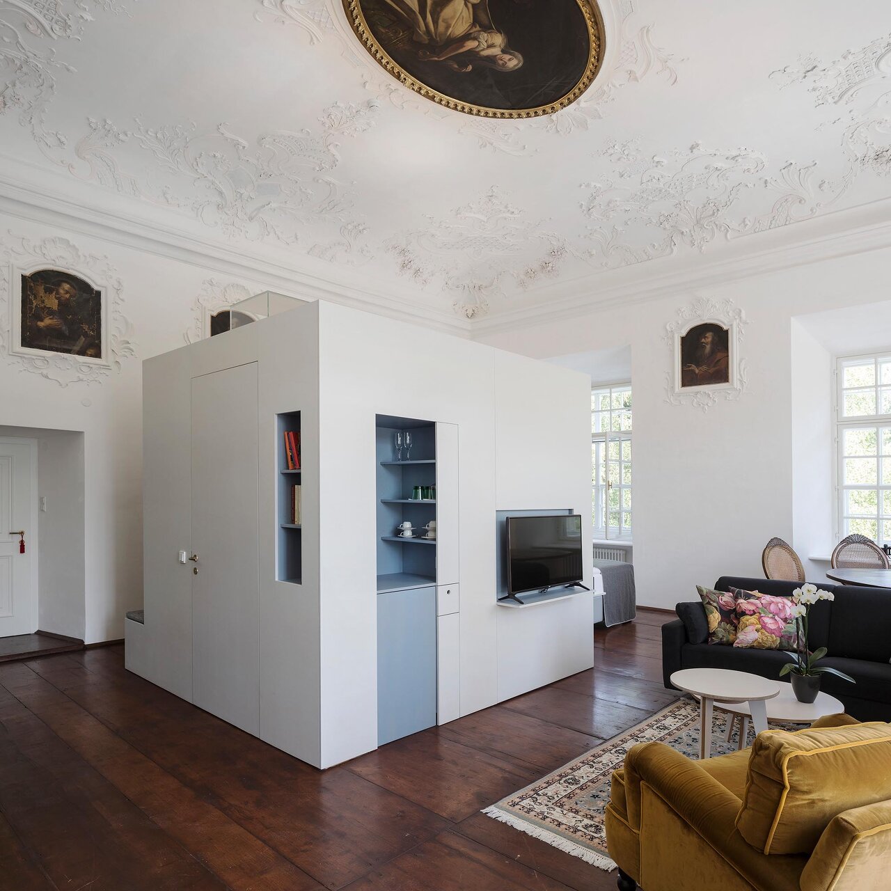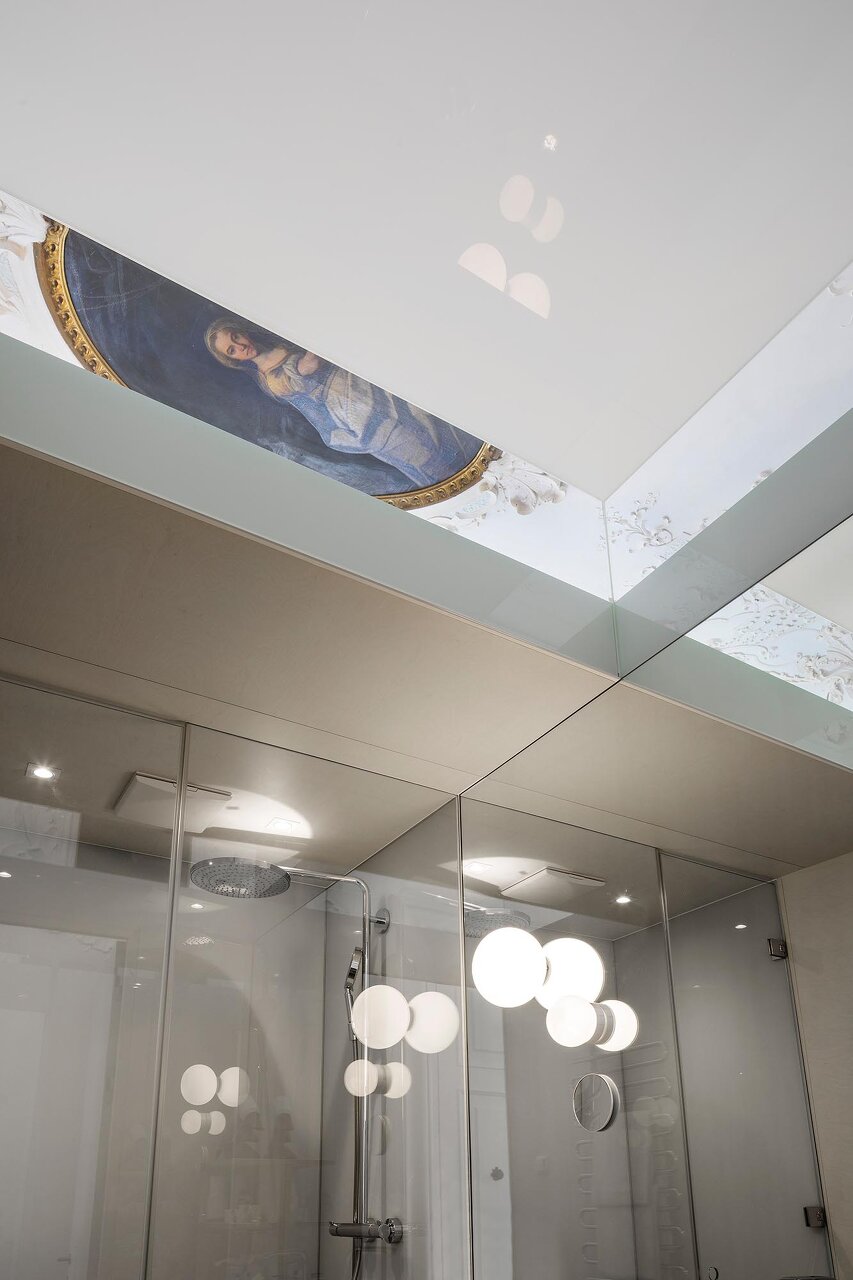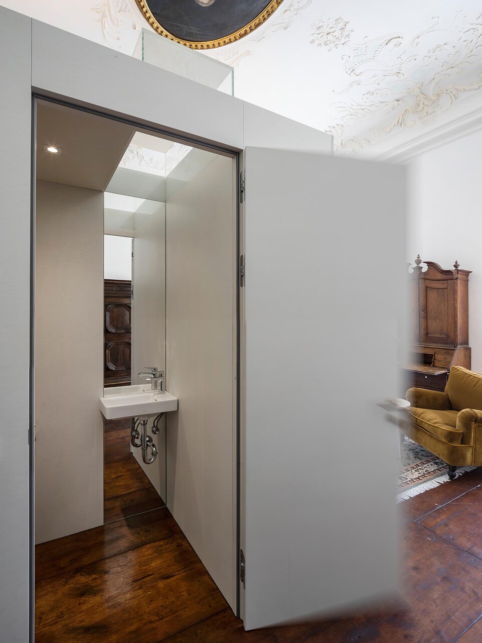 Die Einheiten für Körperkultur in der Box, also Bad und WC, ermöglichen Ausblicke zu den prachtvollen Deckenstukkaturen aus der Zeit der Fürsterzbischöfe.