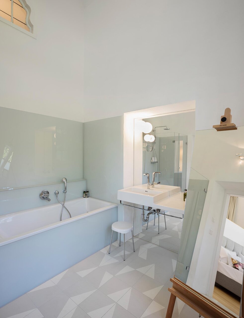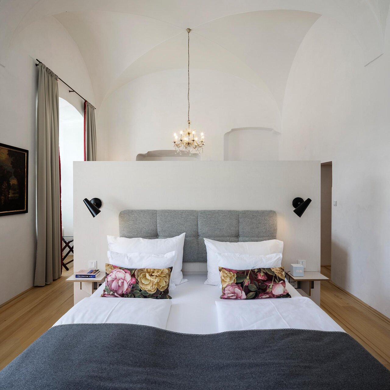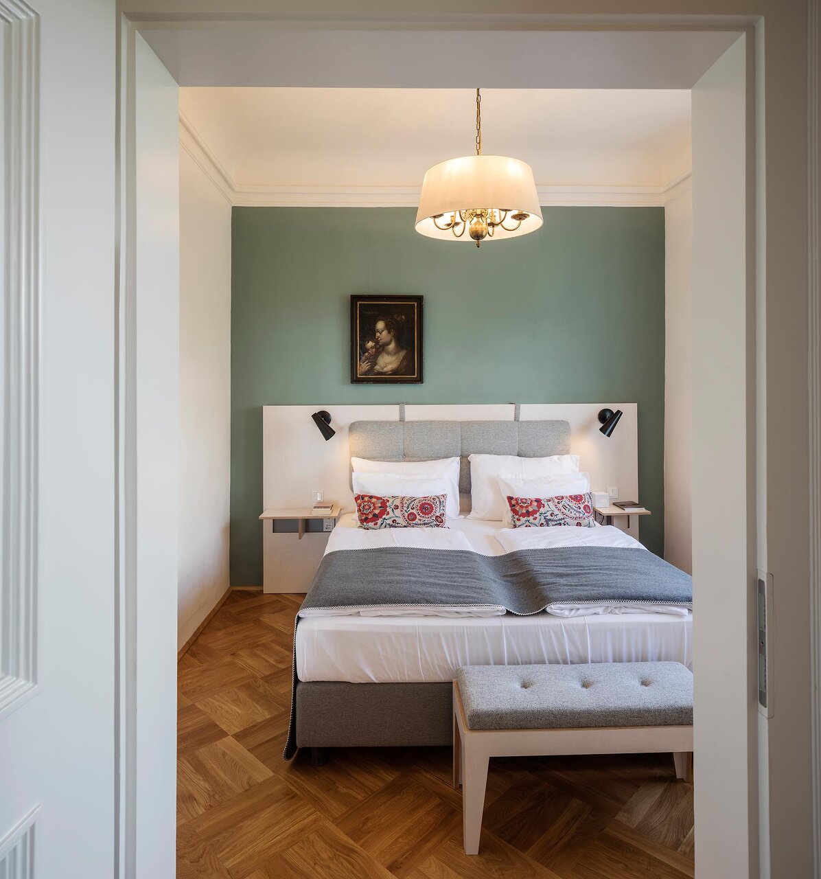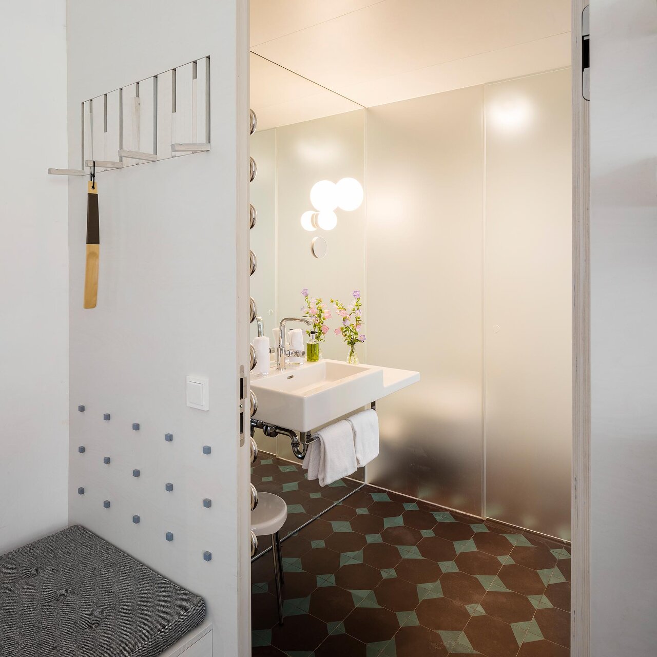Die Einheiten für Körperkultur in der Box, also Bad und WC, ermöglichen Ausblicke zu den prachtvollen Deckenstukkaturen aus der Zeit der Fürsterzbischöfe.
