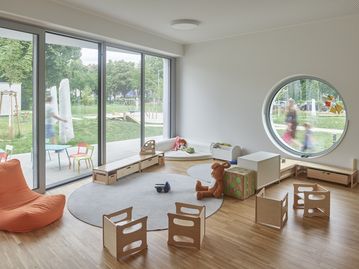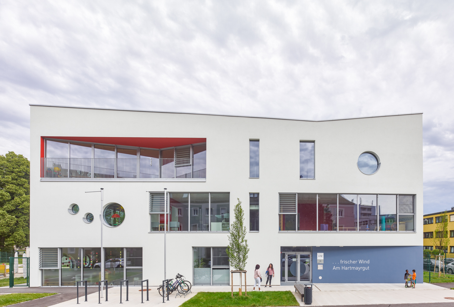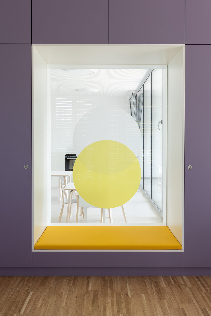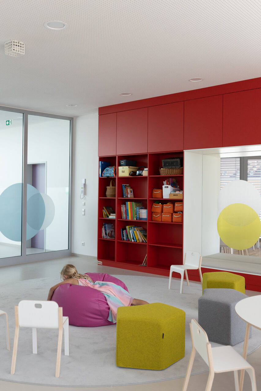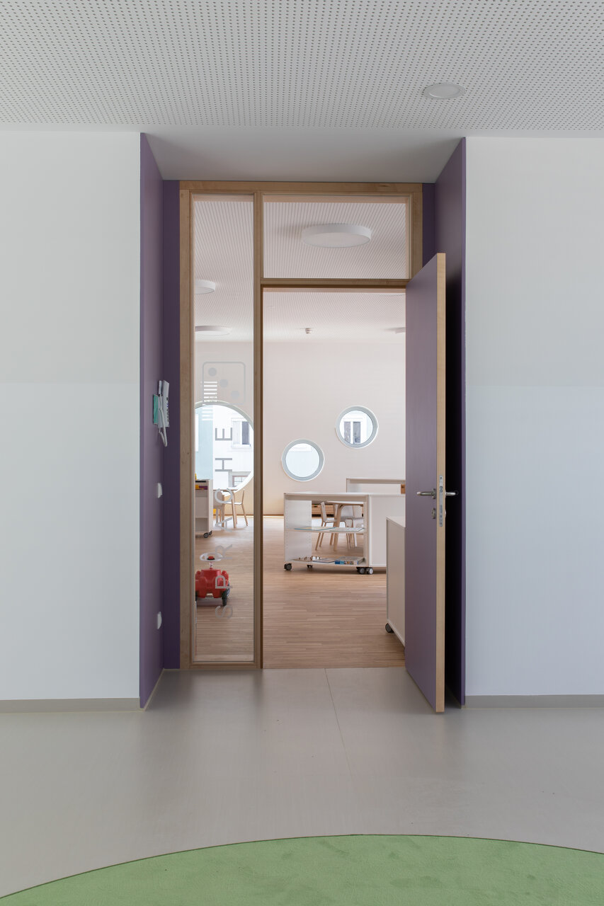 Die Gebäudetypologie ermöglichte die Reduktion reiner Gangzonen auf ein Minimum. Durchblicke und Ausblicke – und damit Orientierung – sind dank der Struktur im gesamten Gebäude gewährleistet. Architektonisch bestimmt wird der dreigeschoßige, punktförmige Baukörper auch durch die gegeneinander geneigten, begrünten Dachflächen und die Überhöhung der obersten Geschoßdecke. Farben unterscheiden und akzentuieren die einzelnen Funktionen (Krabbelgruppe, Kindergartengruppe, Bewegungsraum) sowohl innen als auch außen an den Fassaden. (Text: Architektinnen, bearbeitet)
