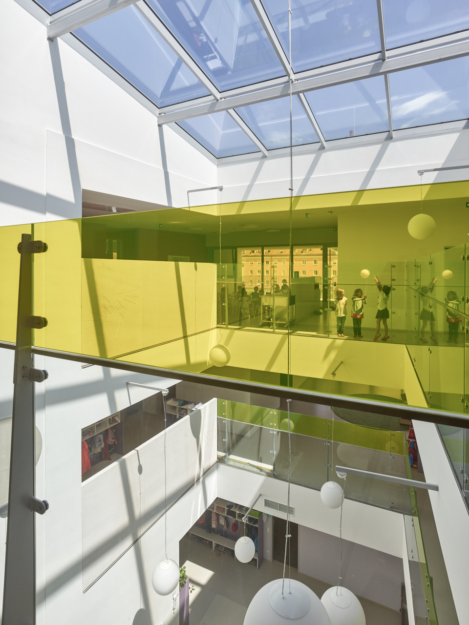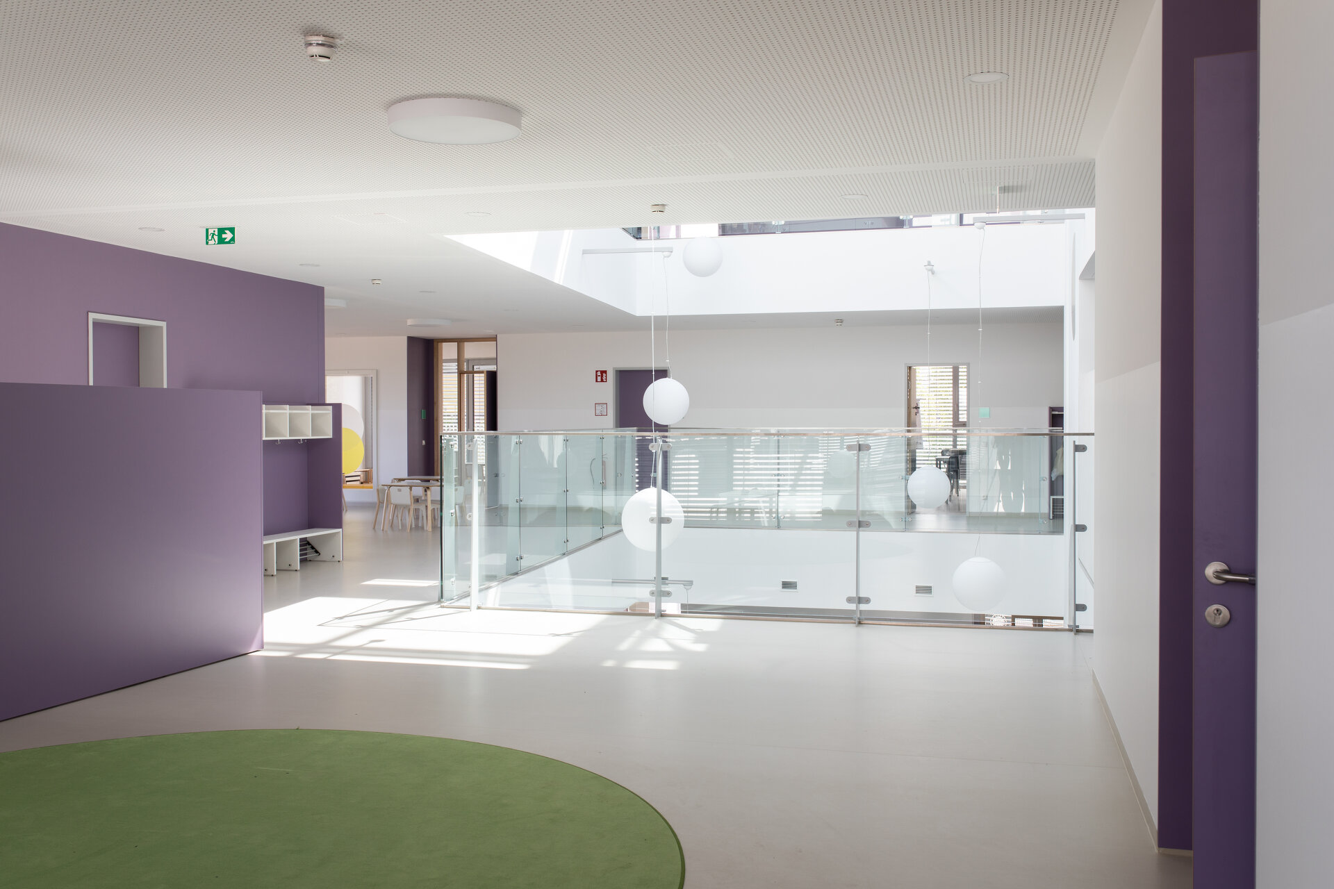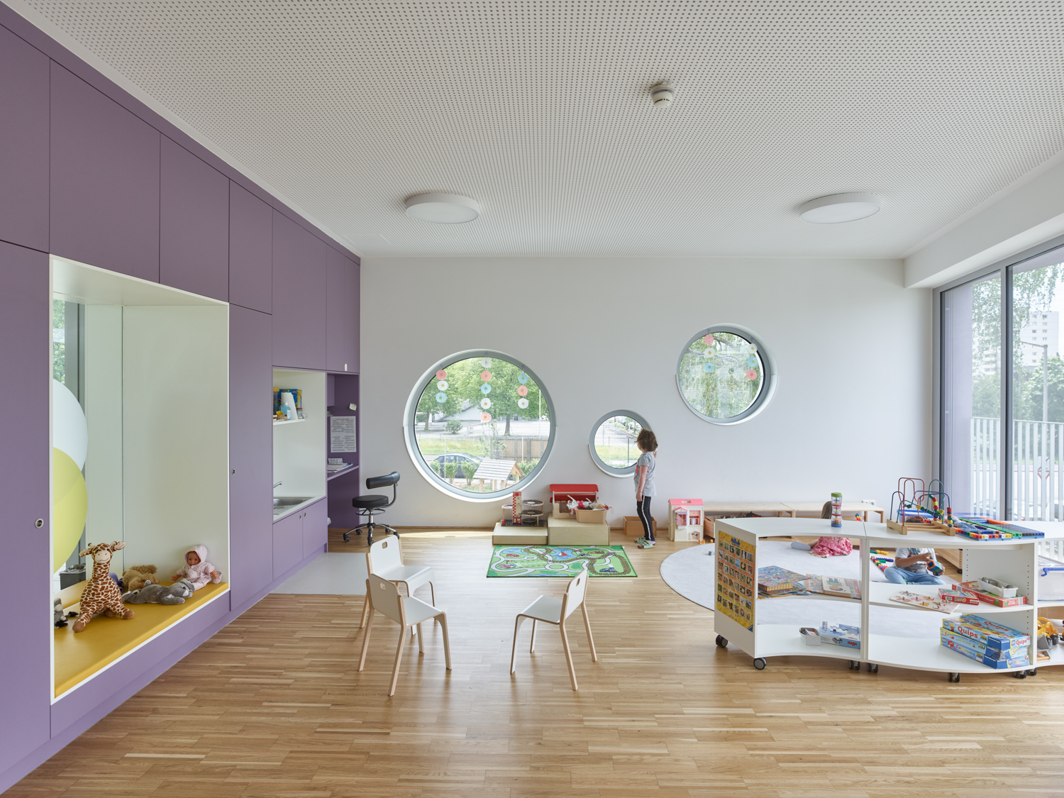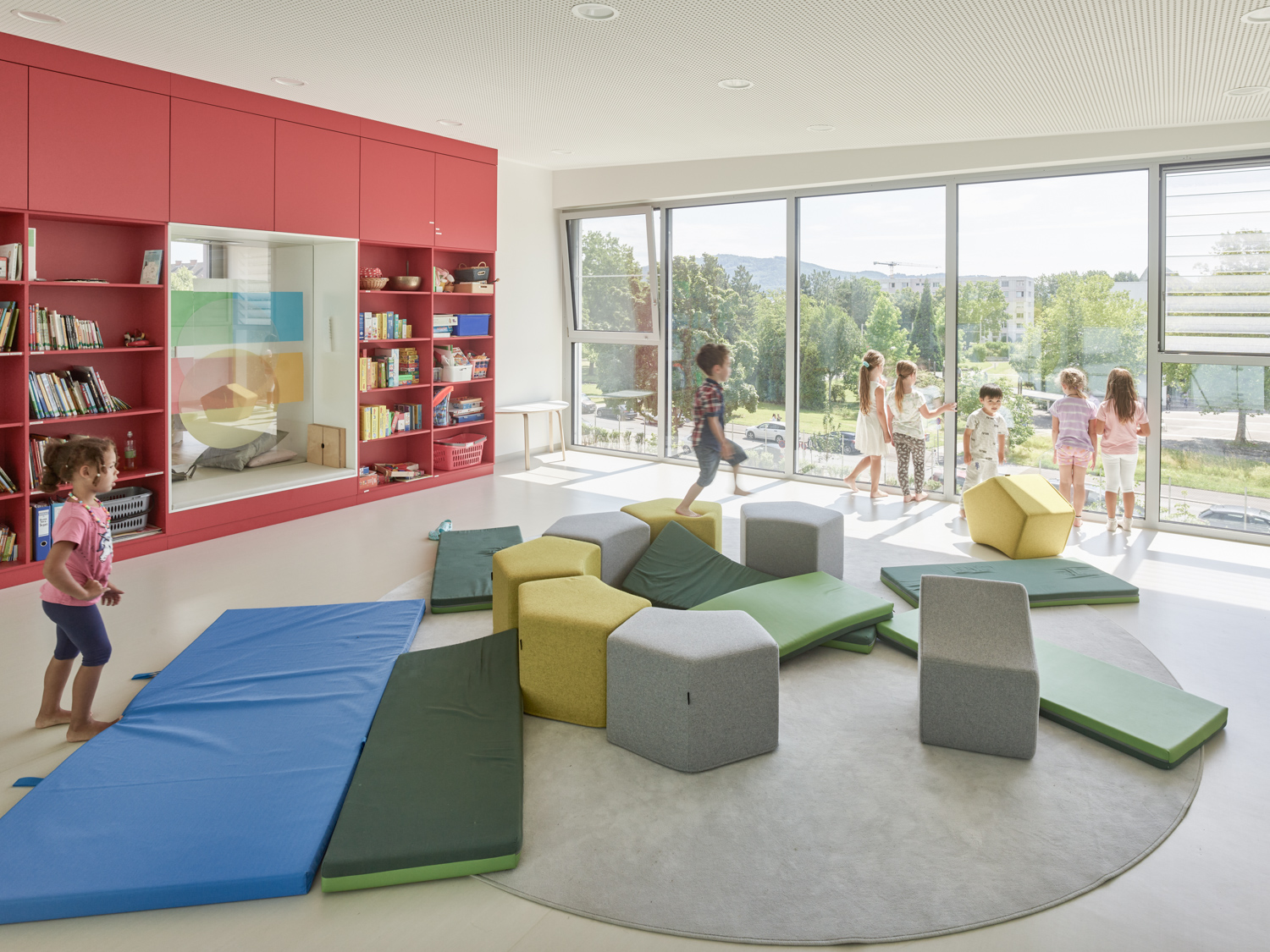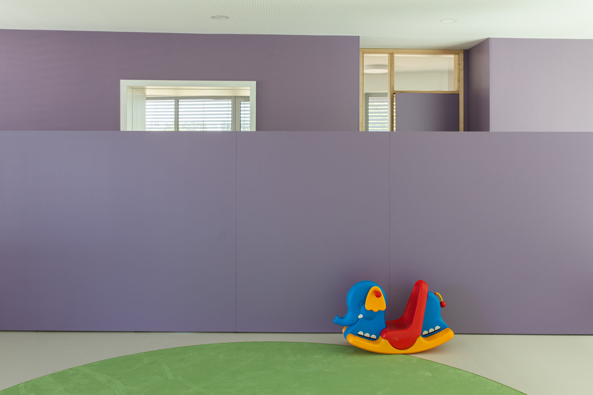 Die Gebäudetypologie ermöglichte die Reduktion reiner Gangzonen auf ein Minimum. Durchblicke und Ausblicke – und damit Orientierung – sind dank der Struktur im gesamten Gebäude gewährleistet. Architektonisch bestimmt wird der dreigeschoßige, punktförmige Baukörper auch durch die gegeneinander geneigten, begrünten Dachflächen und die Überhöhung der obersten Geschoßdecke. Farben unterscheiden und akzentuieren die einzelnen Funktionen (Krabbelgruppe, Kindergartengruppe, Bewegungsraum) sowohl innen als auch außen an den Fassaden. (Text: Architektinnen, bearbeitet)