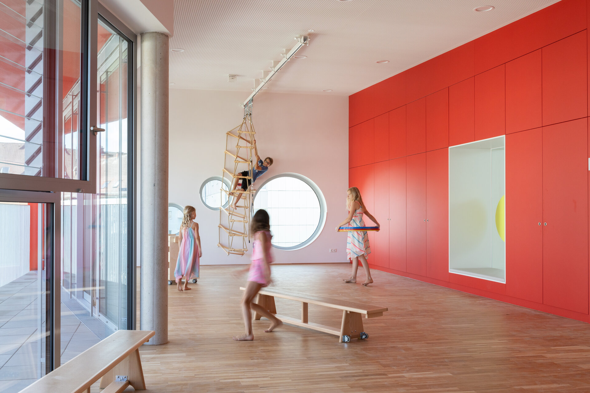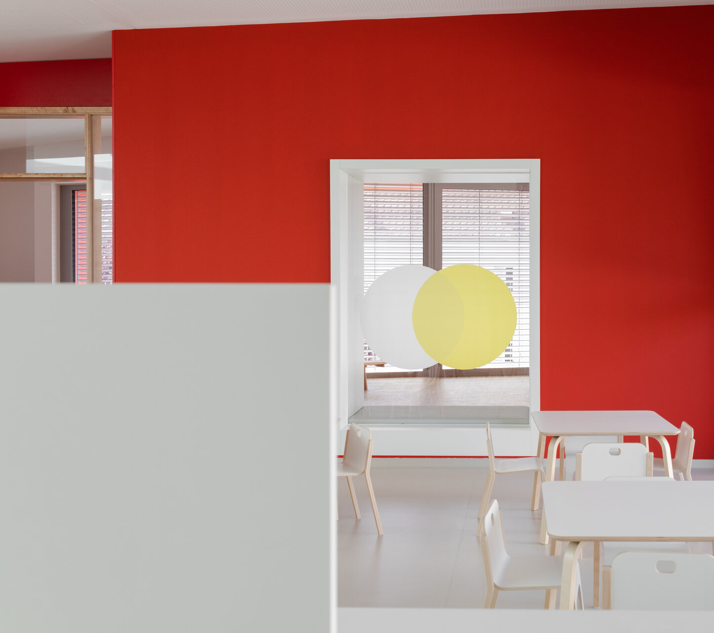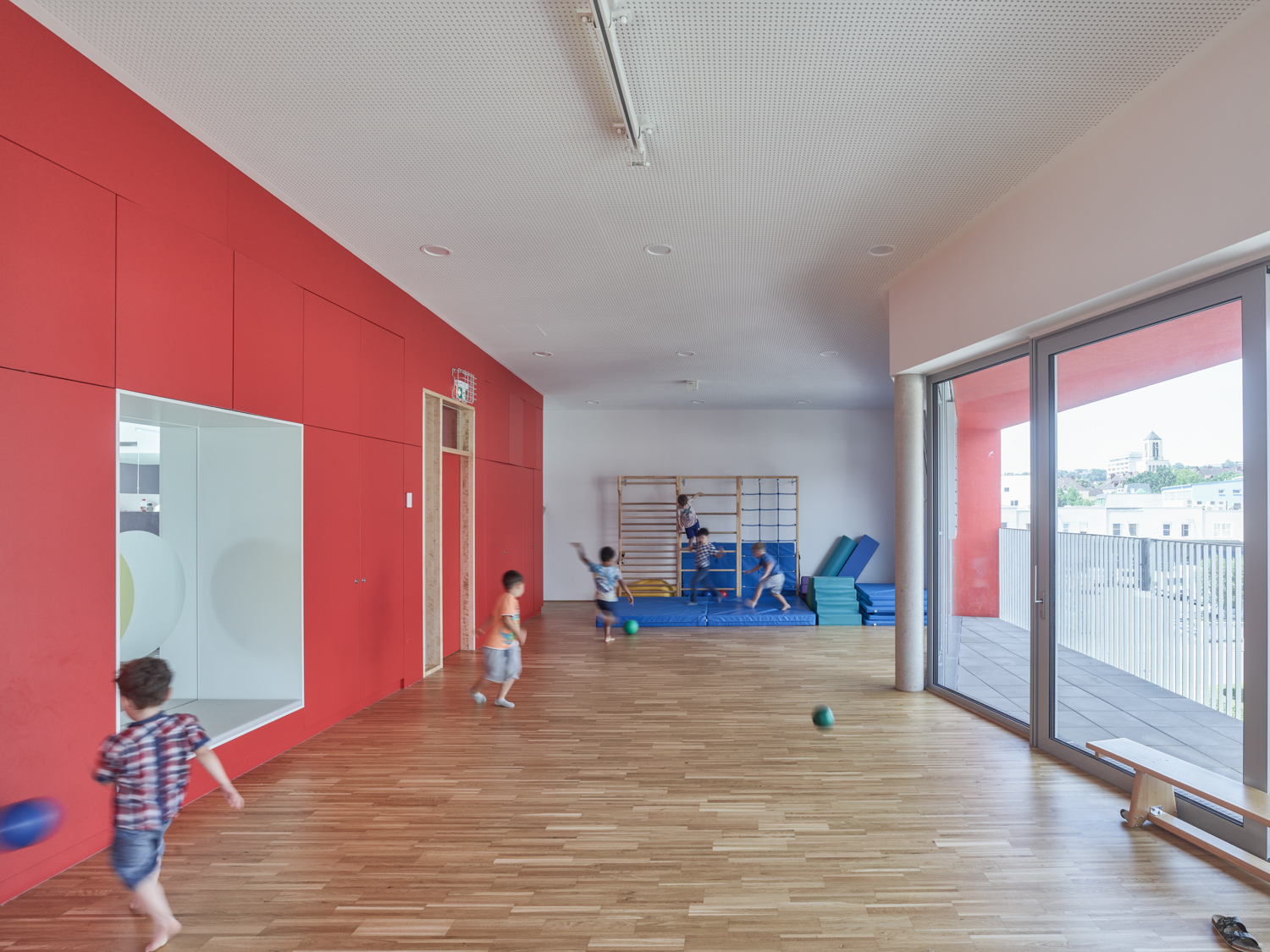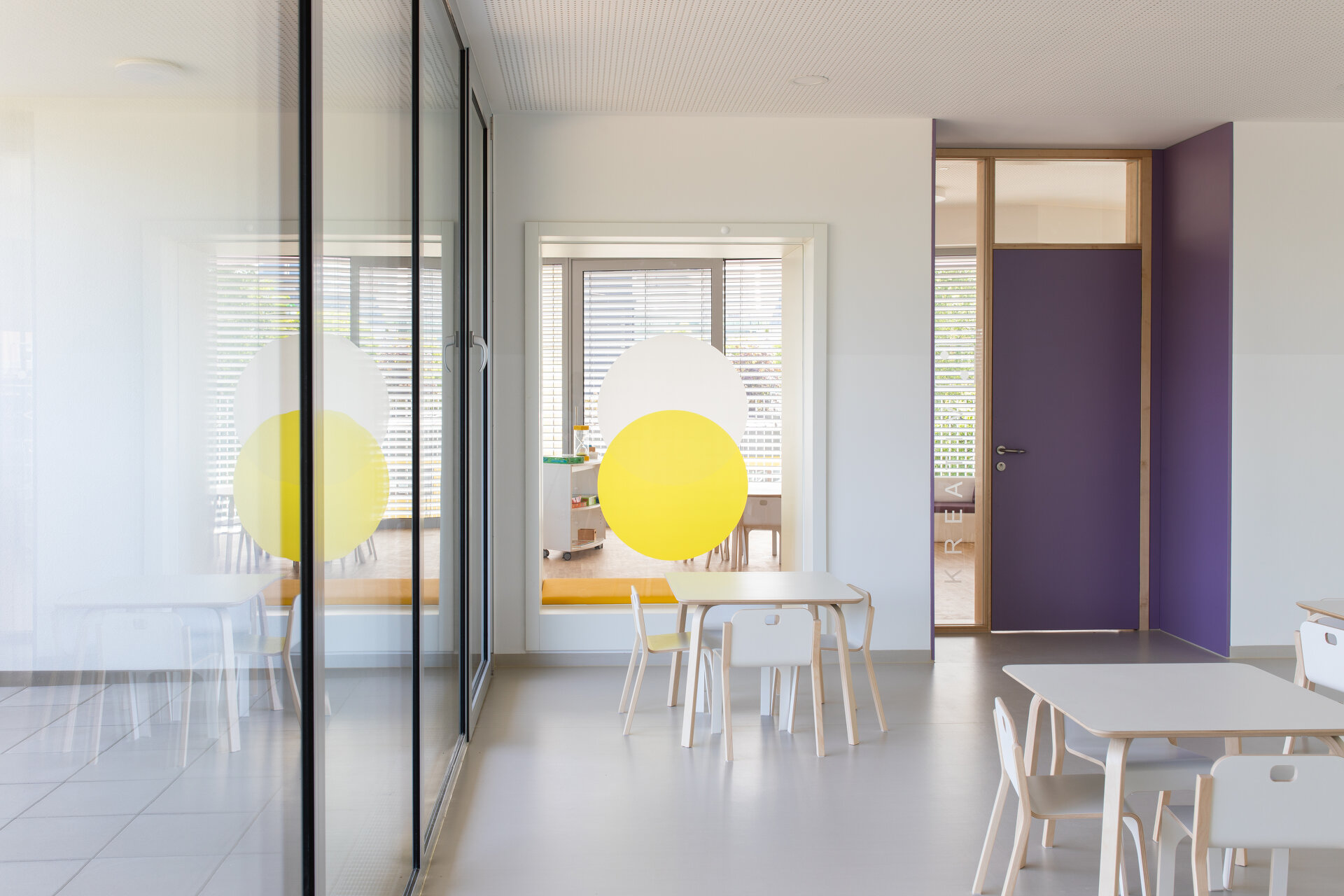 Die Gebäudetypologie ermöglichte die Reduktion reiner Gangzonen auf ein Minimum. Durchblicke und Ausblicke – und damit Orientierung – sind dank der Struktur im gesamten Gebäude gewährleistet. Architektonisch bestimmt wird der dreigeschoßige, punktförmige Baukörper auch durch die gegeneinander geneigten, begrünten Dachflächen und die Überhöhung der obersten Geschoßdecke. Farben unterscheiden und akzentuieren die einzelnen Funktionen (Krabbelgruppe, Kindergartengruppe, Bewegungsraum) sowohl innen als auch außen an den Fassaden. (Text: Architektinnen, bearbeitet)