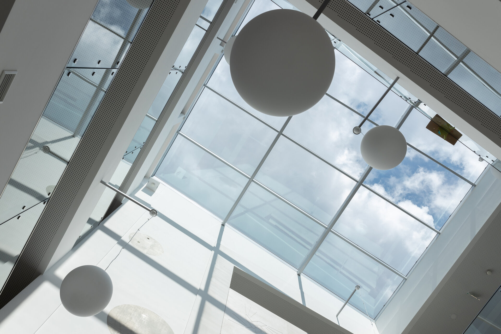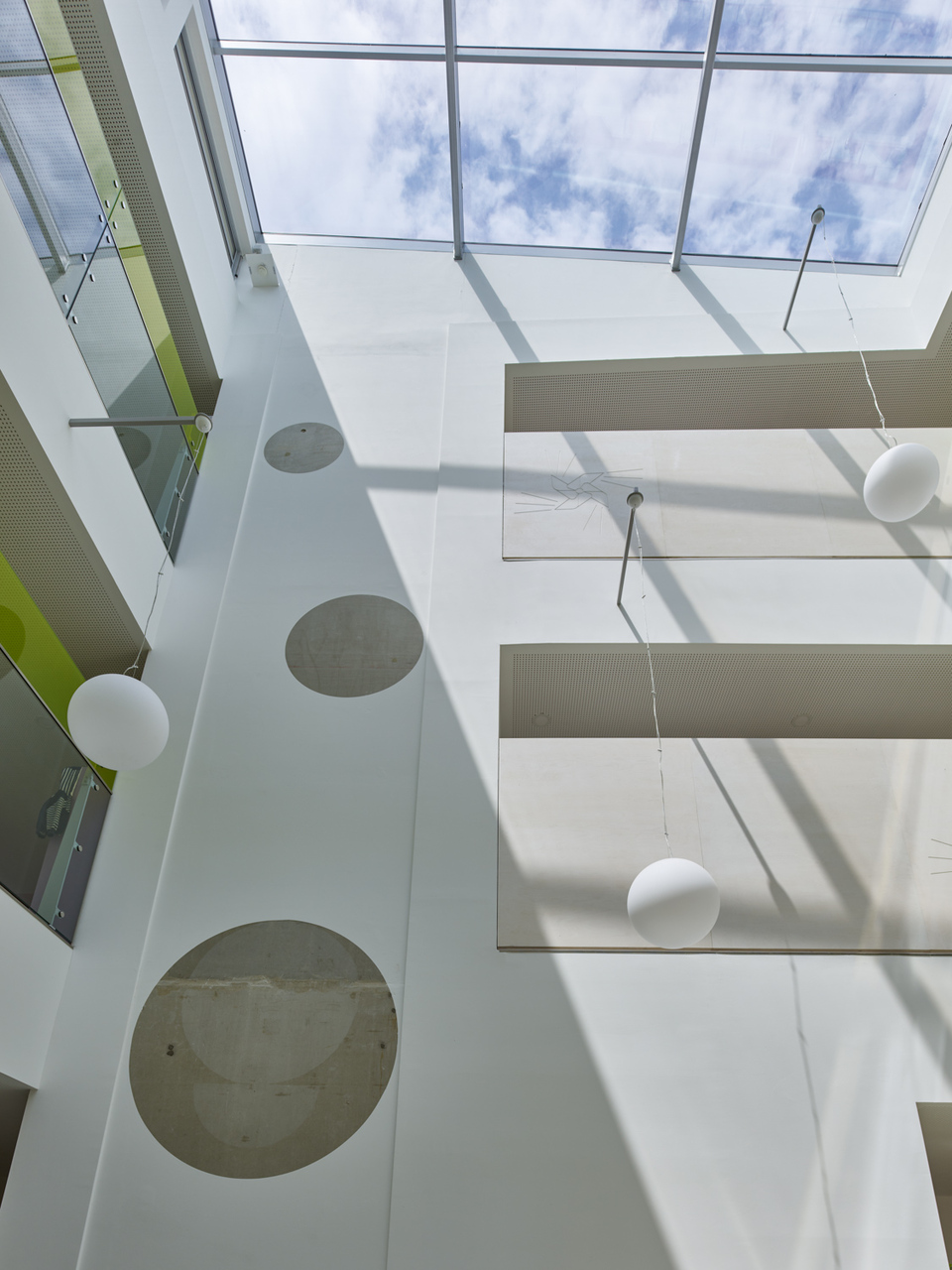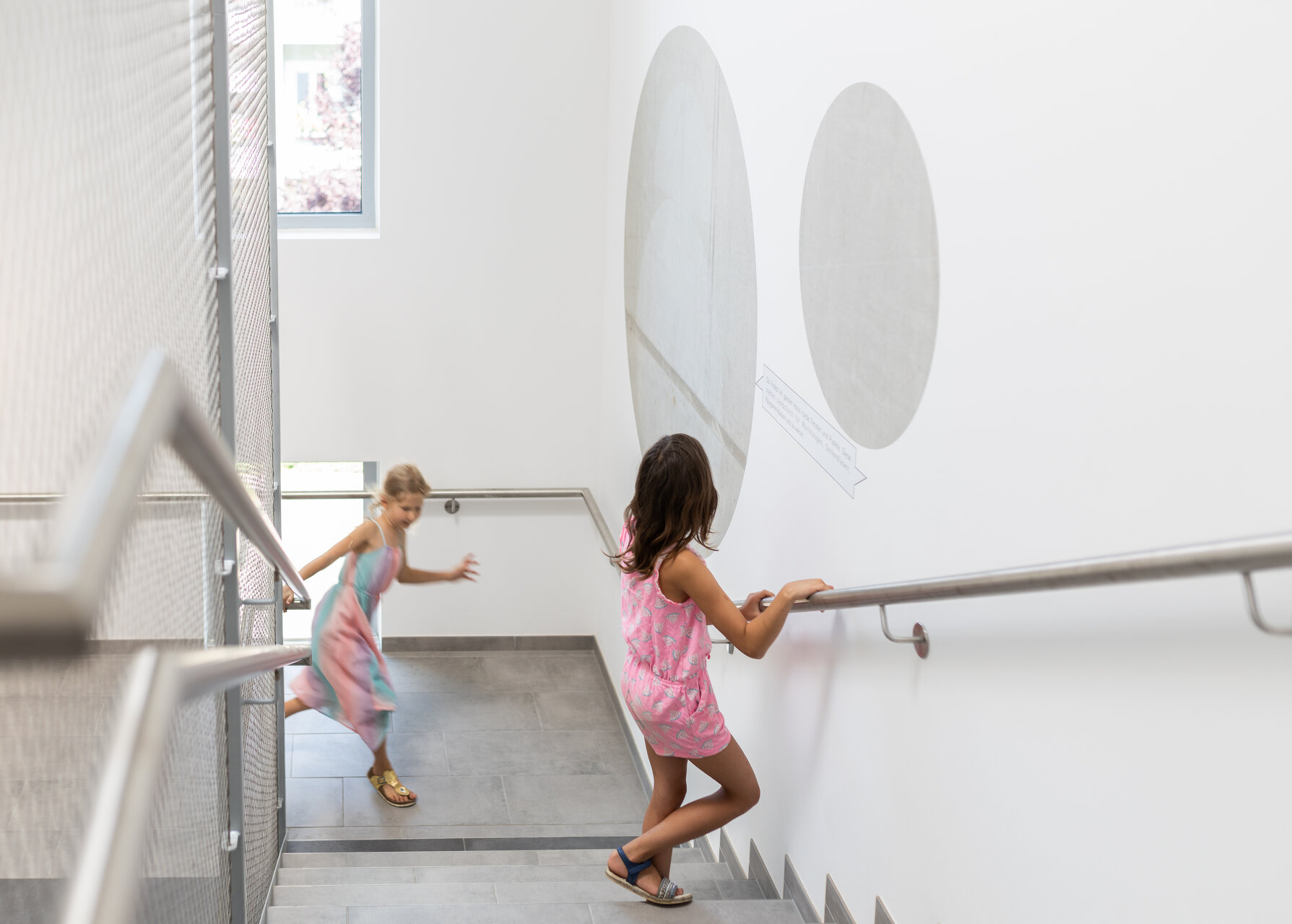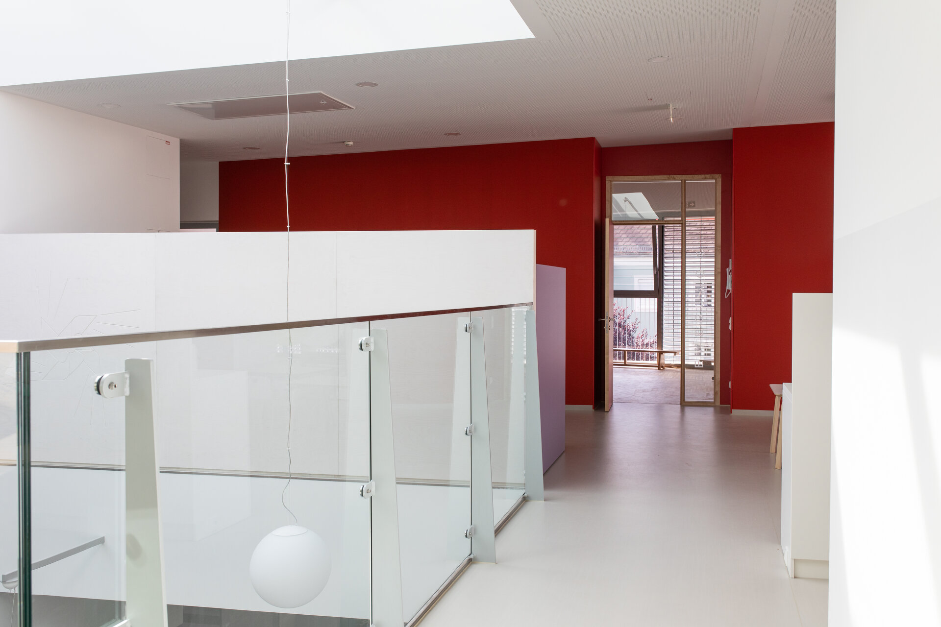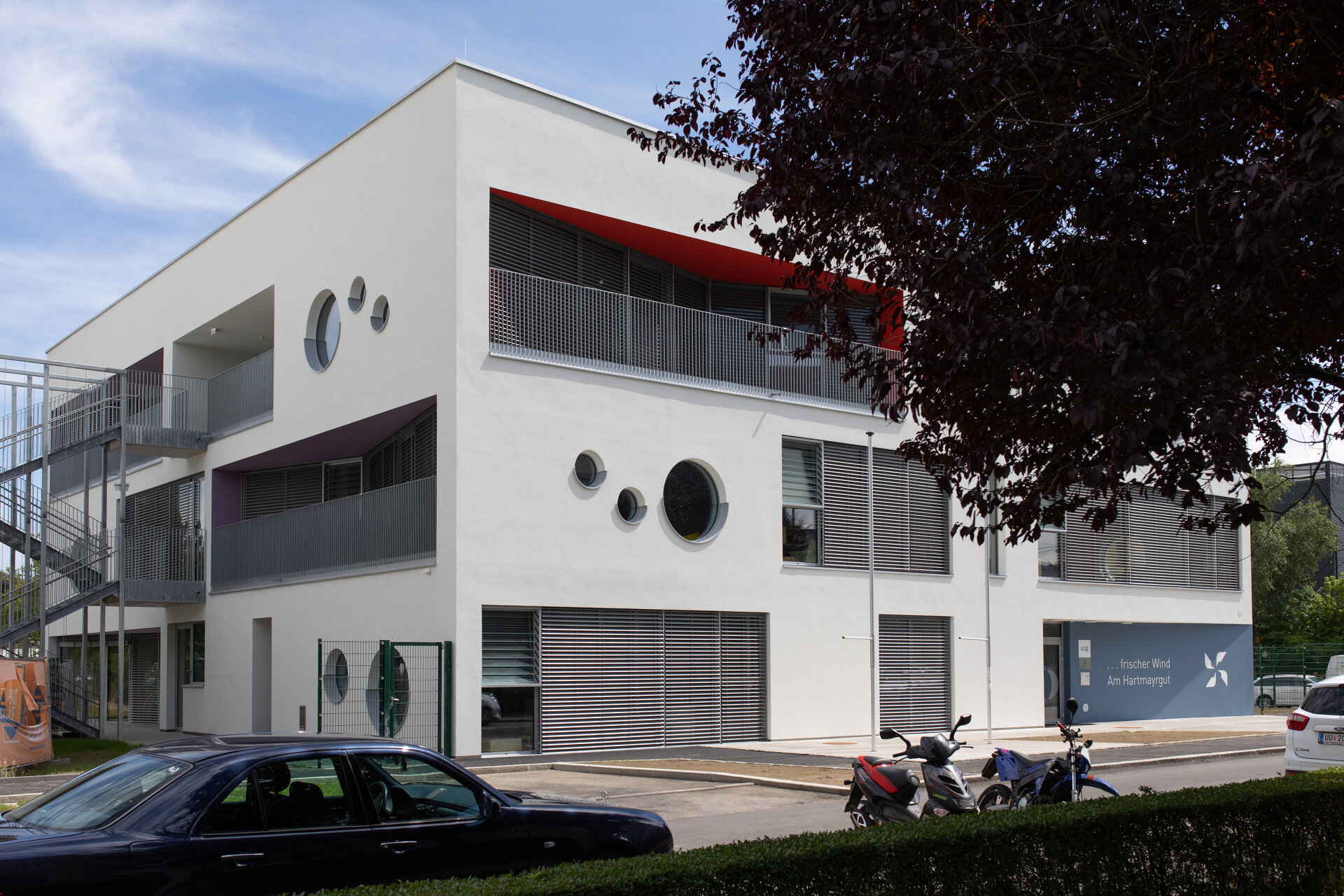 Die Gebäudetypologie ermöglichte die Reduktion reiner Gangzonen auf ein Minimum. Durchblicke und Ausblicke – und damit Orientierung – sind dank der Struktur im gesamten Gebäude gewährleistet. Architektonisch bestimmt wird der dreigeschoßige, punktförmige Baukörper auch durch die gegeneinander geneigten, begrünten Dachflächen und die Überhöhung der obersten Geschoßdecke. Farben unterscheiden und akzentuieren die einzelnen Funktionen (Krabbelgruppe, Kindergartengruppe, Bewegungsraum) sowohl innen als auch außen an den Fassaden. (Text: Architektinnen, bearbeitet)