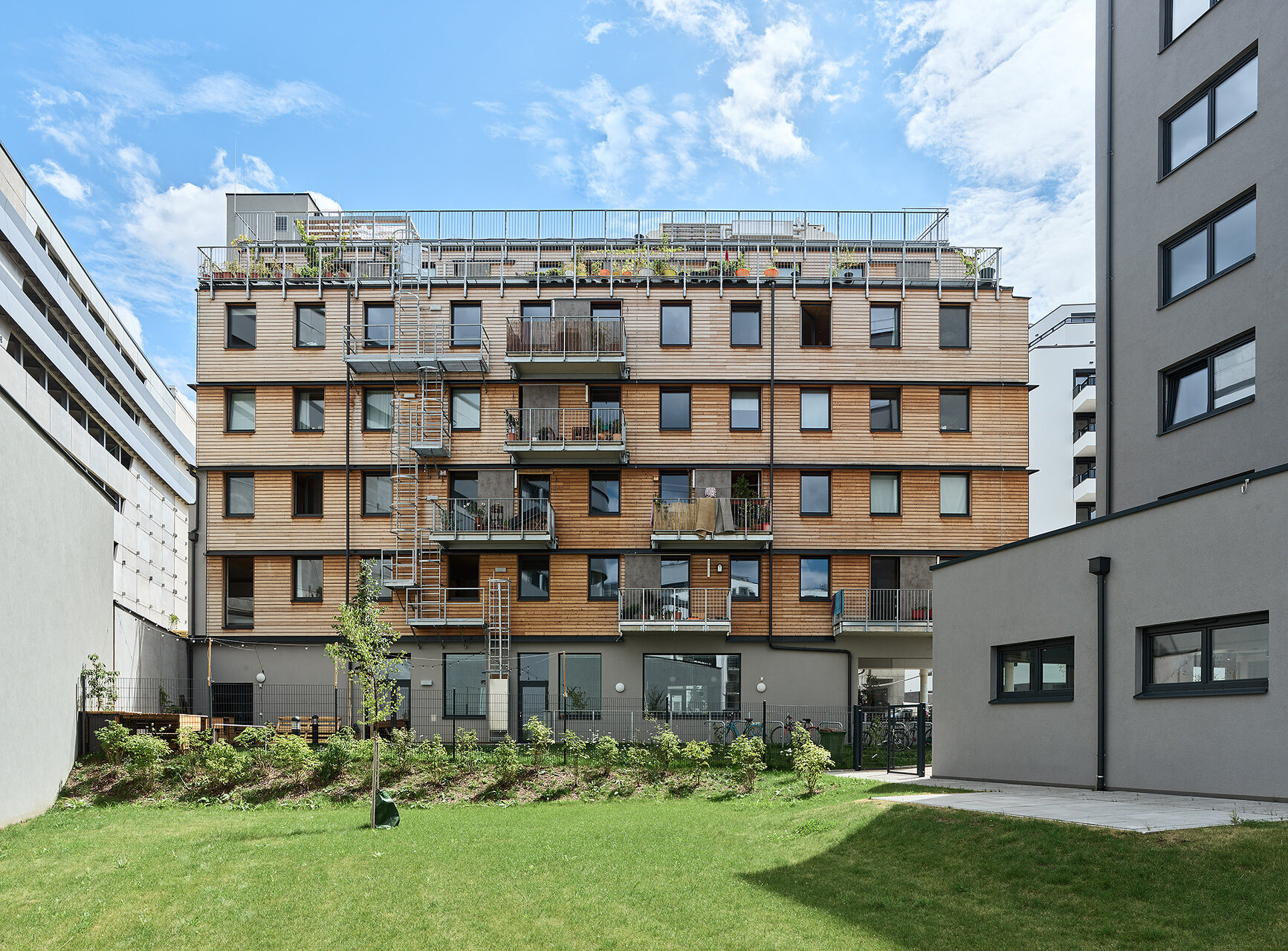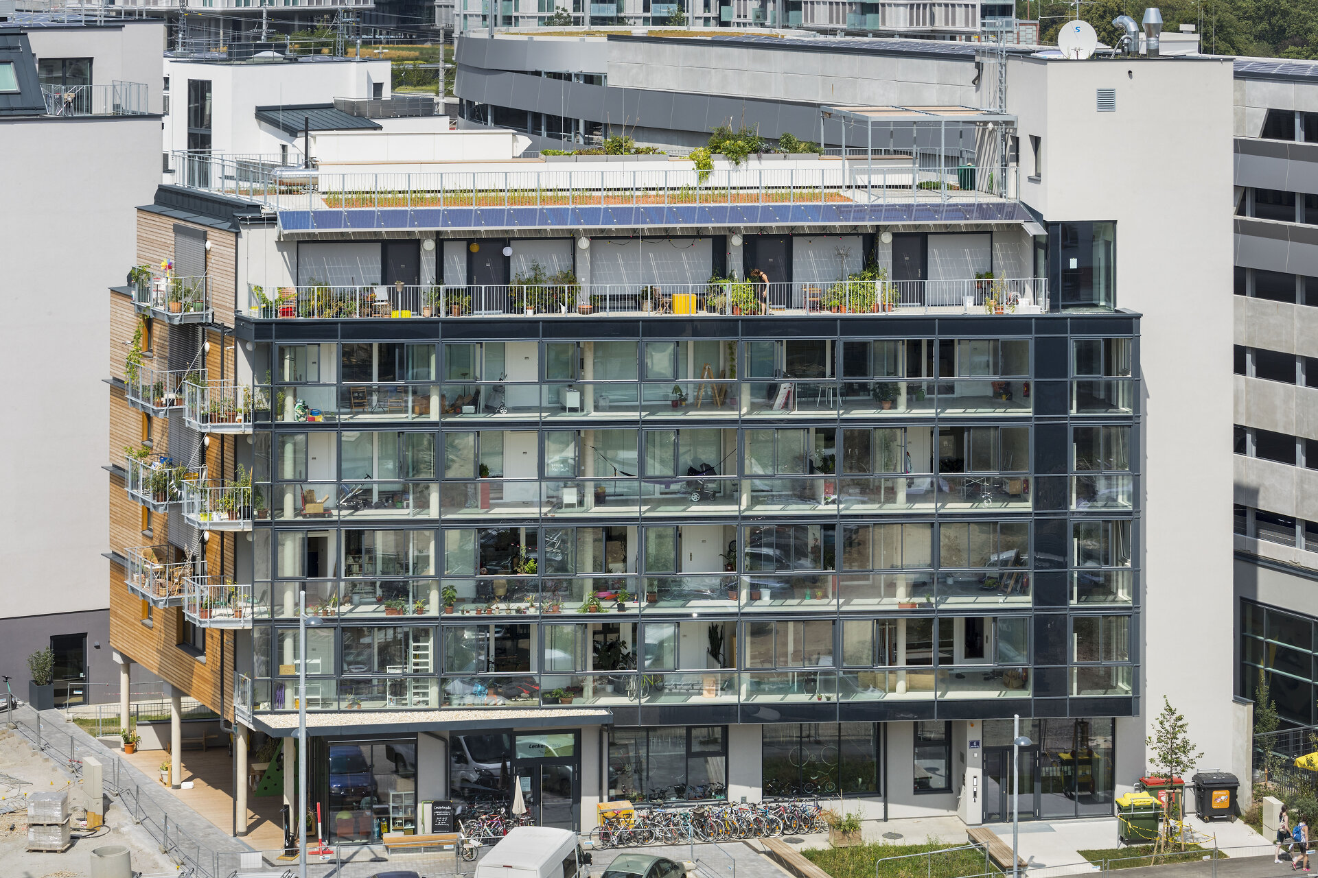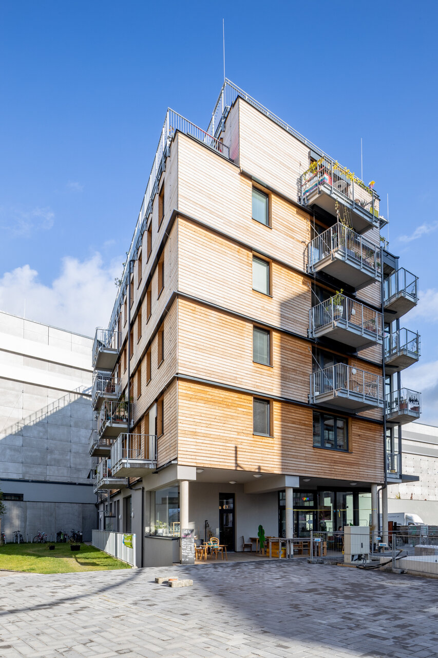 Die Fahrradwerkstatt, ein Café und ein 75m2 großer Gemeinschaftsraum, die flexibel kombiniert werden können, machen das knapp vier Meter hohe Erdgeschoß zu einer halböffentlichen Zone der Kommunikation. Sie geht im Außenraum in eine überdachte Terrasse und in einen kleinen öffentlichen Platz über und an der vom Stadtraum abgewandten Seite in eine Grünfläche für die Hausgemeinschaft. Die Hausverwaltung obliegt der Baugruppe. (Text: Maria Welzig auf Basis von Texten des Architekturbüros und der Baugruppe)