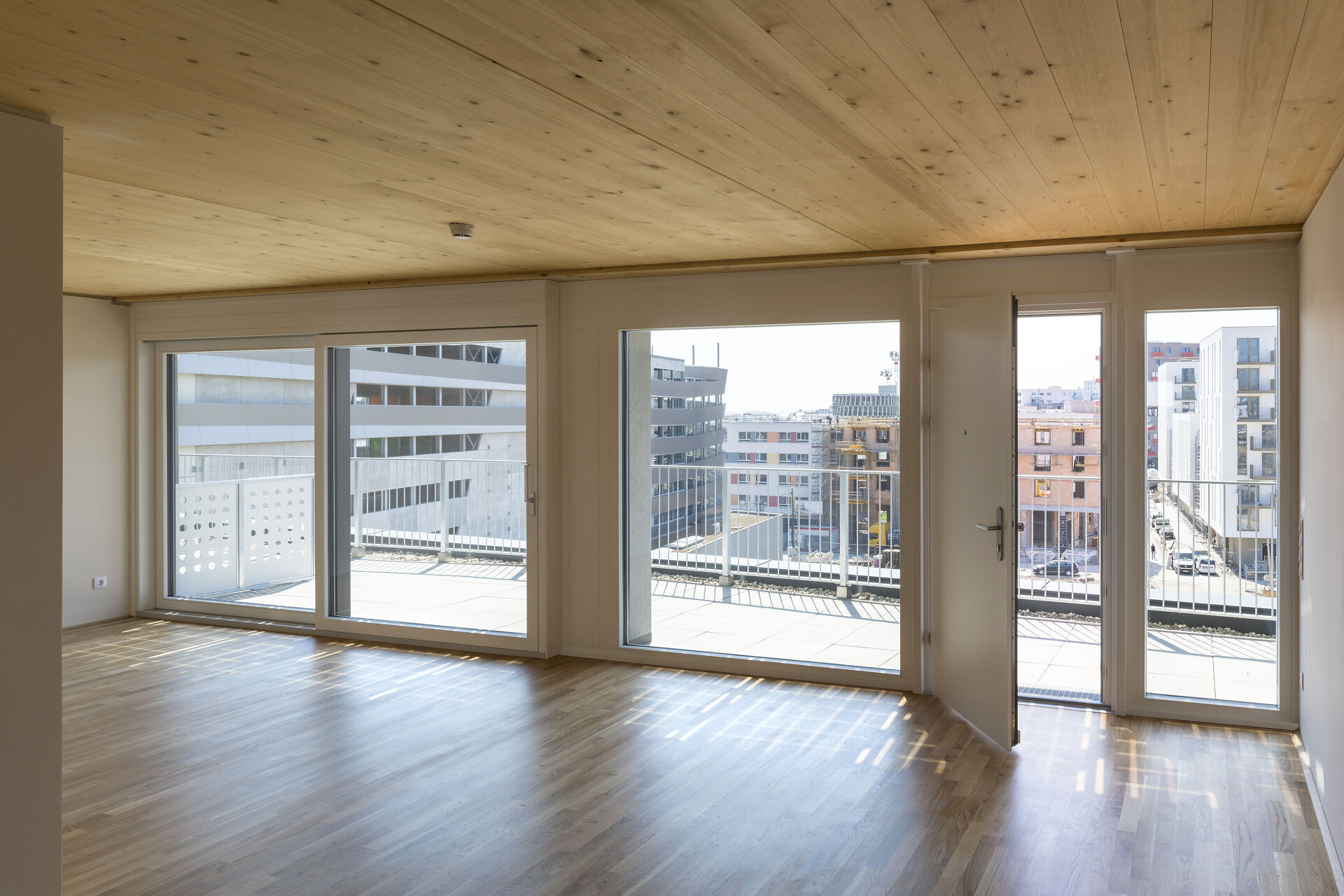 Die akustische und thermische Trennung zwischen Wintergarten und Wohnungen erfolgt über einen Isokorb. Um die Demontage zu ermöglichen, besteht die horizontale akustische Trennung der Holzdecken aus einer Schüttung, ohne Aufbeton. Auf dem Dach befinden sich eine Photovoltaik-Anlage und ein gemeinschaftlich genutzter Dachgarten.