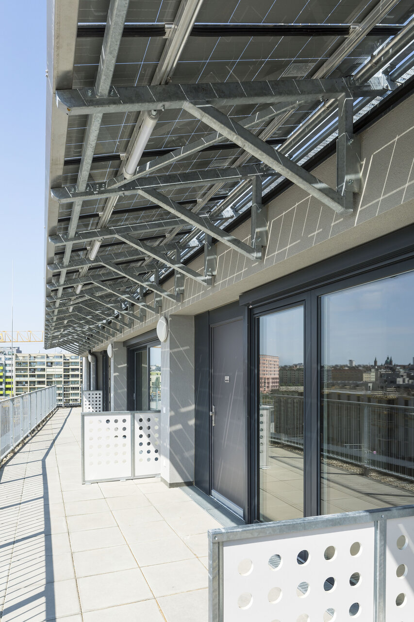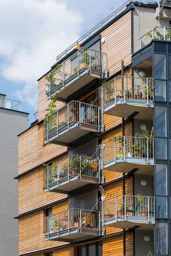 Das Architekturbüro Reinberg hat den Wohnbau auf bewährte Weise als Passivhaus konzipiert. Seine konstruktiven Betonteile – Sockel und Erschließung – fungieren als Speichermasse. Der fünfgeschossige Wohnteil ist konstruktiv vollständig aus Holz gebaut, mit Holzständerwänden und sichtbaren Brettsperrholzdecken. Die Holzkonstruktion ist auf das betonierte Erdgeschoß aufgesetzt und zur Aussteifung an die Betonkonstruktion der Laubengänge angehängt.