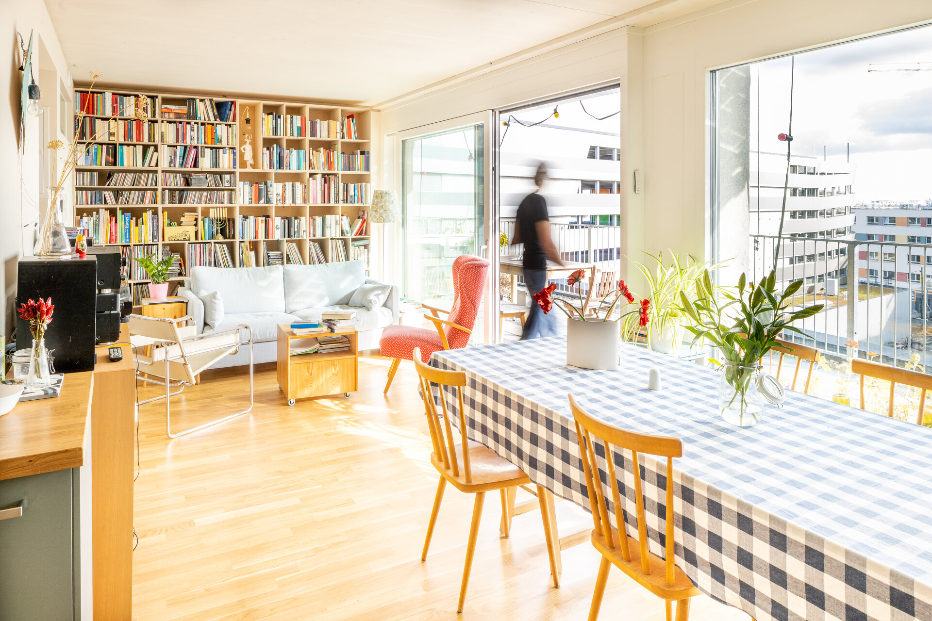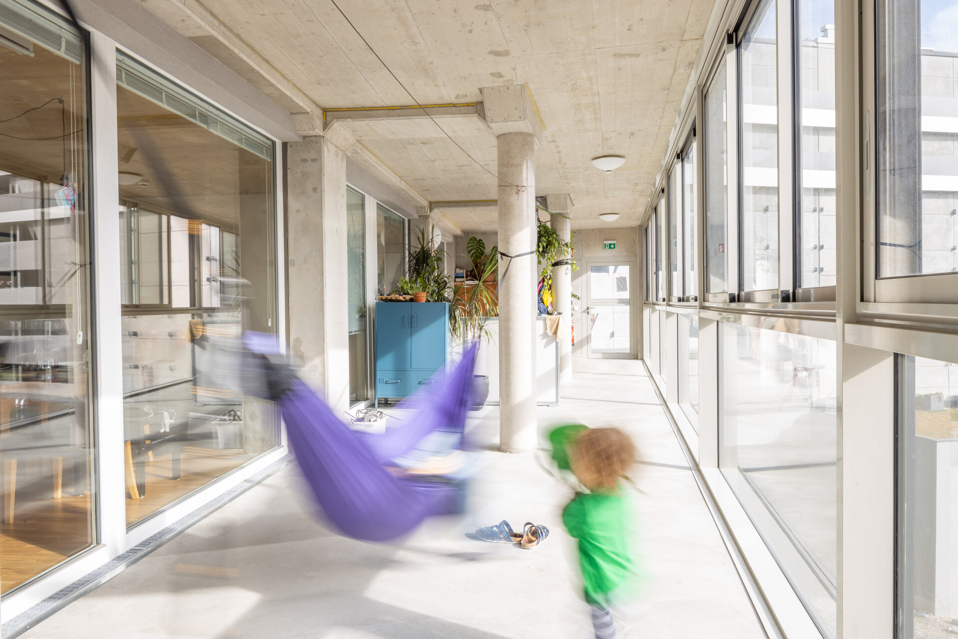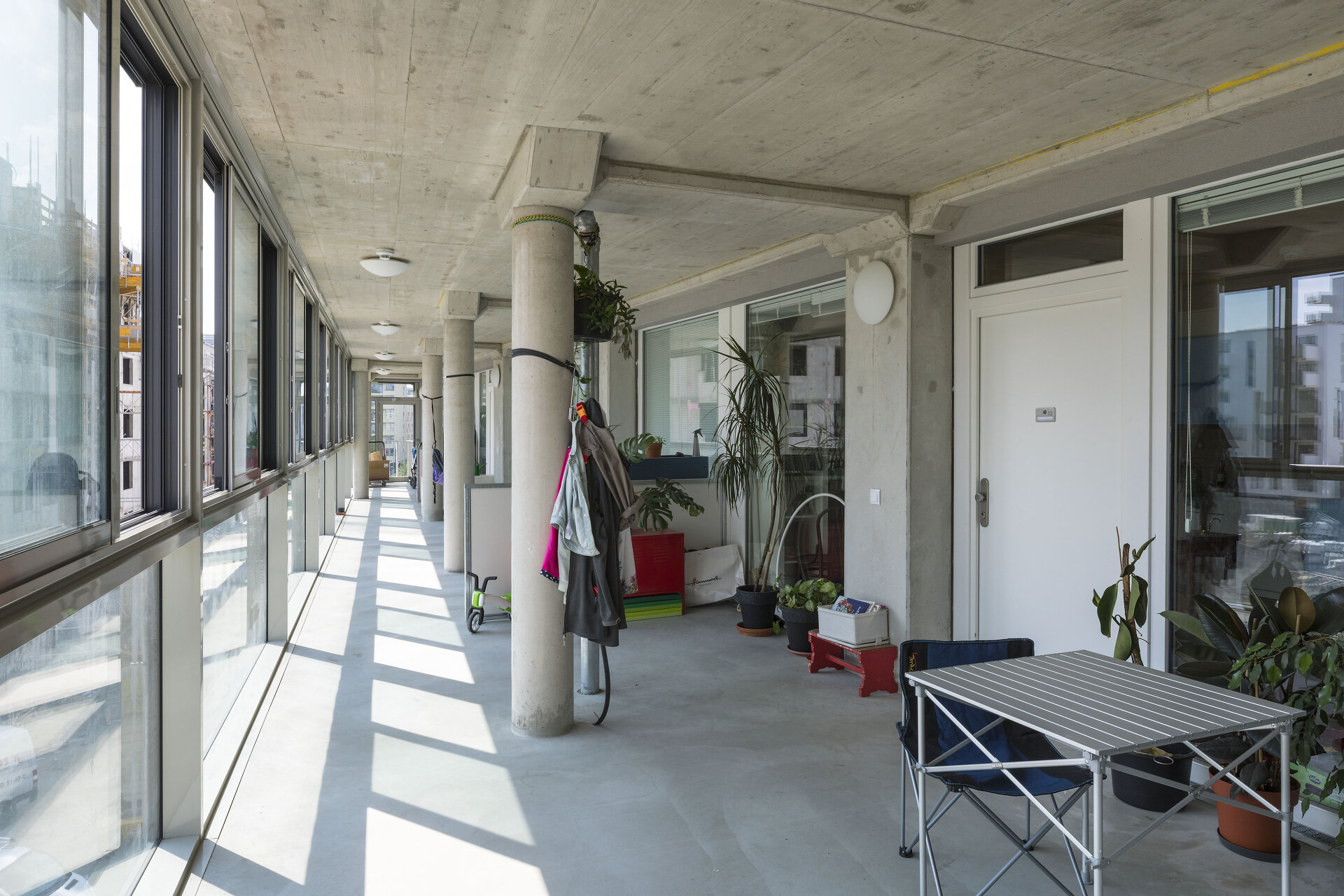 Die südseitigen Laubengänge im Wintergarten bilden gleichzeitig halbprivate Loggien für jede Wohnung. Zu den Laubengängen orientieren sich auch die Wohnräume mit ihren großen Verglasungen. Dem Geist einer Baugruppe folgend fungiert der gesamte Wintergarten als Begegnungszone. Zusätzlich verfügen die Wohnungen über einen privaten Balkon.