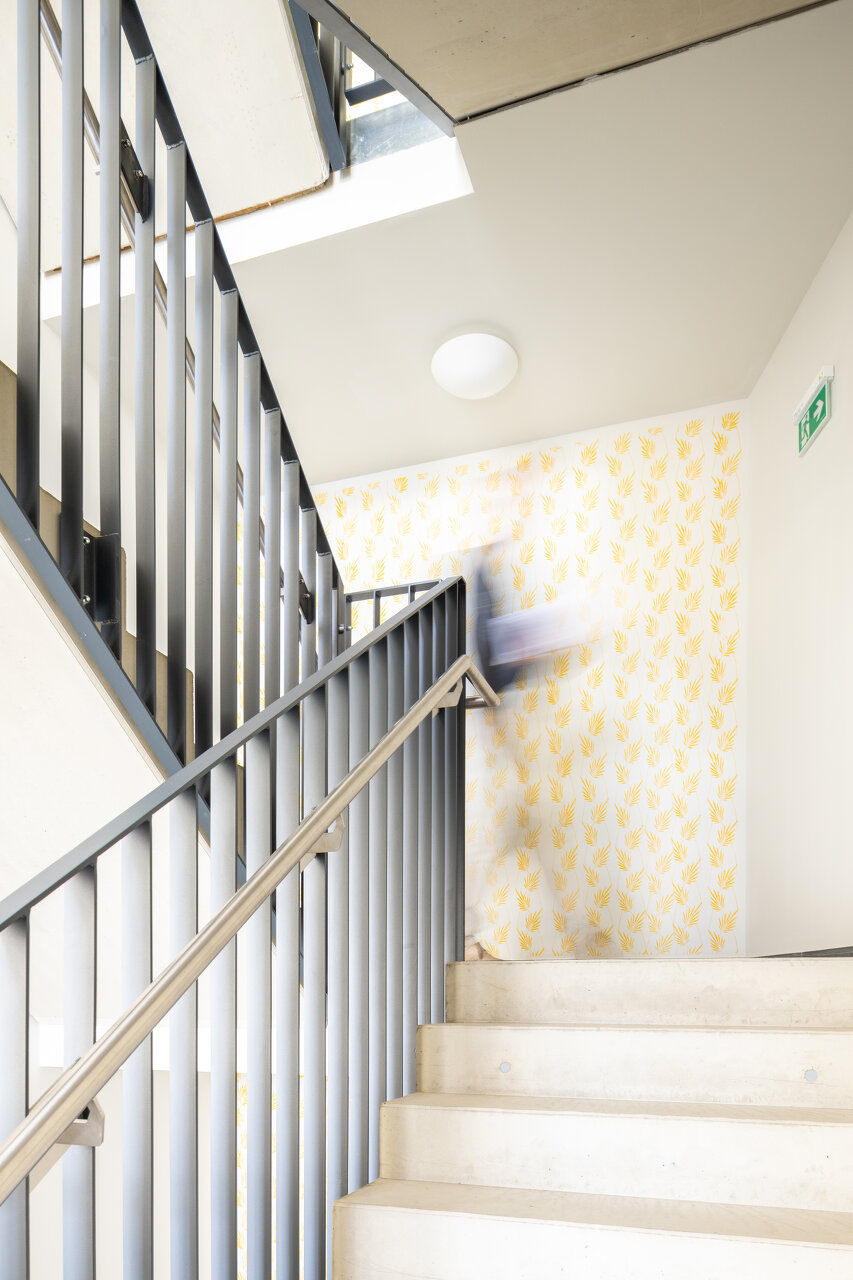 Vier Regelgeschosse und ein entlang der Nordseite terrassiertes fünftes Obergeschoß nehmen insgesamt 18 Wohnungen auf, davon ist eine für (Flüchtlings-)WG-Zwecke gewidmet.