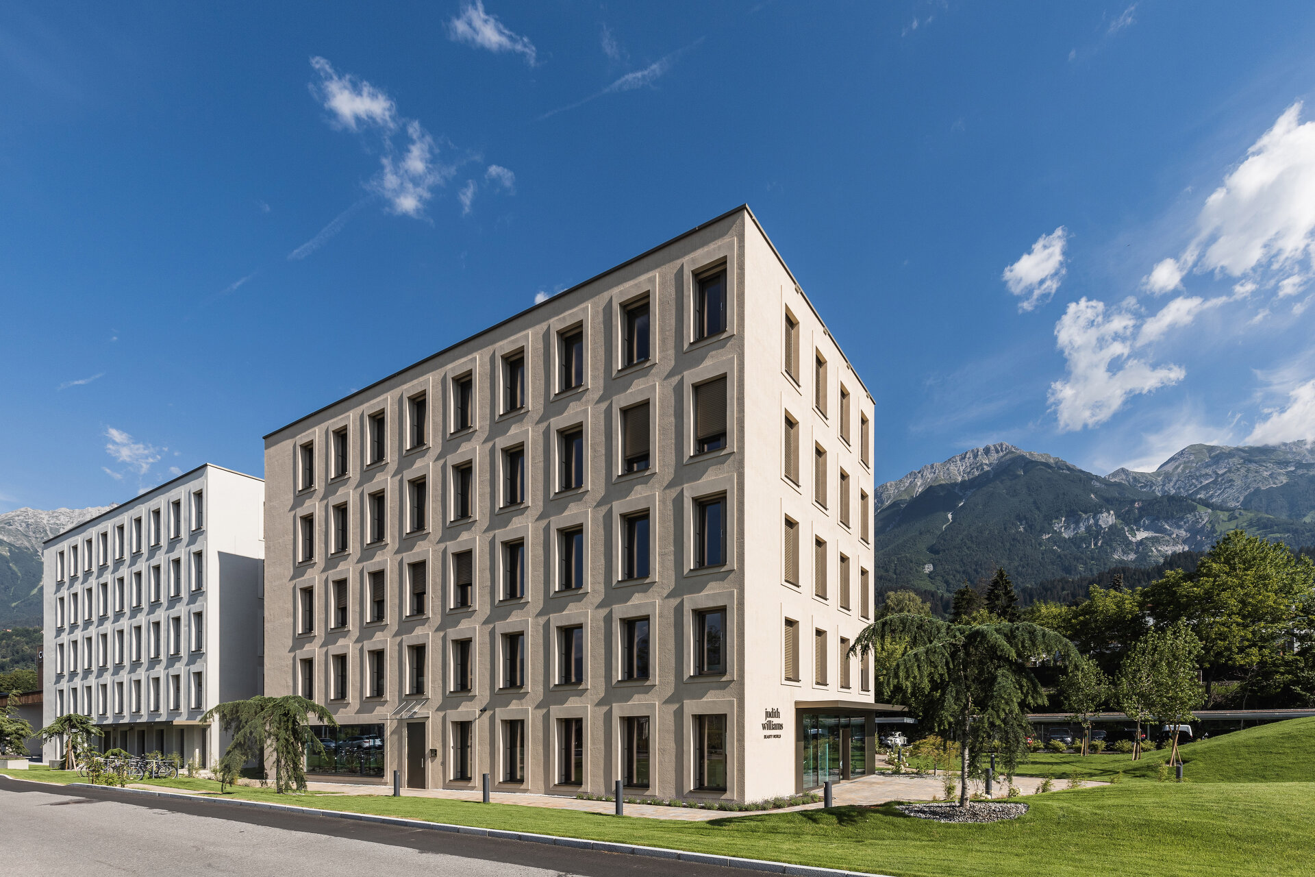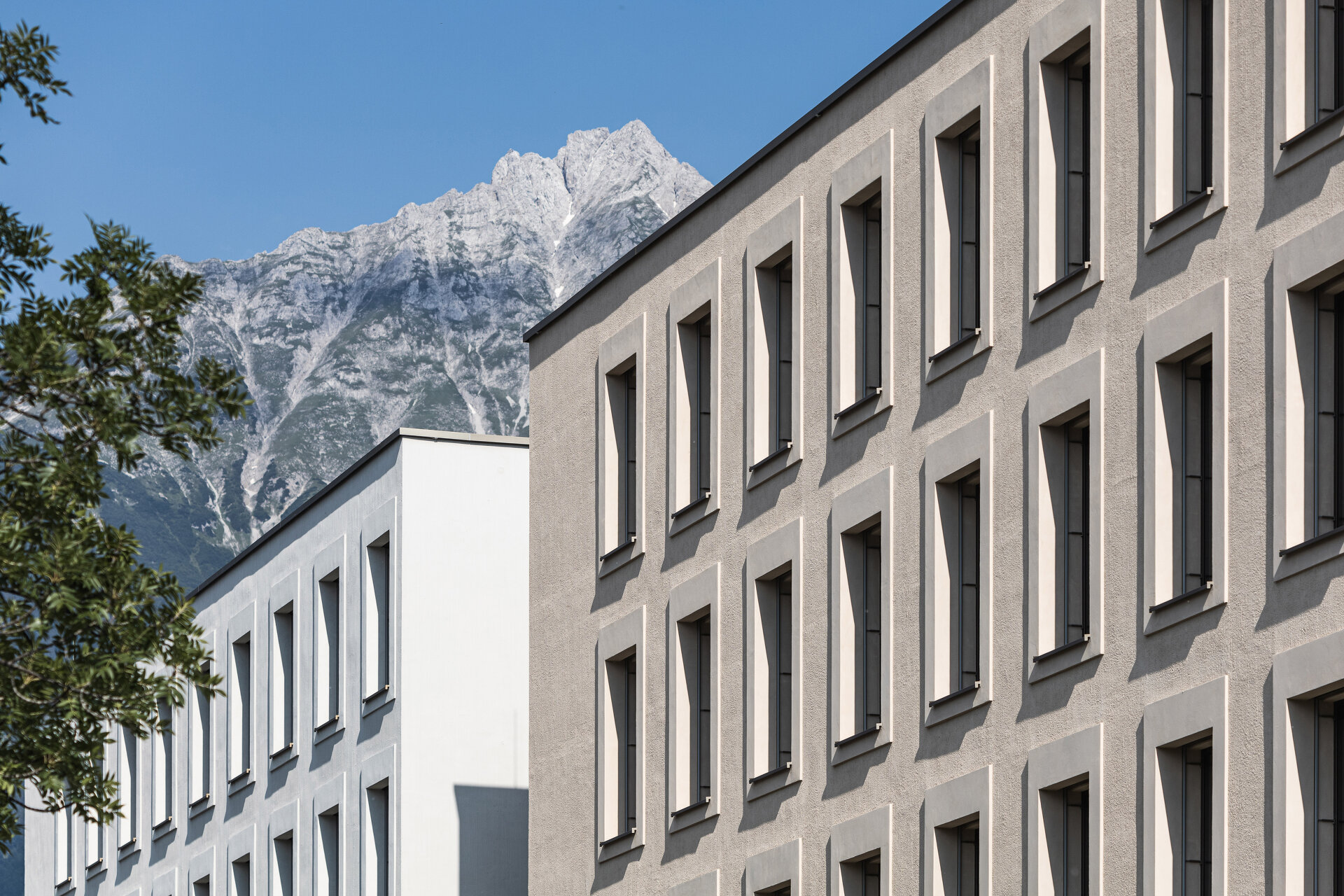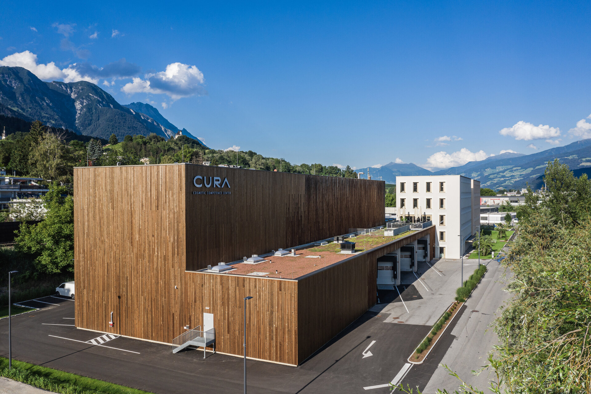 Ziel der Entwurfsüberlegungen war es, die für Gewerbegebiete übliche Formensprache aufzubrechen und eine Antithese zu den anonymen Flachbauten des ungeordneten Gewerbegebietes Mühlau-Arzl zu setzen. Die beiden fünfgeschoßigen Bürohäuser mit ihren weiß bzw. grau verputzten Ziegelwänden verstehen sich als moderne Interpretation eines Stadthauses, die Konfektionierungs- und Logistikzentrale wurde als massiver Holzbau mit Lärchenholzfassade ausgeführt. Zwischen die beiden Bürohäuser wurde ein Verbindungsbau eingeschoben, der die Fluchten und die Optik der holzverkleideten Logistikeinheit aufnimmt.