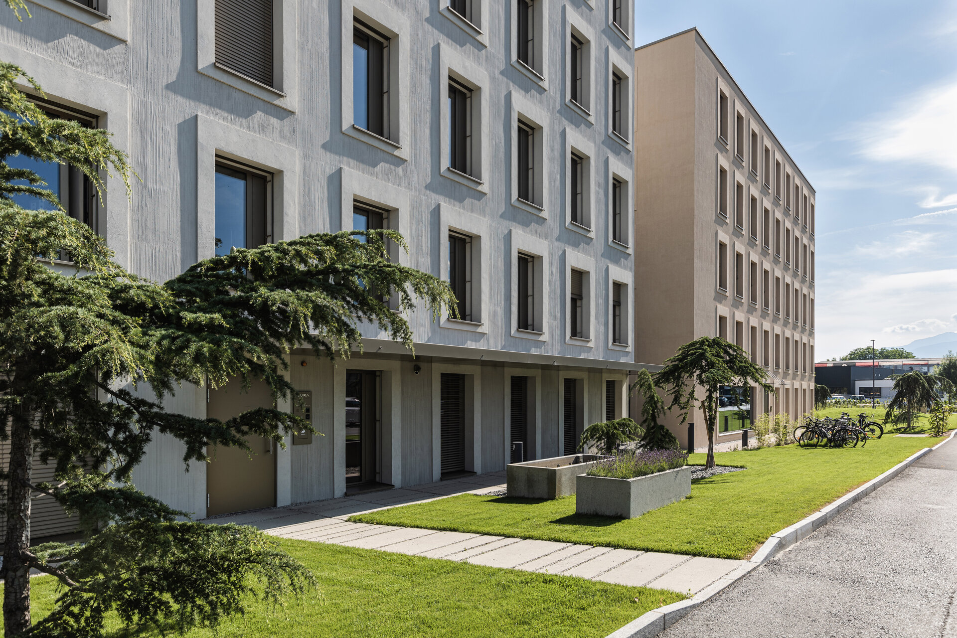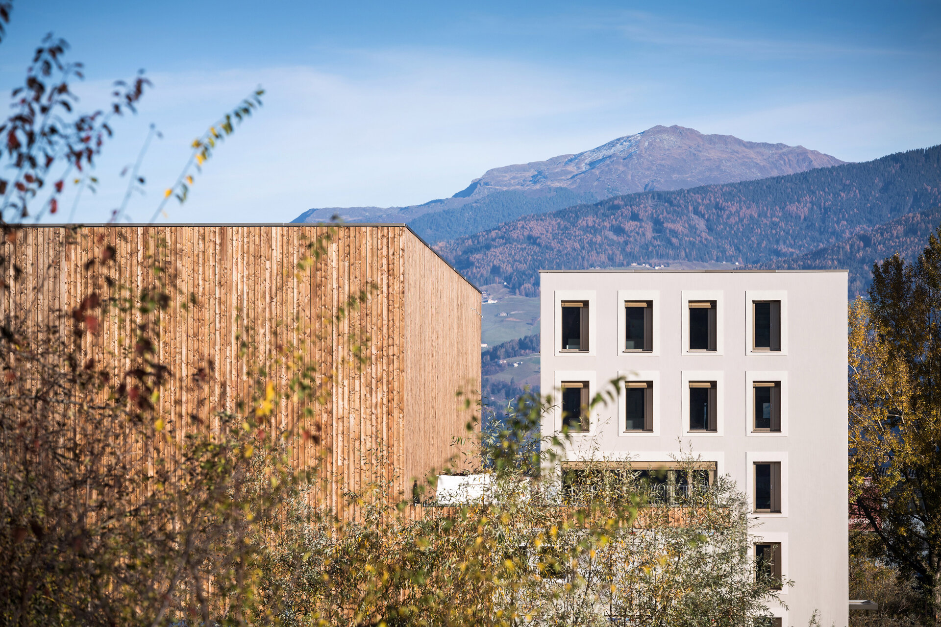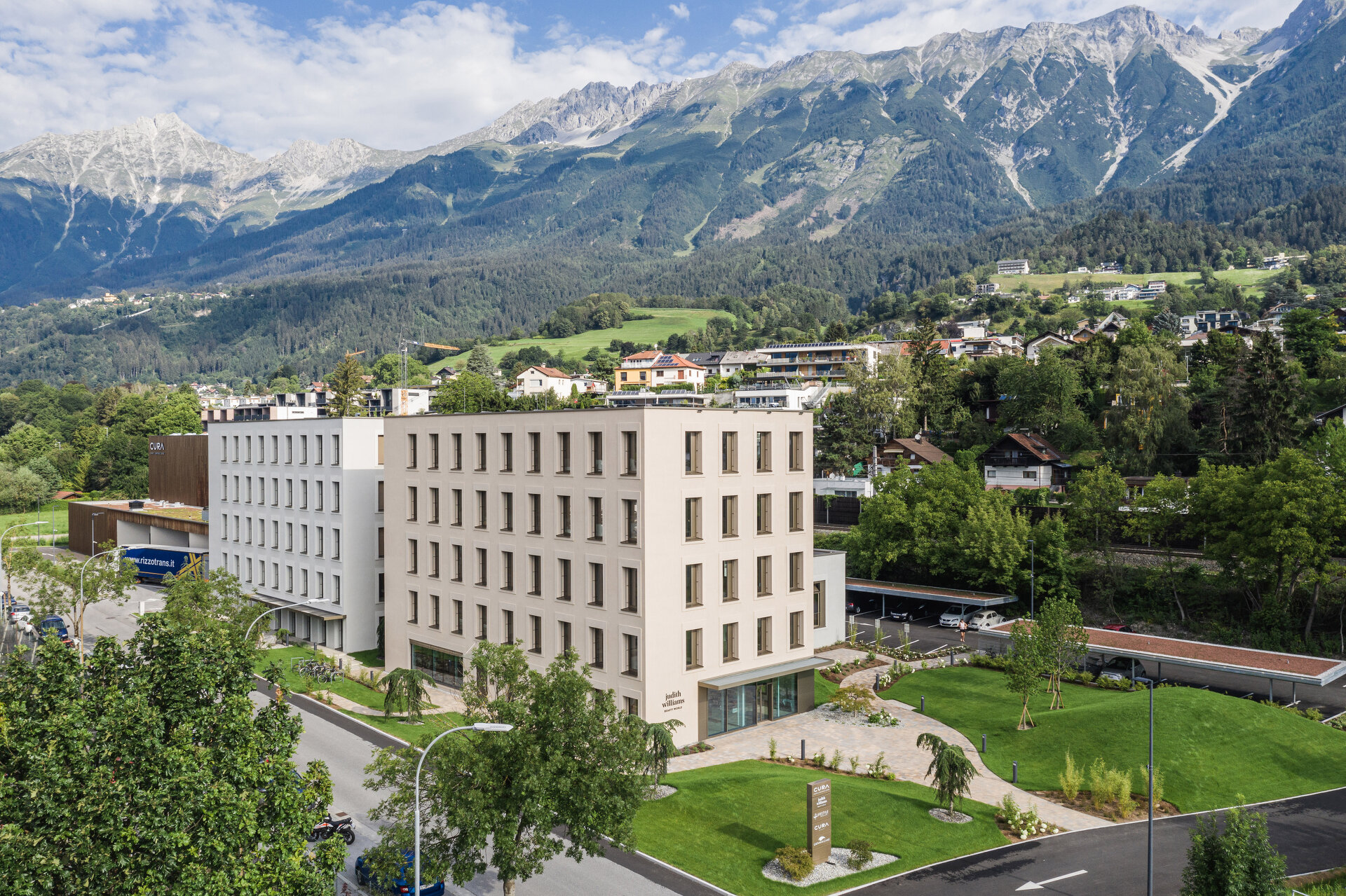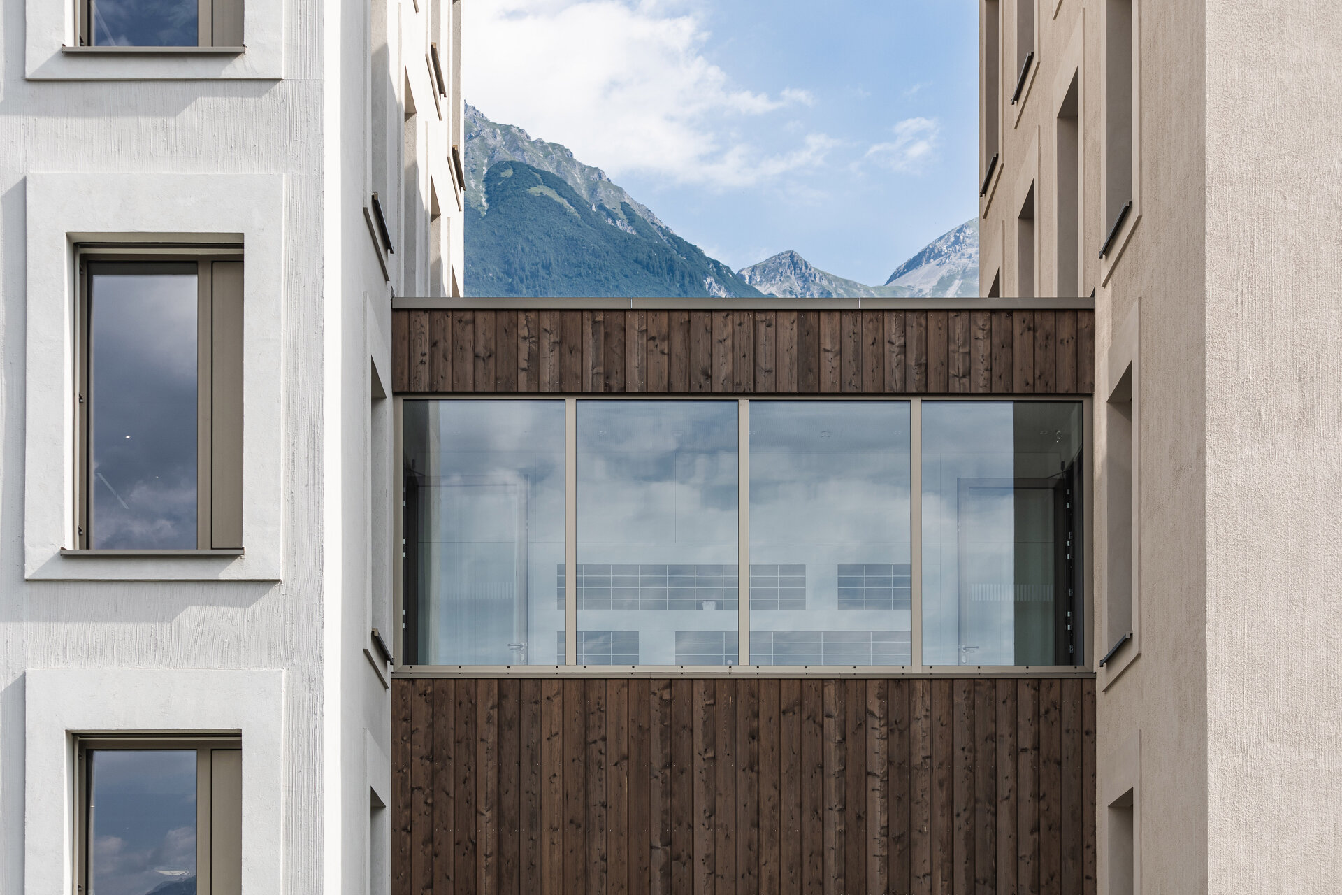 Ziel der Entwurfsüberlegungen war es, die für Gewerbegebiete übliche Formensprache aufzubrechen und eine Antithese zu den anonymen Flachbauten des ungeordneten Gewerbegebietes Mühlau-Arzl zu setzen. Die beiden fünfgeschoßigen Bürohäuser mit ihren weiß bzw. grau verputzten Ziegelwänden verstehen sich als moderne Interpretation eines Stadthauses, die Konfektionierungs- und Logistikzentrale wurde als massiver Holzbau mit Lärchenholzfassade ausgeführt. Zwischen die beiden Bürohäuser wurde ein Verbindungsbau eingeschoben, der die Fluchten und die Optik der holzverkleideten Logistikeinheit aufnimmt.
