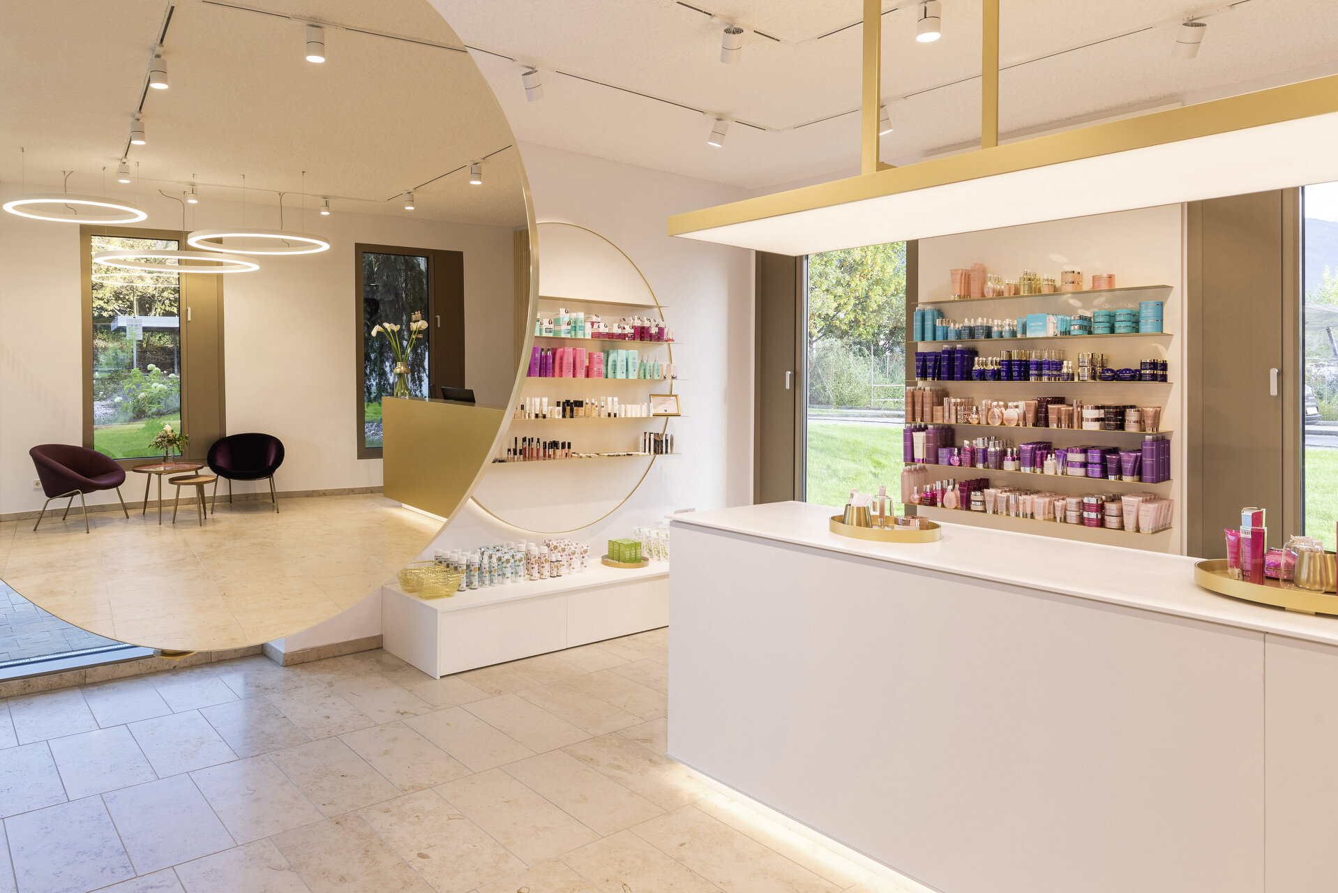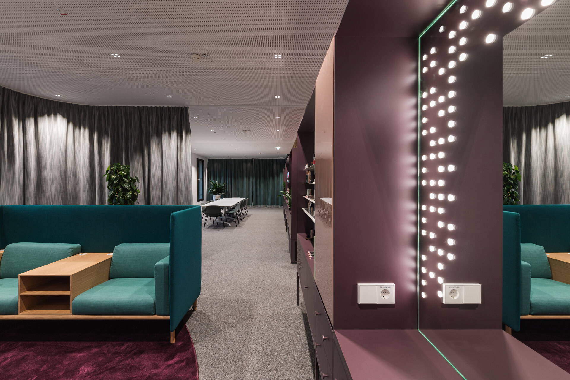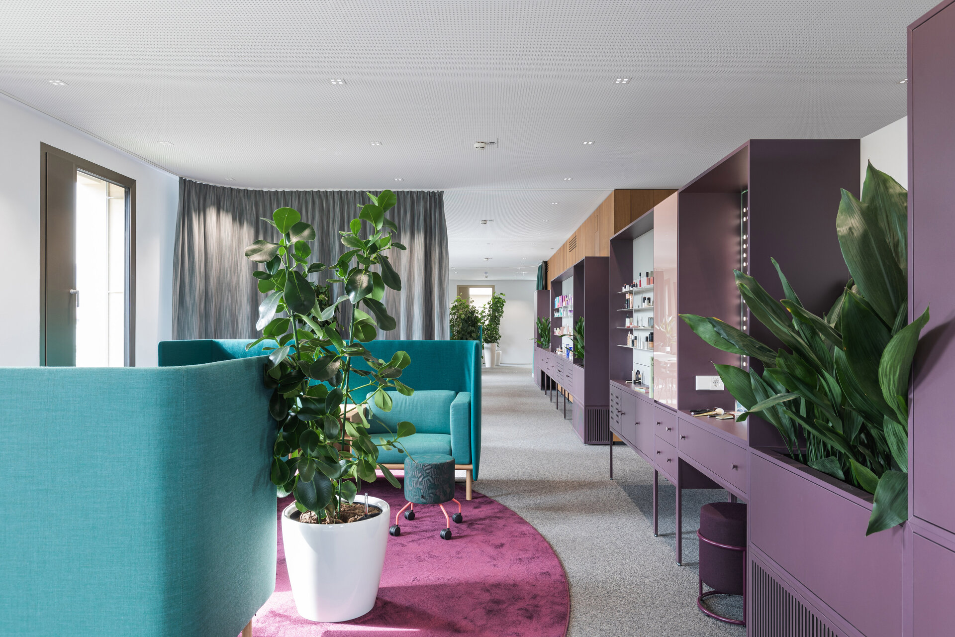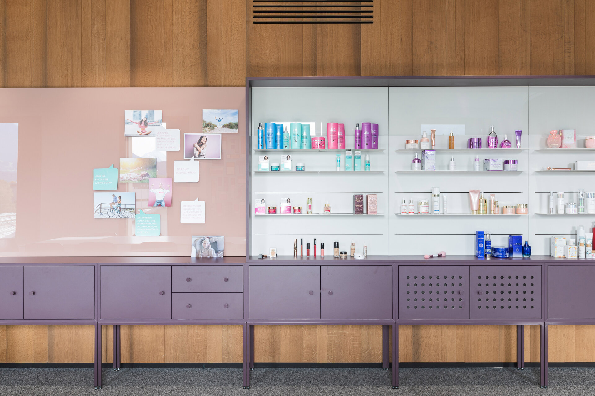 Das Entrée zum Headquarter liegt untypischerweise im 2. Obergeschoß des ersten Bürohauses, das mit einem großzügigen Empfangsbereich, einer weitläufigen Leisure-Zone und der hauseigenen Kantine das Herzstück des Gebäudes bildet. In den Geschoßen ober- und unterhalb verteilen sich auf fünf Ebenen die offen und hell gestalteten Büroräumlichkeiten für die gesamte Verwaltung. „Teamwalls“-Vorhänge, mit denen Besprechungsräume zoniert werden können, sorgen hier für hohe Flexibilität. Im zweiten Geschoß des neuen Gebäudes wurde eine Fläche für Activity-Based-Working eingerichtet, in der teilverglaste Raumteiler-Regale mit integrierten Telefonboxen, Sitznischen und Pflanzen zu Kreativität und Kommunikation einladen. Neben den Büros für Marketing-Aktivitäten sind im Neubau ein kleiner Laborbereich, eine Kinderbetreuungseinrichtung und ein Flagship-Store – die „Judith Williams Beauty World“ - untergebracht.