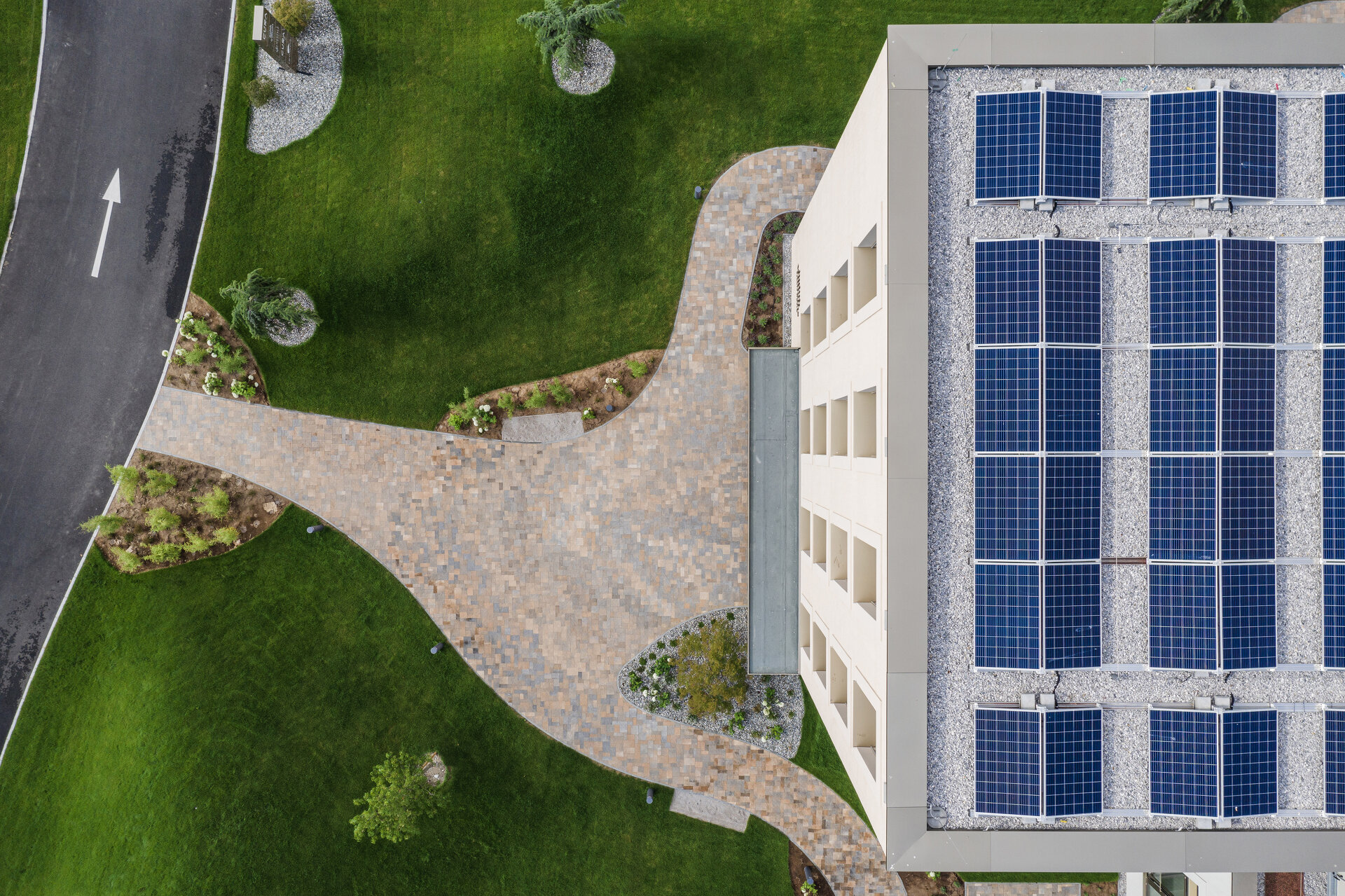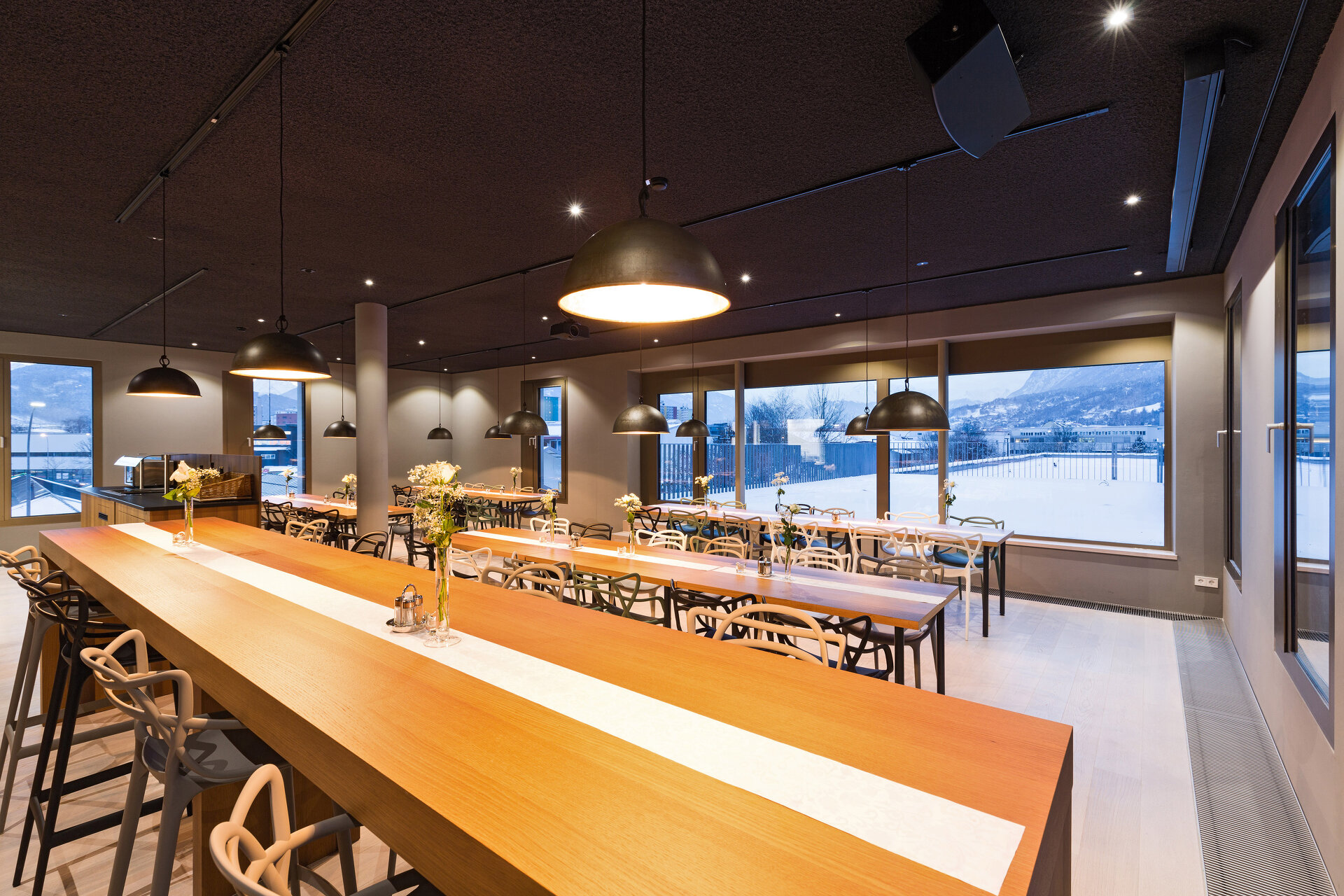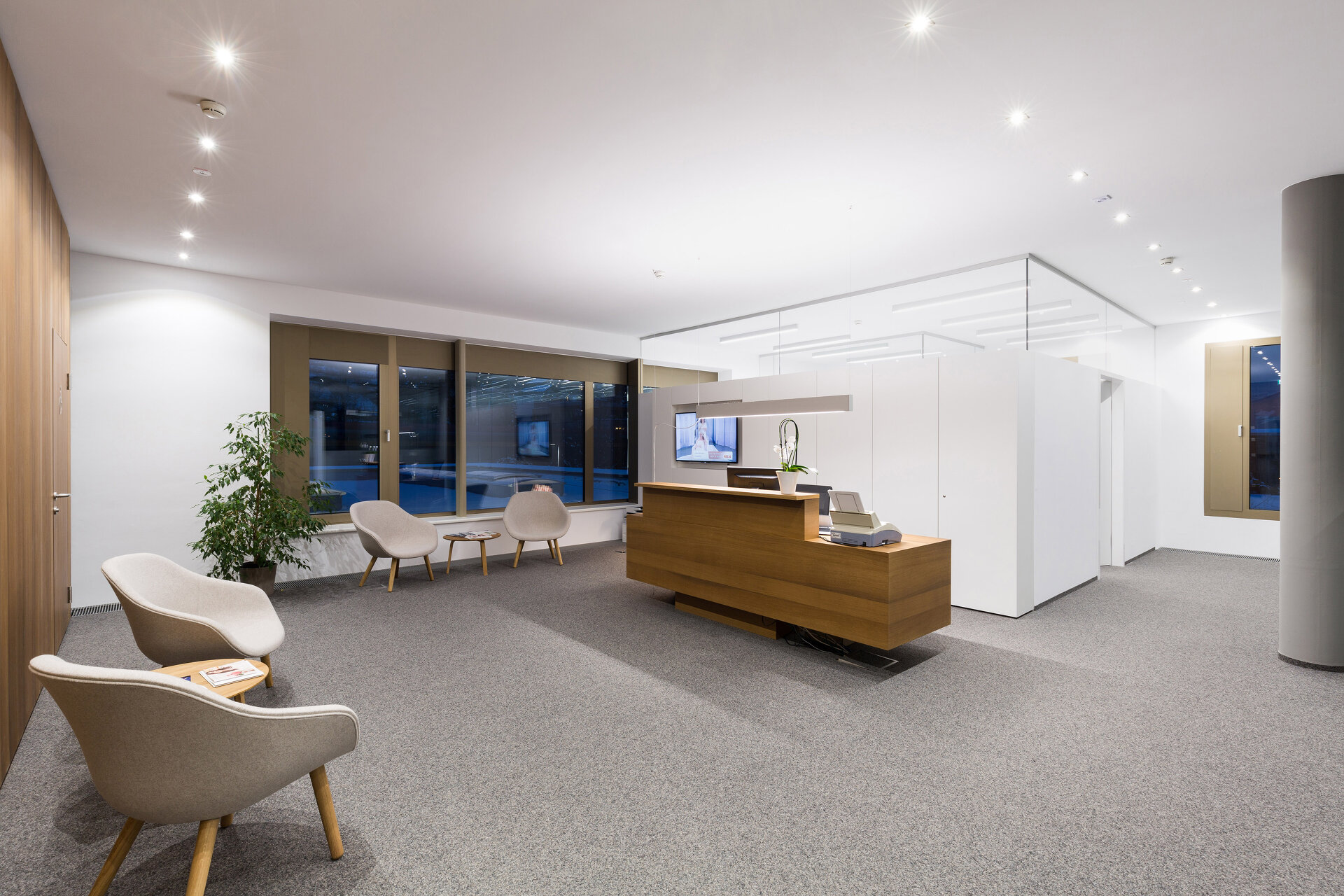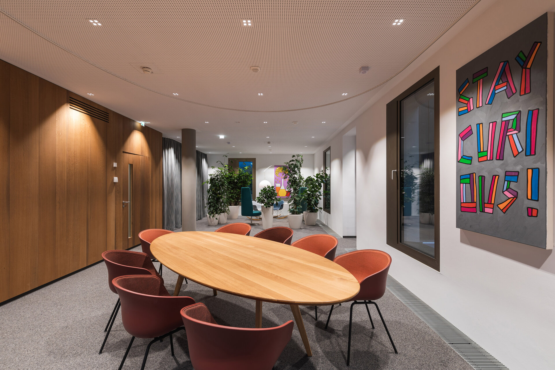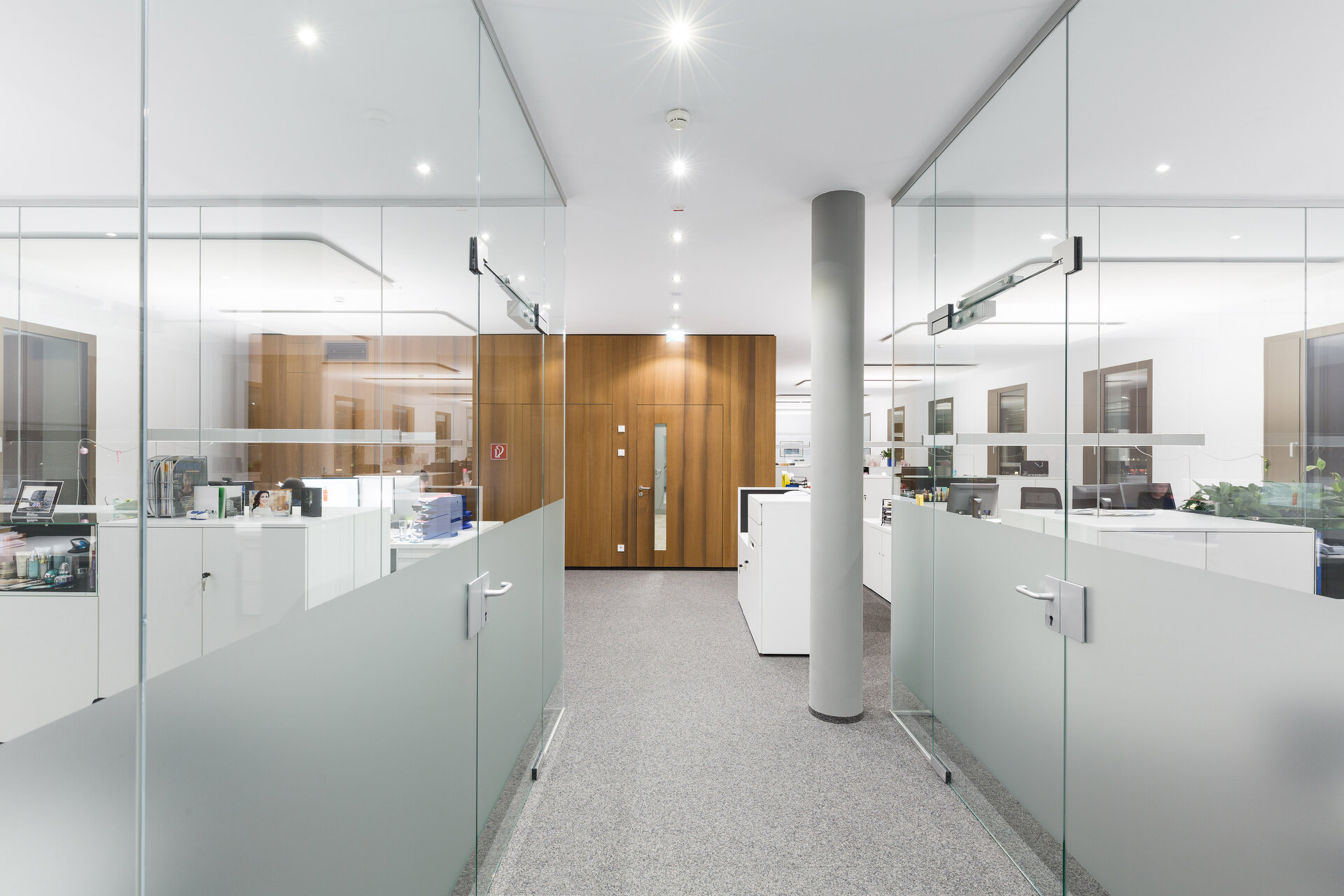 Das Entrée zum Headquarter liegt untypischerweise im 2. Obergeschoß des ersten Bürohauses, das mit einem großzügigen Empfangsbereich, einer weitläufigen Leisure-Zone und der hauseigenen Kantine das Herzstück des Gebäudes bildet. In den Geschoßen ober- und unterhalb verteilen sich auf fünf Ebenen die offen und hell gestalteten Büroräumlichkeiten für die gesamte Verwaltung. „Teamwalls“-Vorhänge, mit denen Besprechungsräume zoniert werden können, sorgen hier für hohe Flexibilität. Im zweiten Geschoß des neuen Gebäudes wurde eine Fläche für Activity-Based-Working eingerichtet, in der teilverglaste Raumteiler-Regale mit integrierten Telefonboxen, Sitznischen und Pflanzen zu Kreativität und Kommunikation einladen. Neben den Büros für Marketing-Aktivitäten sind im Neubau ein kleiner Laborbereich, eine Kinderbetreuungseinrichtung und ein Flagship-Store – die „Judith Williams Beauty World“ - untergebracht.
