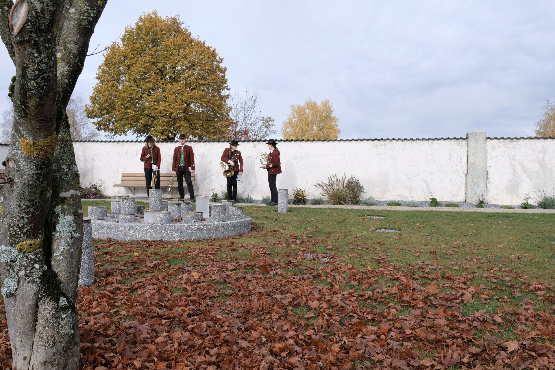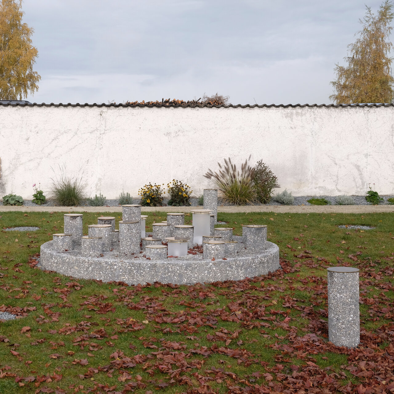 Im Zentrum der baukünstlerischen Gestaltung steht das Gedenken an die Gemeinschaft aller Verstorbenen, symbolisiert als kreisrunde Scheibe mitten in der Wiesenfläche. Für jede Urnenbestattung wird eine der schlanken, zylindrischen Säulen entnommen und als Grabstein versetzt. Die verbleibenden Leerstellen werden mit Laternen, Ziersteinen oder Blumenschmuck gefüllt.