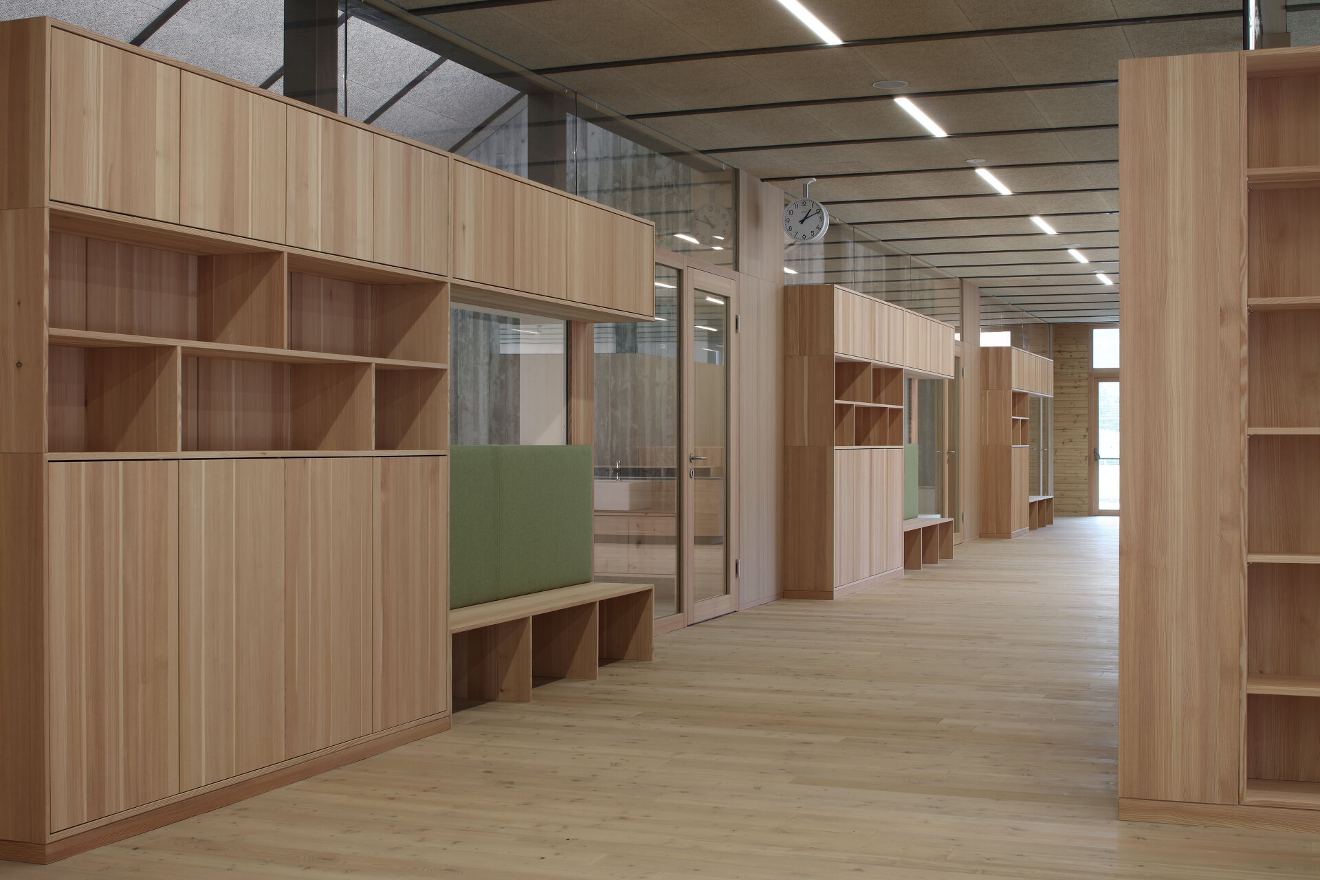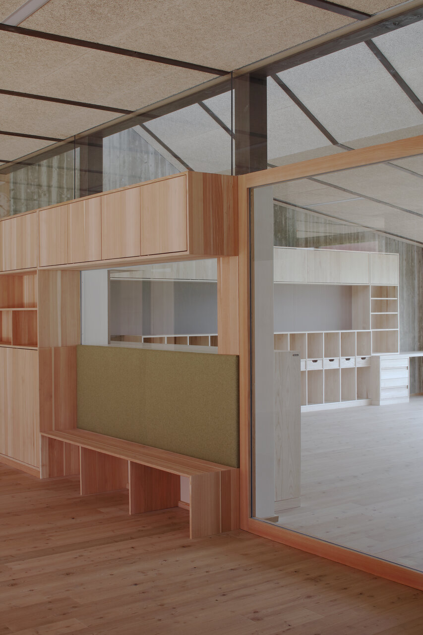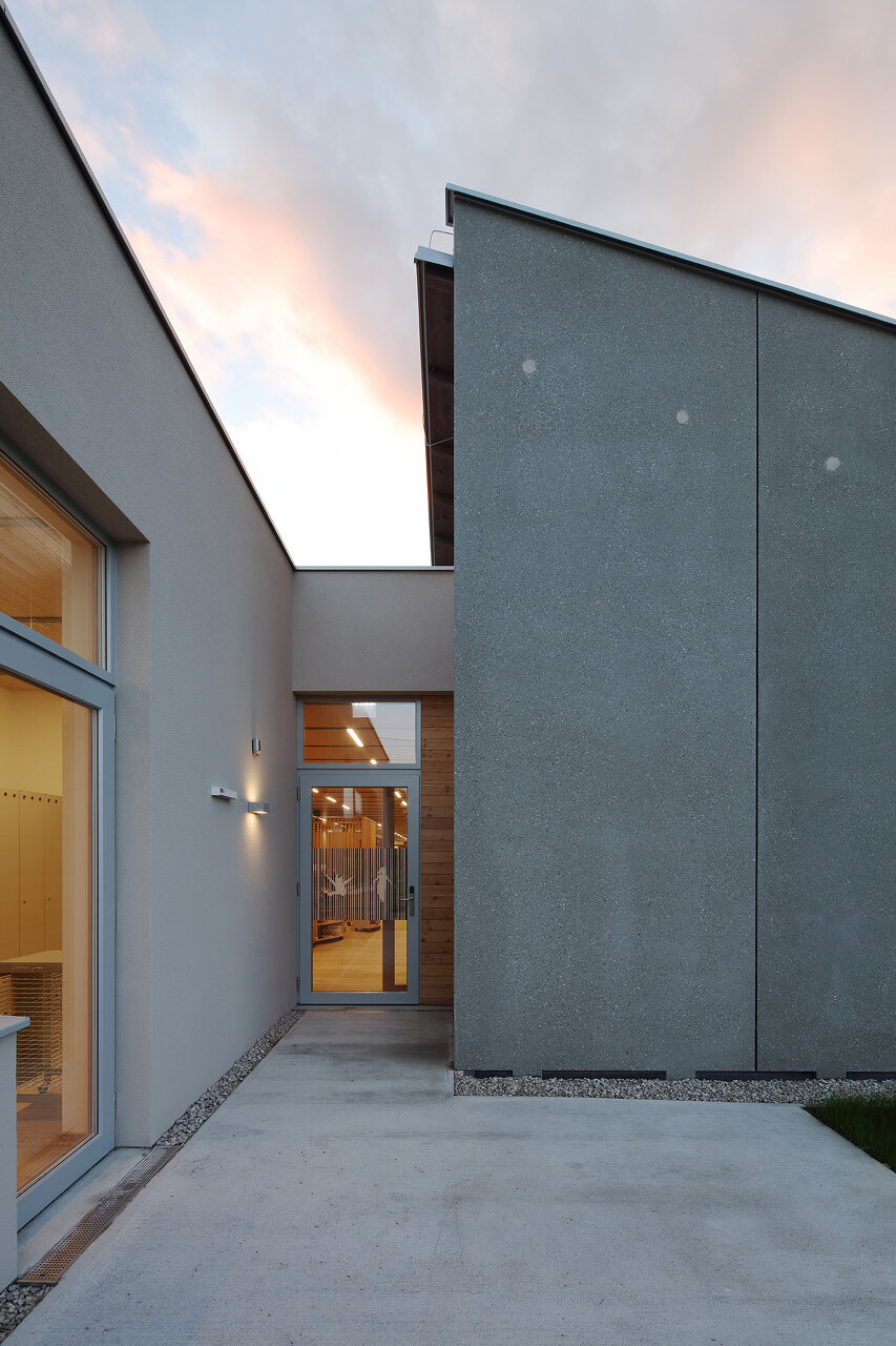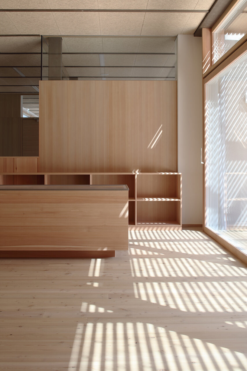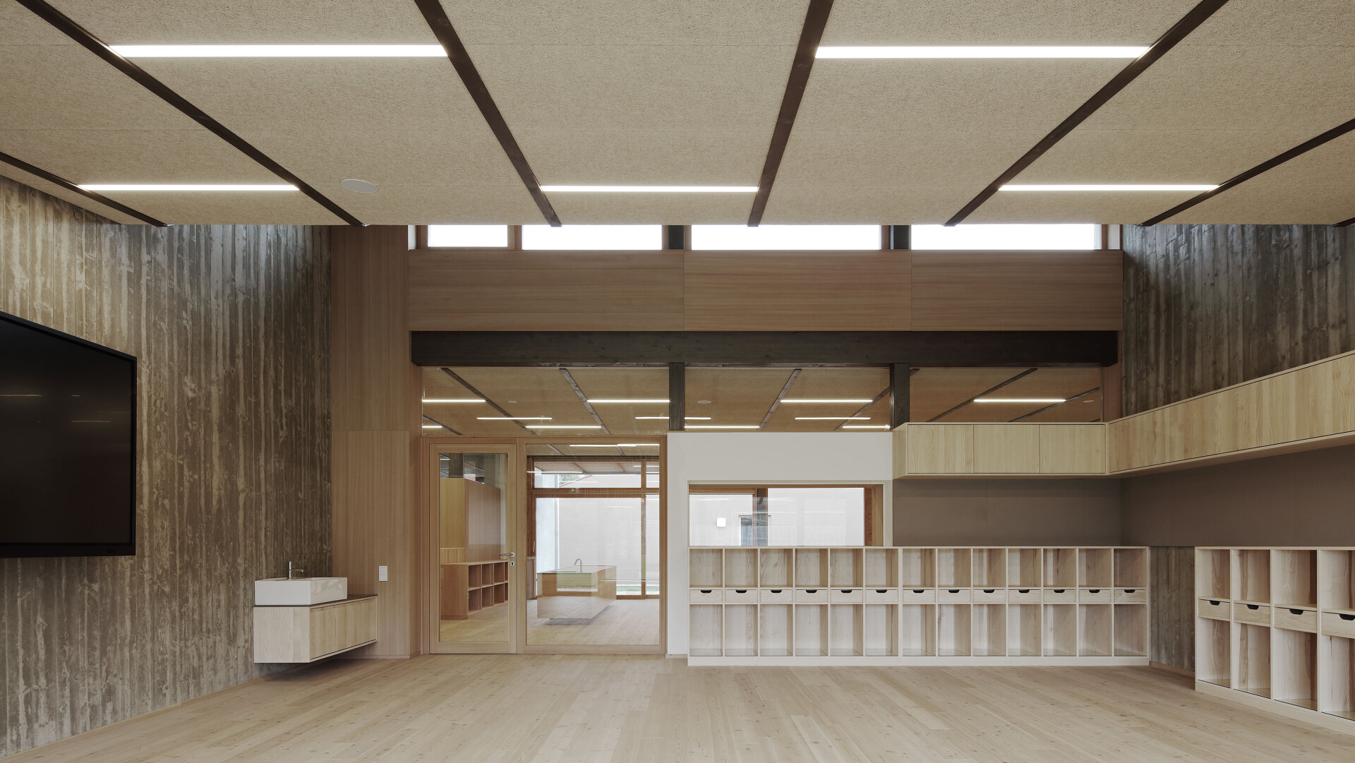 Die Herausforderung für die Architektin war, auf der zur Verfügung stehenden beschränkten Grundfläche das optimale Ergebnis für die Nutzer:innen zu erzielen. Sie erreichte es in dem ebenerdigen Gebäude mit ineinanderfließenden Räumen mit einer starken Durchlichtung und entsprechenden Außenraumbeziehungen. So geht die Aula fließend in den „Marktplatz“ über, in den der Gruppenraum gesetzt wurde. Mobile Kästen mit integrierten Sitznischen schaffen unterschiedliche Lernsituationen und „Kuschelecken“ für die Kinder. Der Marktplatz öffnet sich über seine gesamte Länge in einen südlich vorgelagerten Hof, der von der Rückwand des Kindergartens begrenzt ist und dadurch als vollkommen ungestörte Freiraumklasse oder als Erweiterung des Werkraumes genutzt werden kann. Der Turnsaal wird von Kindergarten und Volksschule gleichermaßen genutzt. Mit optischen Tricks wurde räumliche Weite und Qualität erreicht. Große Fensterflächen nach Norden werden durch die Dachschräge mit kleinen Gaupen, durch die das warme Südlicht in die Räume flutet, ergänzt. Quadratische Klassen erlauben variantenreiche Gestaltungsmöglichkeiten. Für eine gesunde Lernatmosphäre sorgen „offenporige“ Innengestaltungen mit geöltem Holz und ökologischem Putz. Einheitlicher Holzverwendung in den Gemeinschaftsräumen – Lärche für Böden, Einbauten – stehen die mit jeweils unterschiedlichen Holzarten – Tanne, Zirbe, Esche und Lärche – gestalteten Klassen als „individuelles Zuhause“ der Kinder gegenüber. (Text: Monika Unegg)