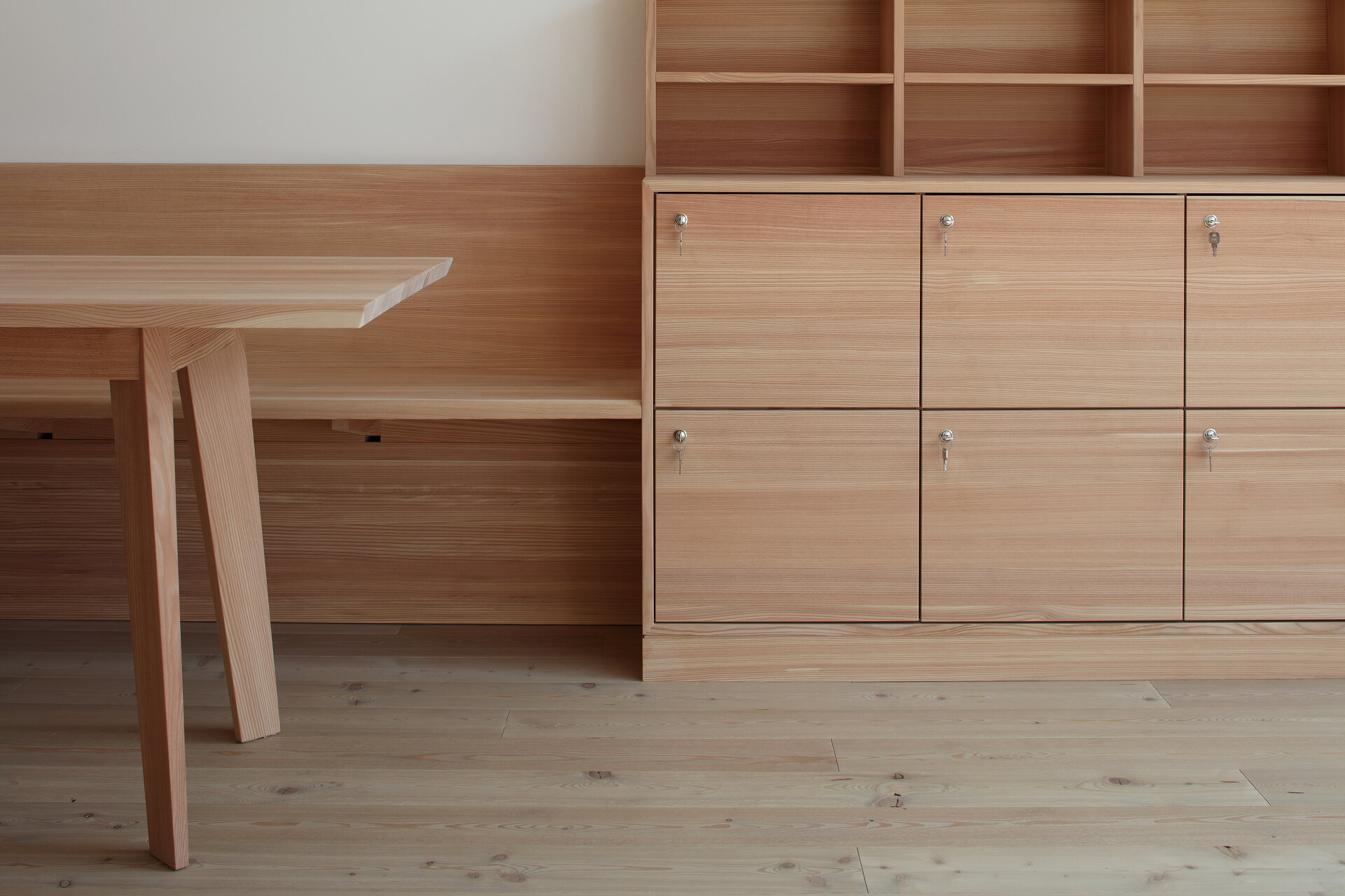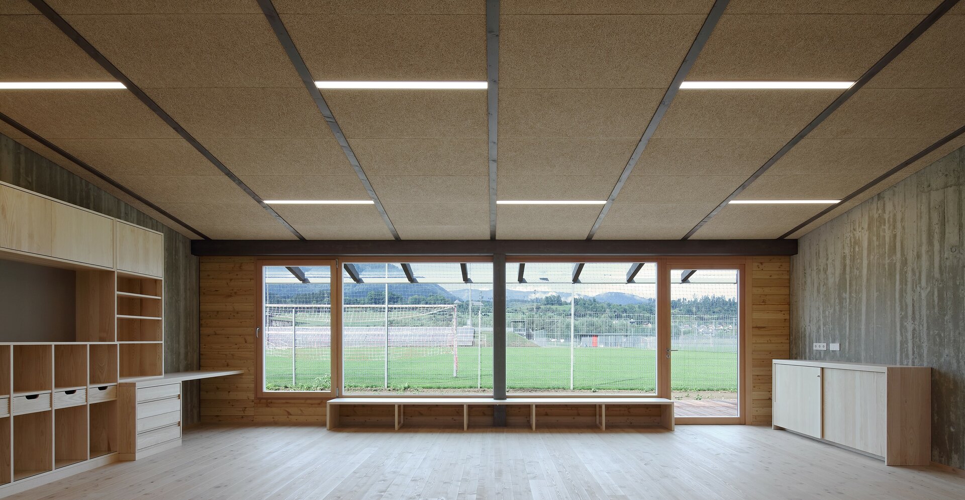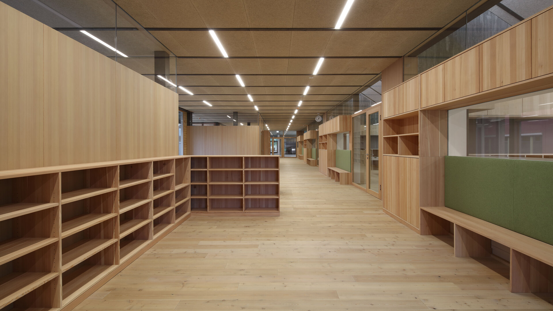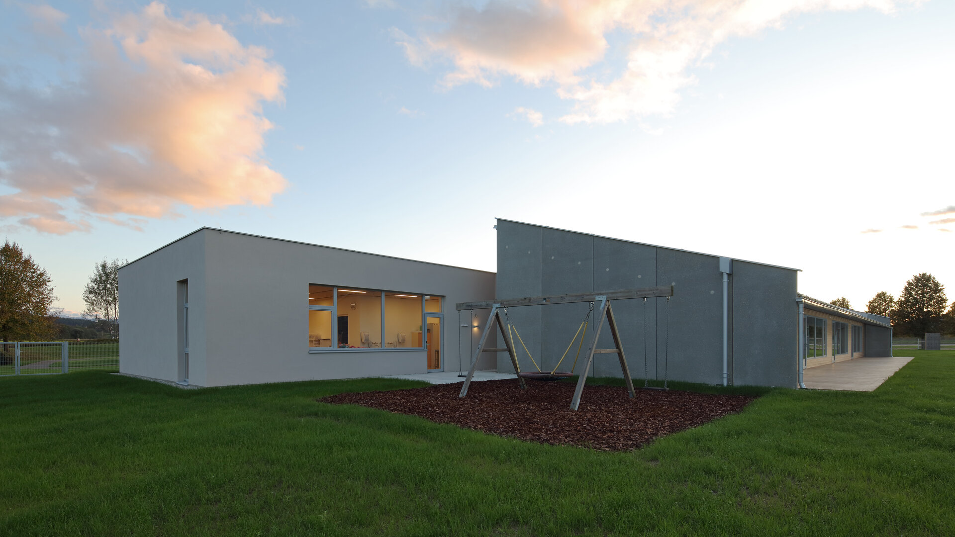 Die Herausforderung für die Architektin war, auf der zur Verfügung stehenden beschränkten Grundfläche das optimale Ergebnis für die Nutzer:innen zu erzielen. Sie erreichte es in dem ebenerdigen Gebäude mit ineinanderfließenden Räumen mit einer starken Durchlichtung und entsprechenden Außenraumbeziehungen. So geht die Aula fließend in den „Marktplatz“ über, in den der Gruppenraum gesetzt wurde. Mobile Kästen mit integrierten Sitznischen schaffen unterschiedliche Lernsituationen und „Kuschelecken“ für die Kinder. Der Marktplatz öffnet sich über seine gesamte Länge in einen südlich vorgelagerten Hof, der von der Rückwand des Kindergartens begrenzt ist und dadurch als vollkommen ungestörte Freiraumklasse oder als Erweiterung des Werkraumes genutzt werden kann. Der Turnsaal wird von Kindergarten und Volksschule gleichermaßen genutzt. Mit optischen Tricks wurde räumliche Weite und Qualität erreicht. Große Fensterflächen nach Norden werden durch die Dachschräge mit kleinen Gaupen, durch die das warme Südlicht in die Räume flutet, ergänzt. Quadratische Klassen erlauben variantenreiche Gestaltungsmöglichkeiten. Für eine gesunde Lernatmosphäre sorgen „offenporige“ Innengestaltungen mit geöltem Holz und ökologischem Putz. Einheitlicher Holzverwendung in den Gemeinschaftsräumen – Lärche für Böden, Einbauten – stehen die mit jeweils unterschiedlichen Holzarten – Tanne, Zirbe, Esche und Lärche – gestalteten Klassen als „individuelles Zuhause“ der Kinder gegenüber. (Text: Monika Unegg)