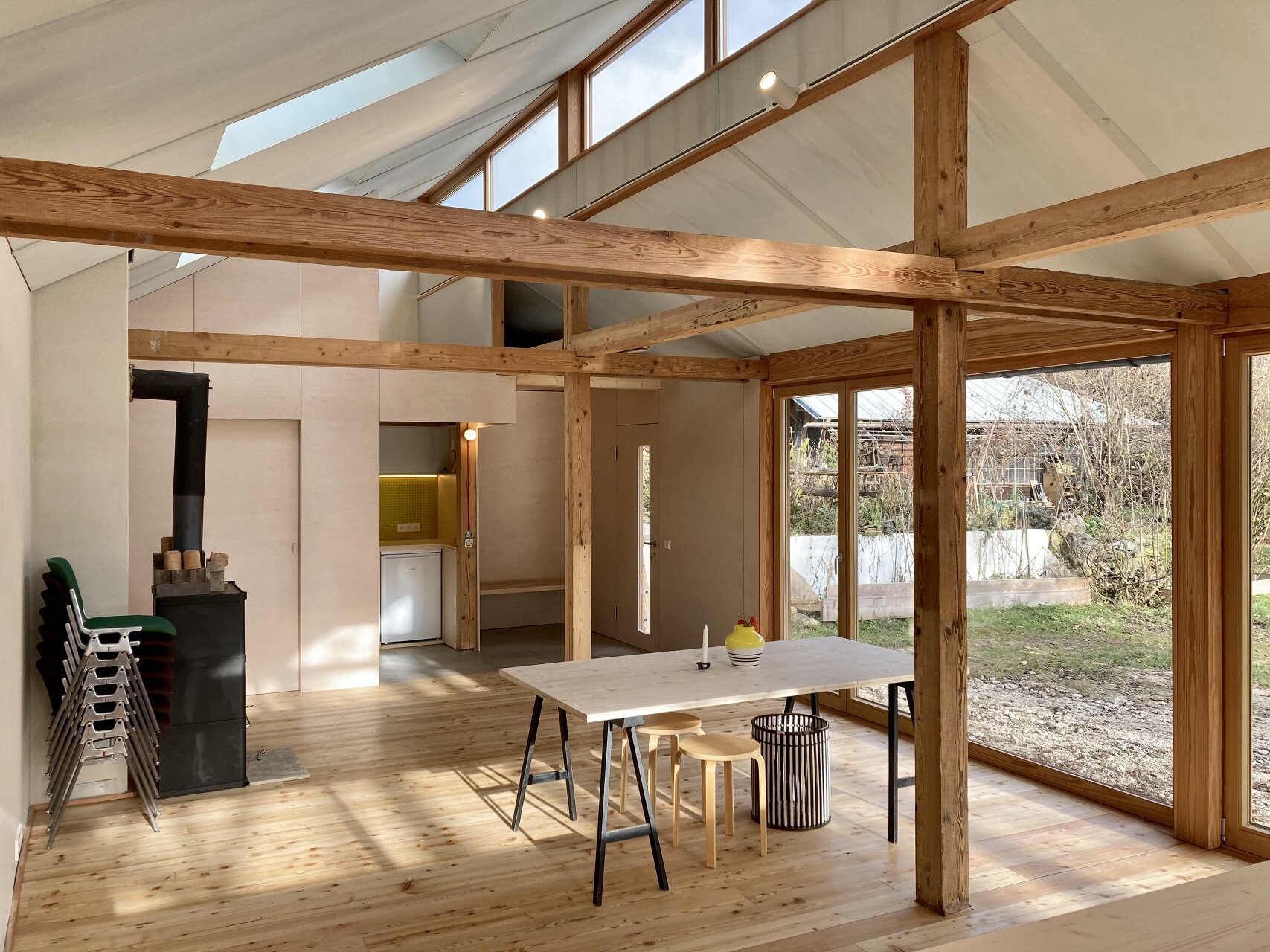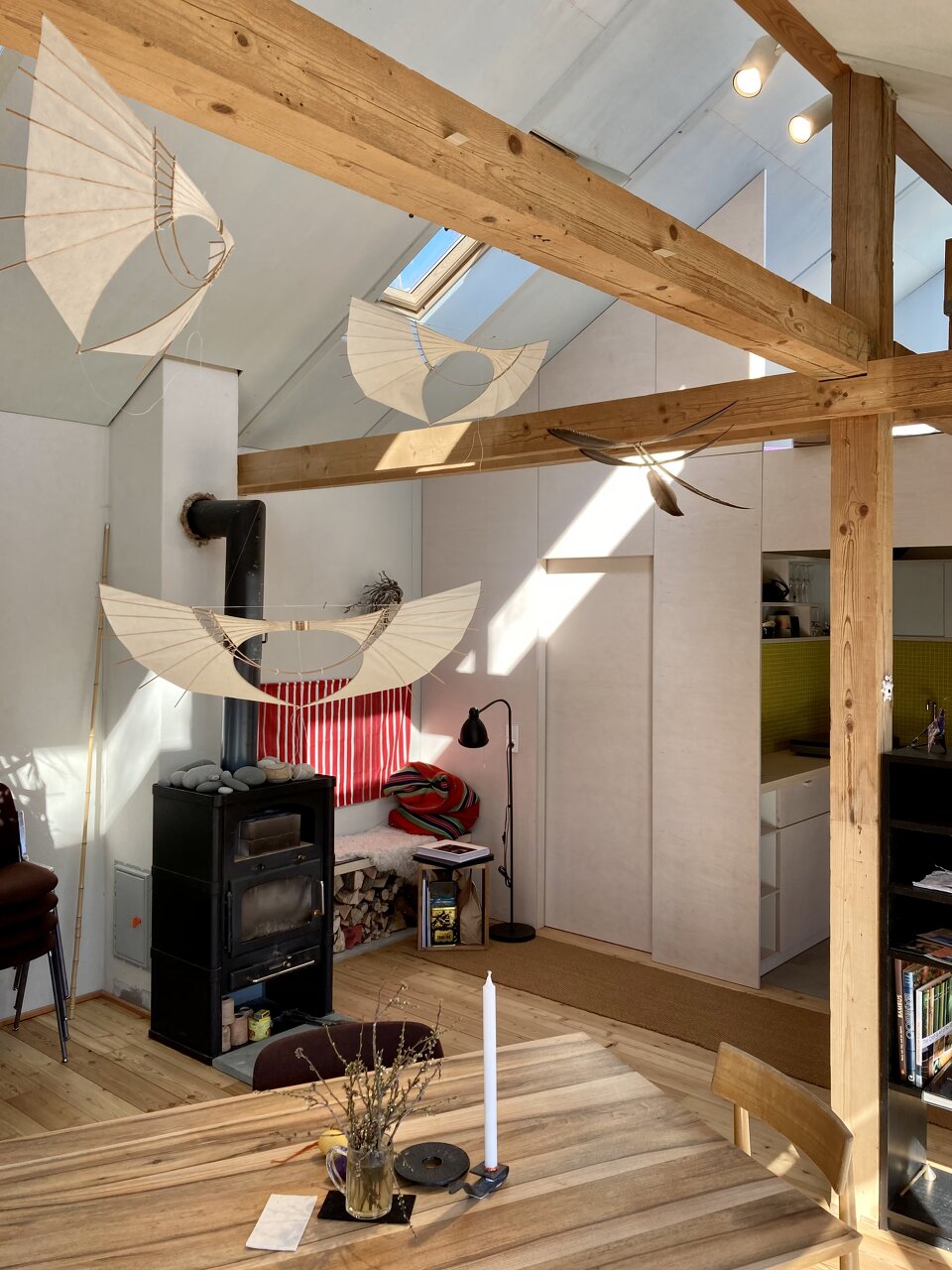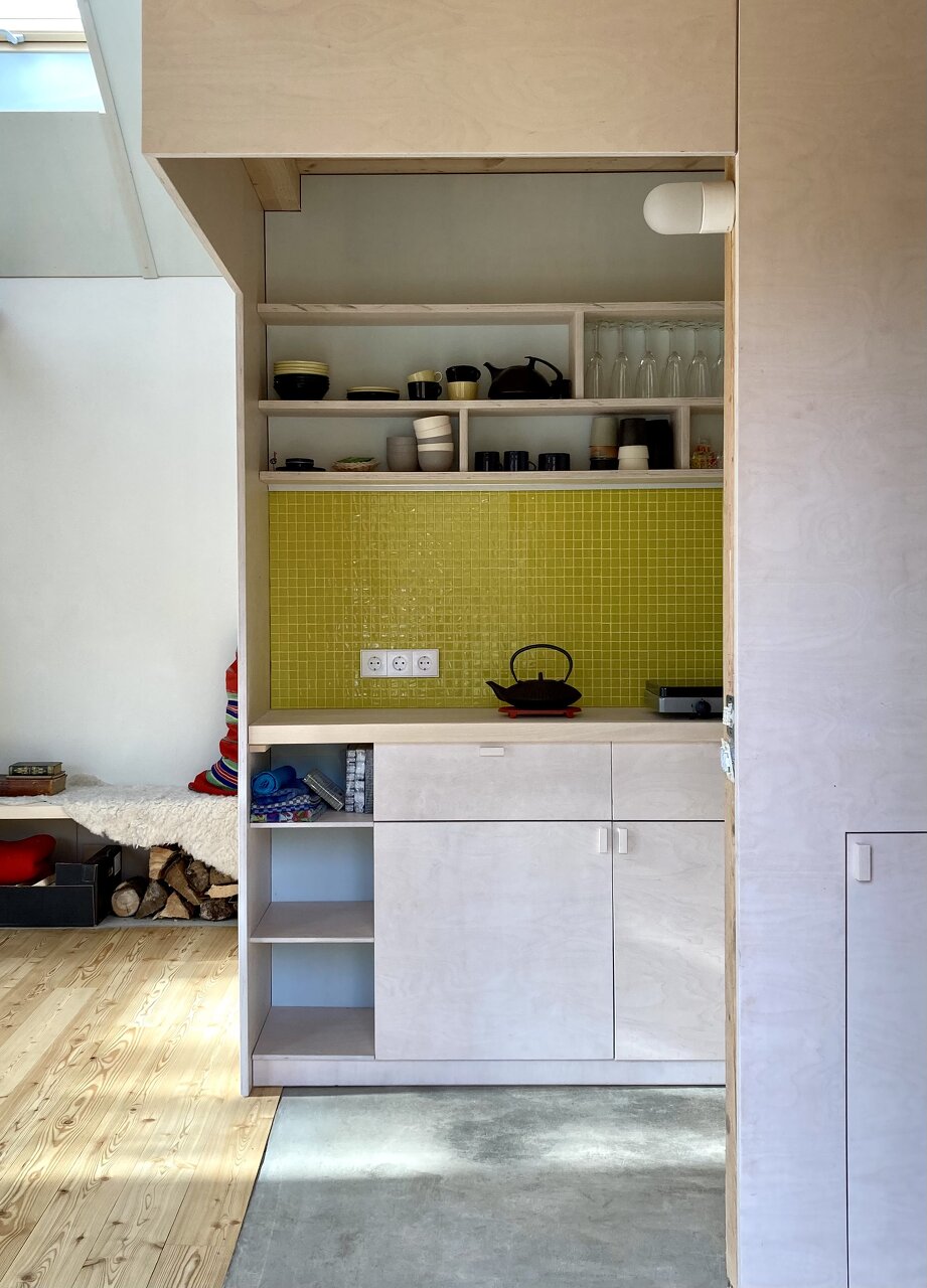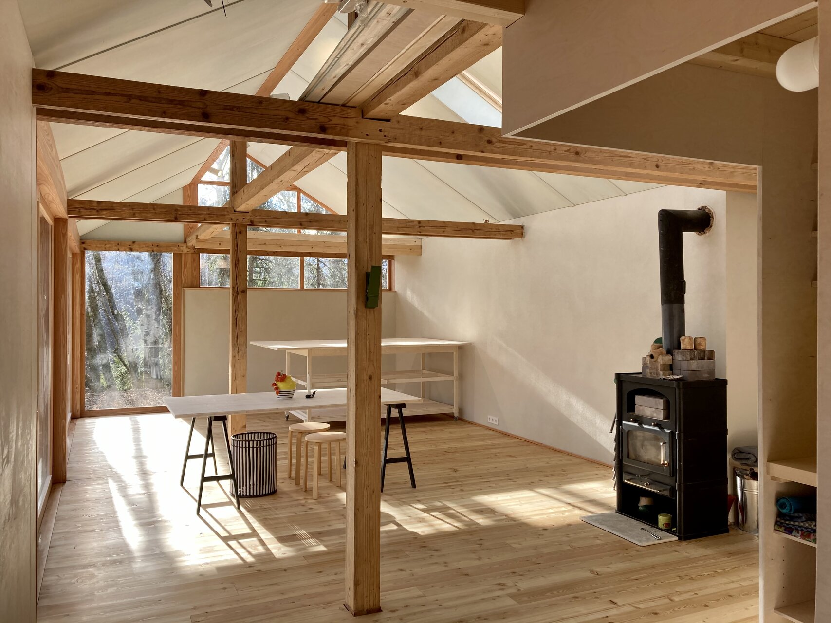 Zentraler Fokus während des Planungsprozesses war die Ausführung in Selbstbauweise. Bis auf die haustechnischen Elemente wurden dem bestehendem Holzständerbau nur natürliche und entsprechende Baumaterialien hinzugefügt. Hierzu wurde der ehemalige Heu- und Fußboden sowie die östliche Fassade entfernt, das primäre Tragwerk aber vollständig erhalten. Der vormalige überdachte Vorbereich wurde dem Innenraum zugeschlagen, die Ost- und Südseite mit großzügigen Verglasungen versehen sowie ein Kamin und zwei Dachflächenfenster installiert. Der ehemalige Lehmboden wurde ausgegraben, der Hohlraum mit Blähglasschotter als Dämmebene verfüllt und mit einem Schiffsboden aus Lärche versehen. Die alte Lärchenschalung der Wände wurde, wie auch die Dachhaut, erhalten und von Innen durch eine winddichte Ebene aus Holzfaserplatten ergänzt. Der zwischen dem Tragwerk entstandene Hohlraum wurde mit Zellulose ausgeblasen. Innenseitig wurden die Wände wiederum mit Holzfaserplatten auf der Installationsebene beplankt und mit Lehmputz verspachtelt. Decke und Trennwände sind aus Sperrholz gefertigt. Für die Schlafebenen wurde das Holz des vormaligen Heubodens in der familieneigenen Holzwerkstatt aufbereitet und wieder verbaut. Die Umbauarbeiten begannen im Frühjahr und wurden im November 2020 fertiggestellt. (Text: Architekten bearbeitet)