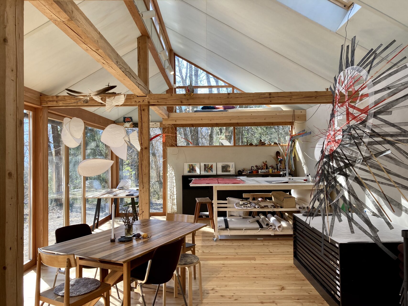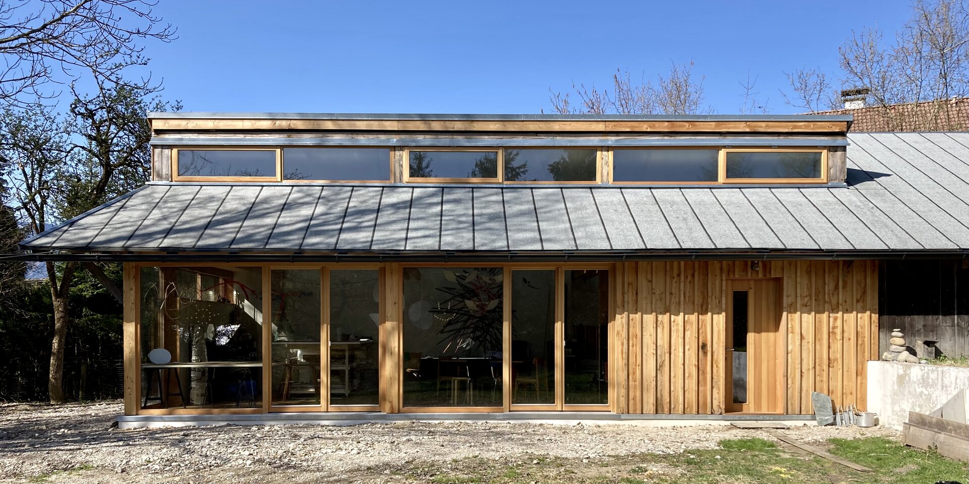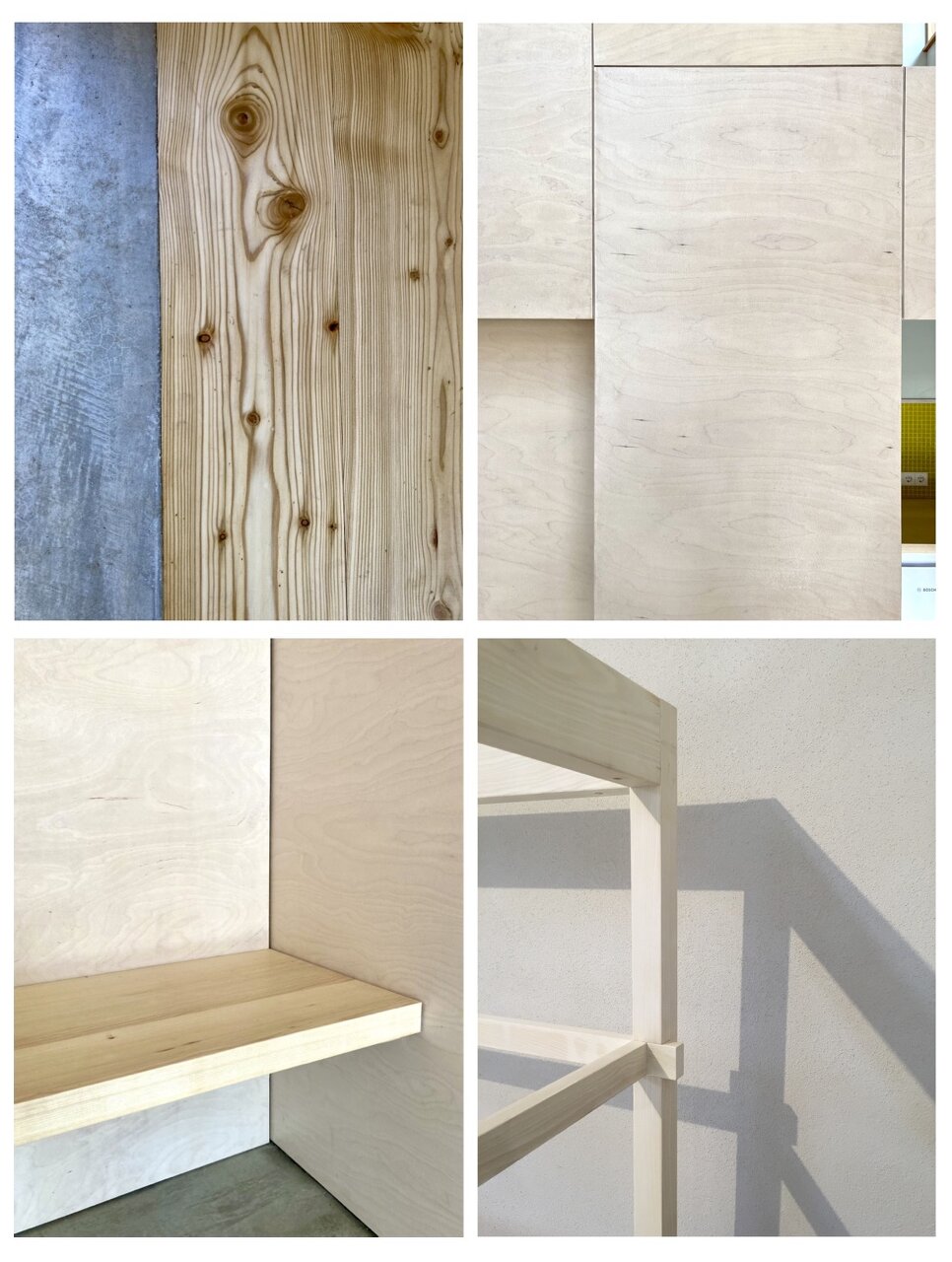 Zentraler Fokus während des Planungsprozesses war die Ausführung in Selbstbauweise. Bis auf die haustechnischen Elemente wurden dem bestehendem Holzständerbau nur natürliche und entsprechende Baumaterialien hinzugefügt. Hierzu wurde der ehemalige Heu- und Fußboden sowie die östliche Fassade entfernt, das primäre Tragwerk aber vollständig erhalten. Der vormalige überdachte Vorbereich wurde dem Innenraum zugeschlagen, die Ost- und Südseite mit großzügigen Verglasungen versehen sowie ein Kamin und zwei Dachflächenfenster installiert. Der ehemalige Lehmboden wurde ausgegraben, der Hohlraum mit Blähglasschotter als Dämmebene verfüllt und mit einem Schiffsboden aus Lärche versehen. Die alte Lärchenschalung der Wände wurde, wie auch die Dachhaut, erhalten und von Innen durch eine winddichte Ebene aus Holzfaserplatten ergänzt. Der zwischen dem Tragwerk entstandene Hohlraum wurde mit Zellulose ausgeblasen. Innenseitig wurden die Wände wiederum mit Holzfaserplatten auf der Installationsebene beplankt und mit Lehmputz verspachtelt. Decke und Trennwände sind aus Sperrholz gefertigt. Für die Schlafebenen wurde das Holz des vormaligen Heubodens in der familieneigenen Holzwerkstatt aufbereitet und wieder verbaut. Die Umbauarbeiten begannen im Frühjahr und wurden im November 2020 fertiggestellt. (Text: Architekten bearbeitet)
