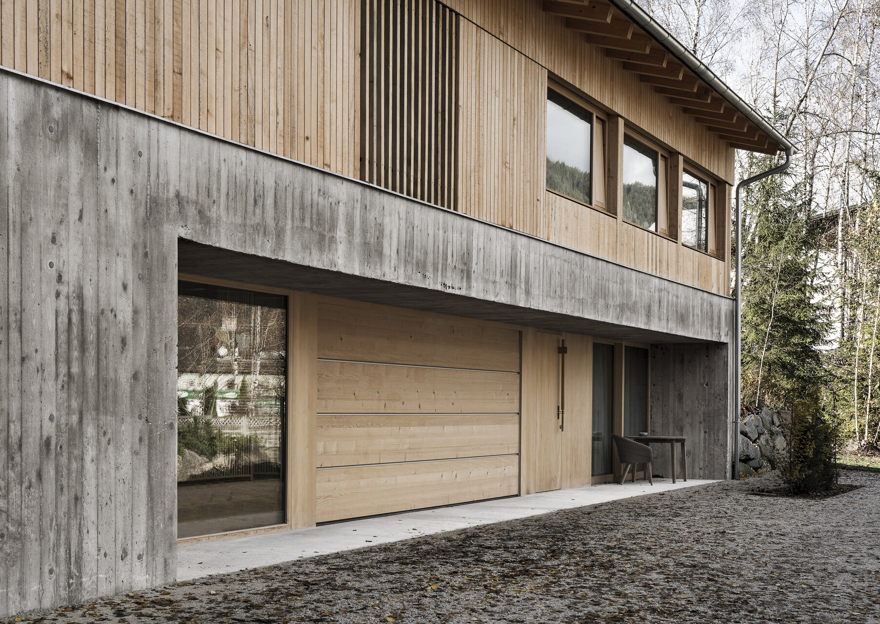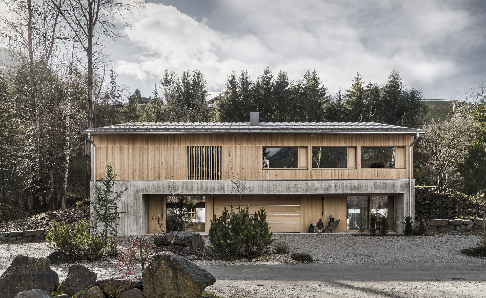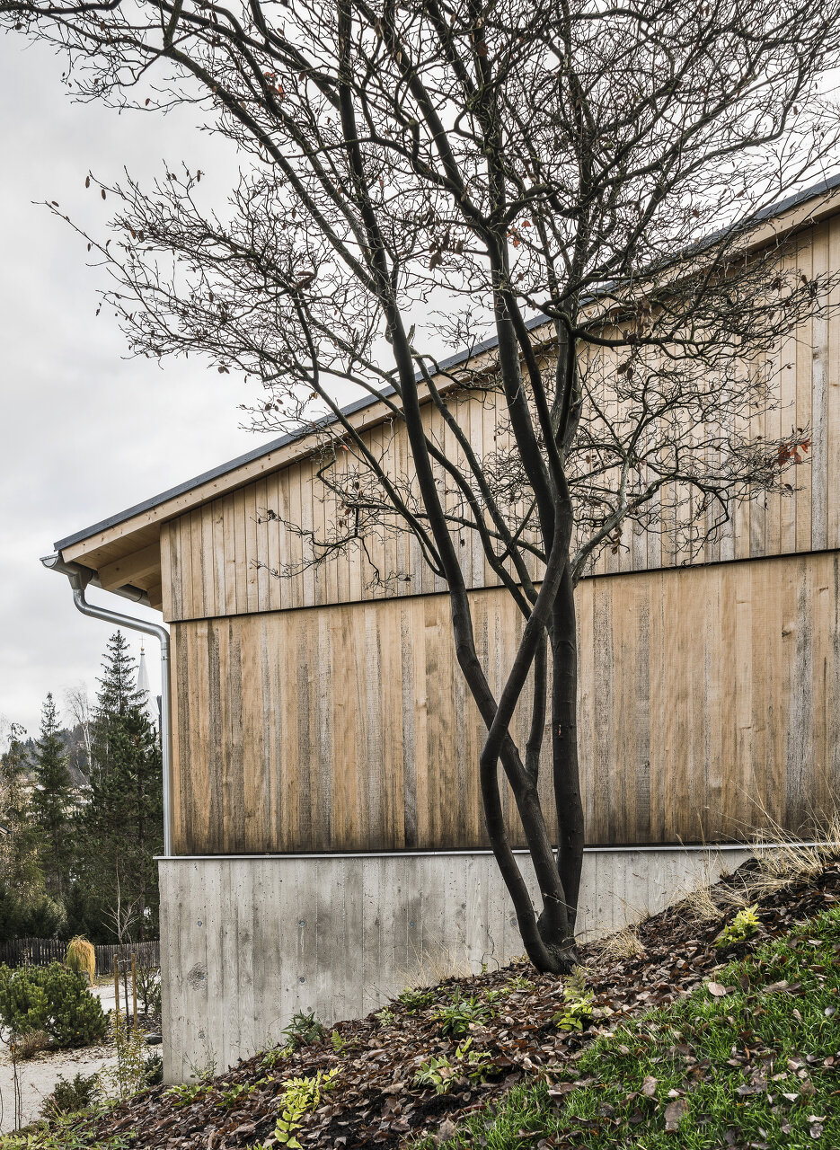 Aus den Rahmenbedingungen, die sich aus der Lage des Grundstücks ergeben, sowie aus den Vorgaben der sechsköpfigen Familie wurde ein schlichter Baukörper entwickelt, der sensibel auf den Kontext reagiert und diesen auch geschickt für die räumlichen Qualitäten des Hauses nutzt. Die traditionelle Bauform des Ennstals wird dabei in ihrer Grundtypologie aufgenommen und der Aufgabe gemäß neu interpretiert.