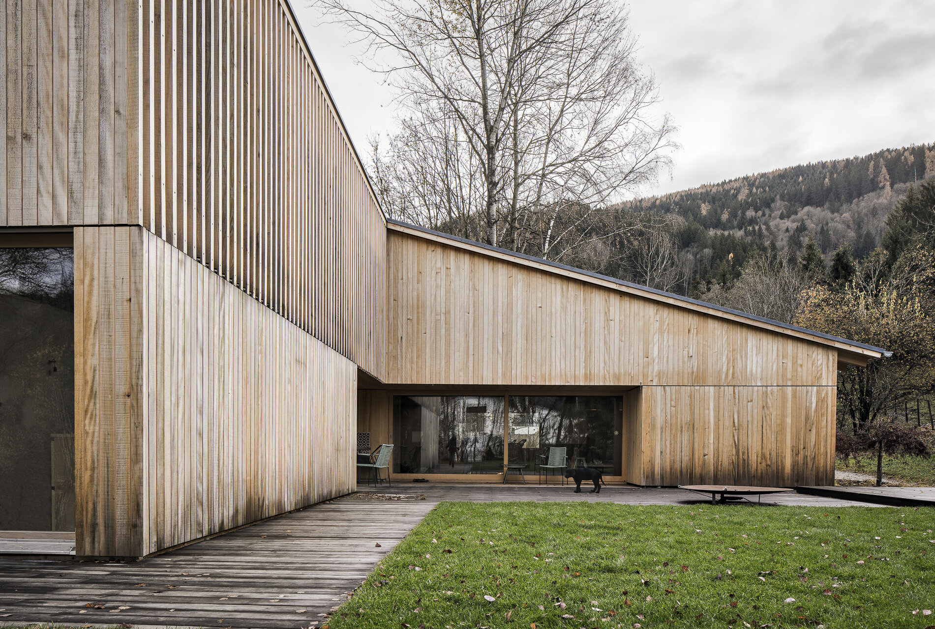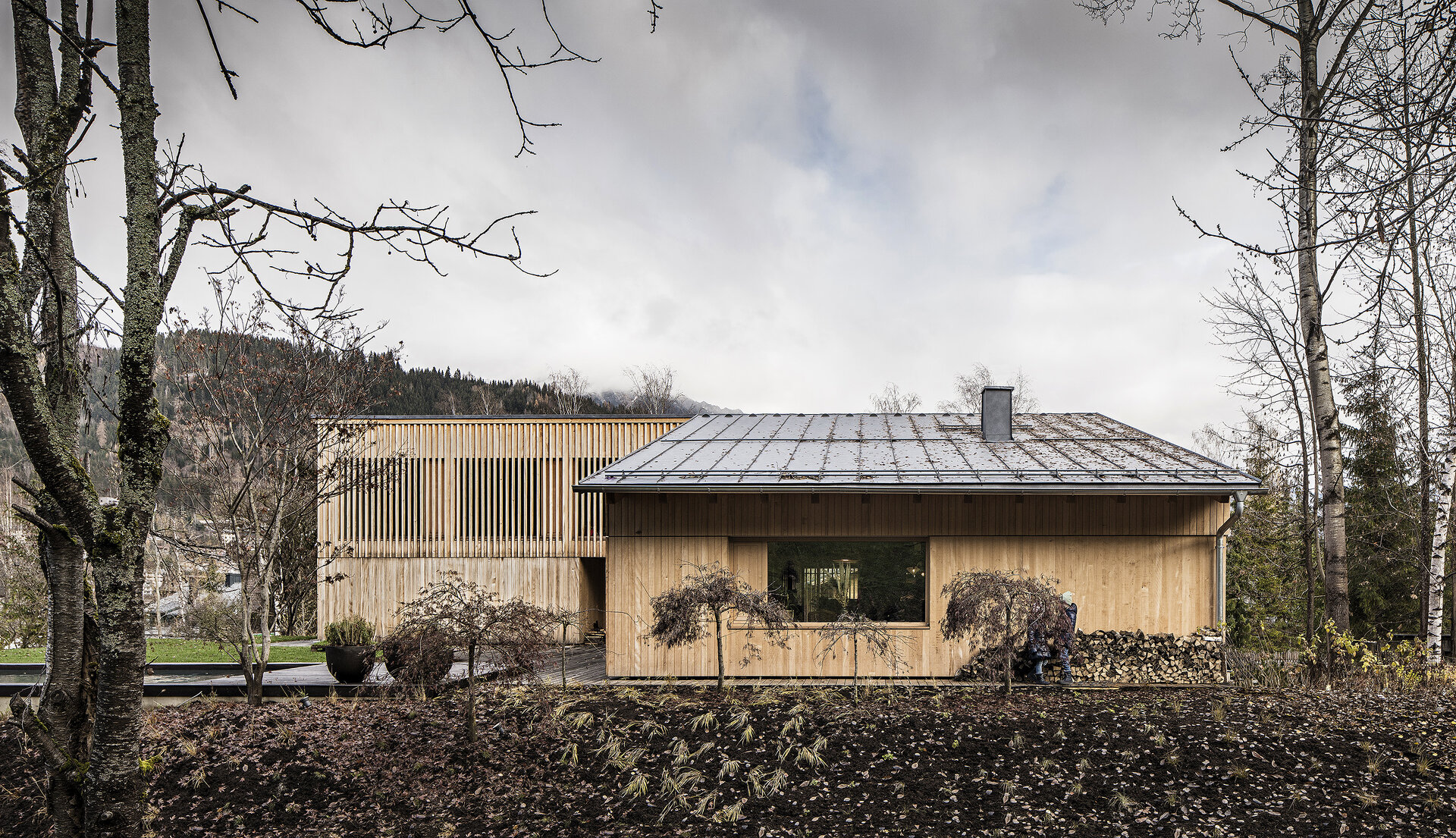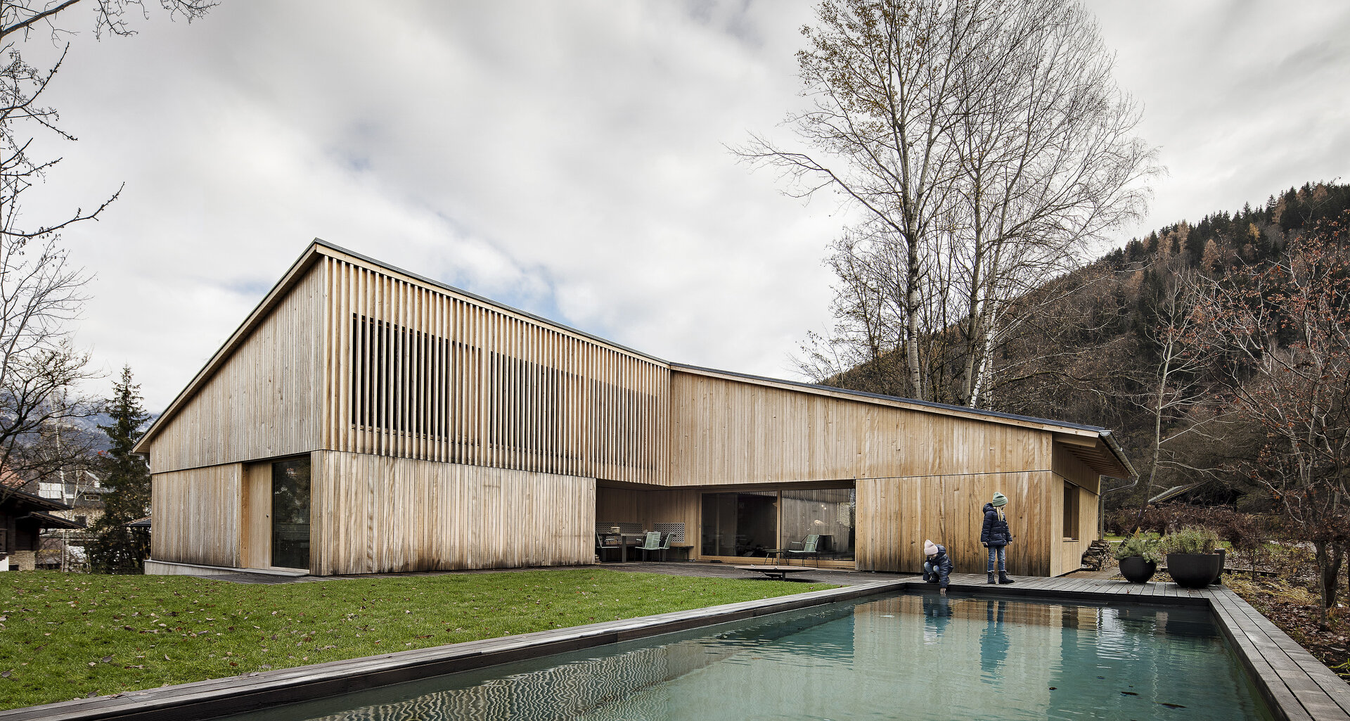 Aus den Rahmenbedingungen, die sich aus der Lage des Grundstücks ergeben, sowie aus den Vorgaben der sechsköpfigen Familie wurde ein schlichter Baukörper entwickelt, der sensibel auf den Kontext reagiert und diesen auch geschickt für die räumlichen Qualitäten des Hauses nutzt. Die traditionelle Bauform des Ennstals wird dabei in ihrer Grundtypologie aufgenommen und der Aufgabe gemäß neu interpretiert.