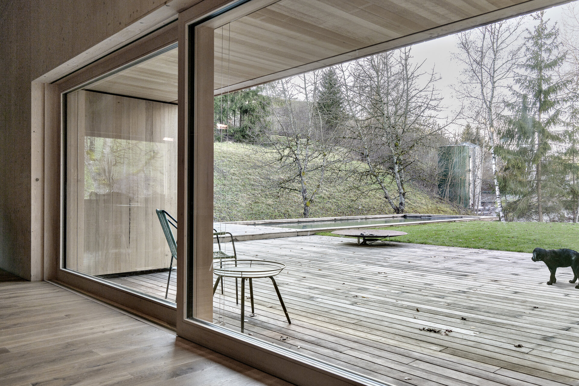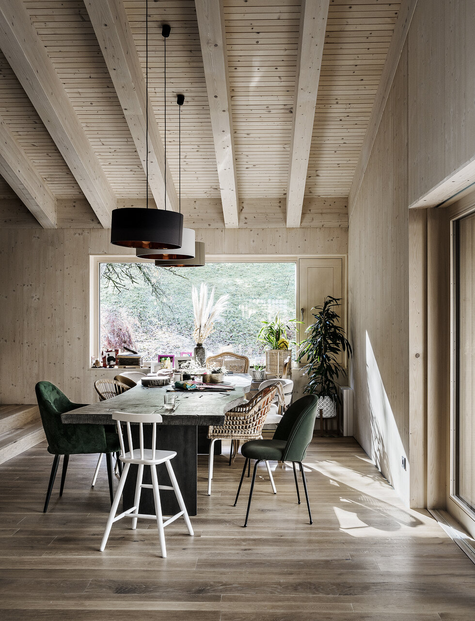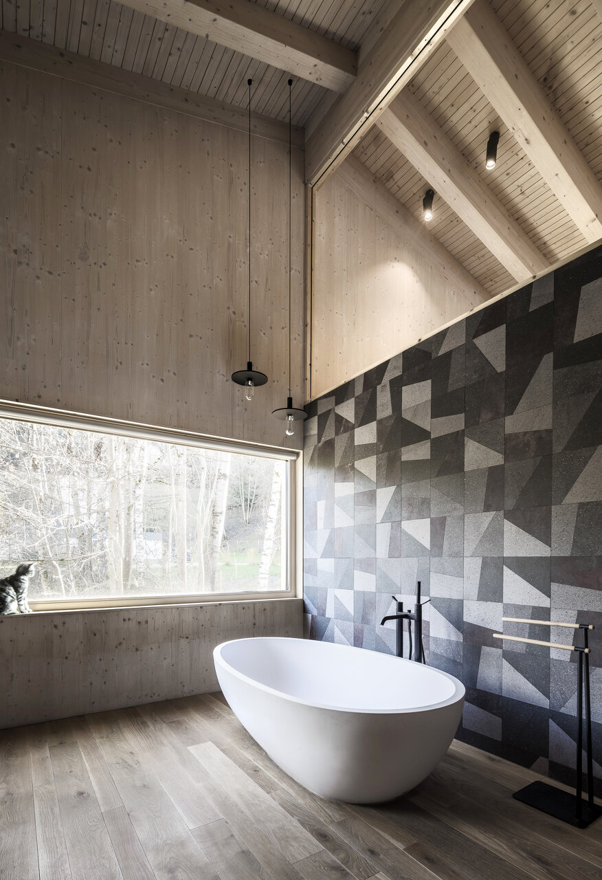 So erhalten die verschiedenen Räume und Nutzungen ihre jeweils richtige Position im Wohnverband, auch wenn viele Aufenthaltsbereiche zur Aussicht hin nach Norden hin ausgerichtet sind; sie reagieren auf die unterschiedlichen Freiraumqualitäten auf dem Grundstück. Präzise gesetzte Öffnungen unterstützen den Dialog zwischen Innen und Außen.