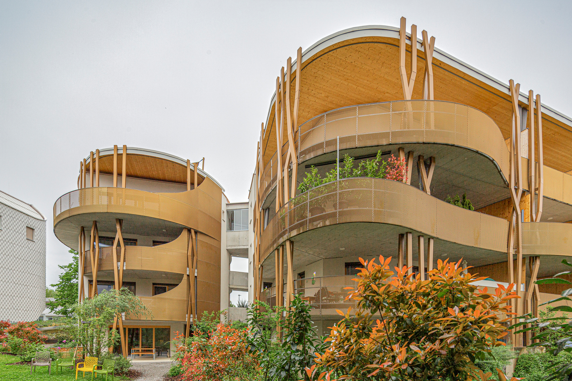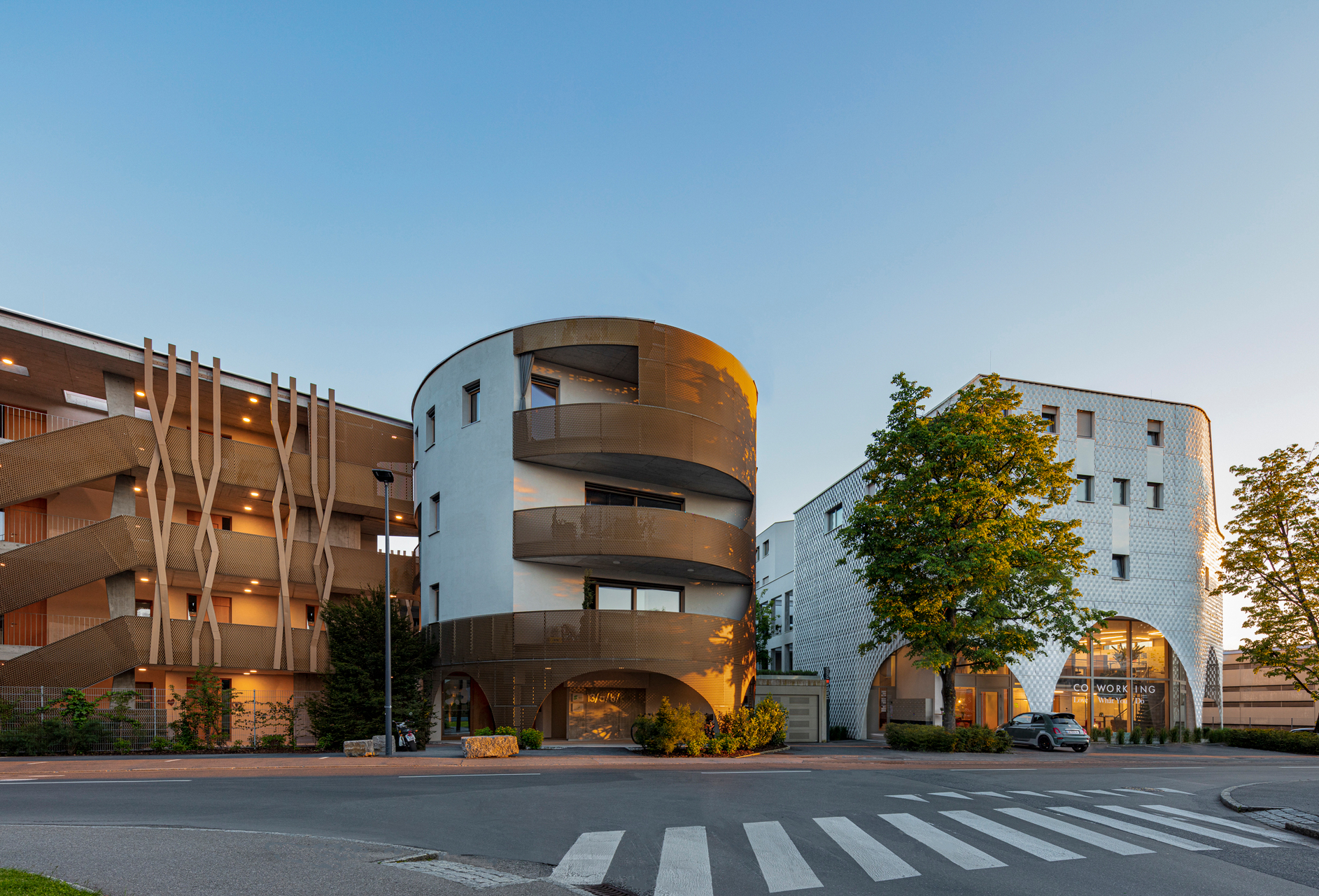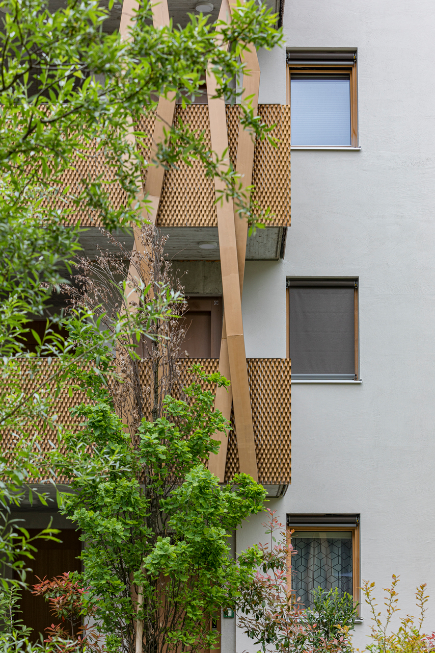 Die Gestaltung reflektiert die Geschichte des Ortes und des Strickmodenproduzenten Maselli. Die Streckmetallfassaden stiften Identität und nehmen textile Motive auf. Zwei Säulenpaare „stricken“ sich durch die horizontal geschwungenen Terrassen, für die sie auch tragend wirken. Im Norden steifen sie die tiefen Zugangsbereiche und das Stiegenhaus aus. Kein Säulenpaar und kein Haus gleicht dem anderen.
