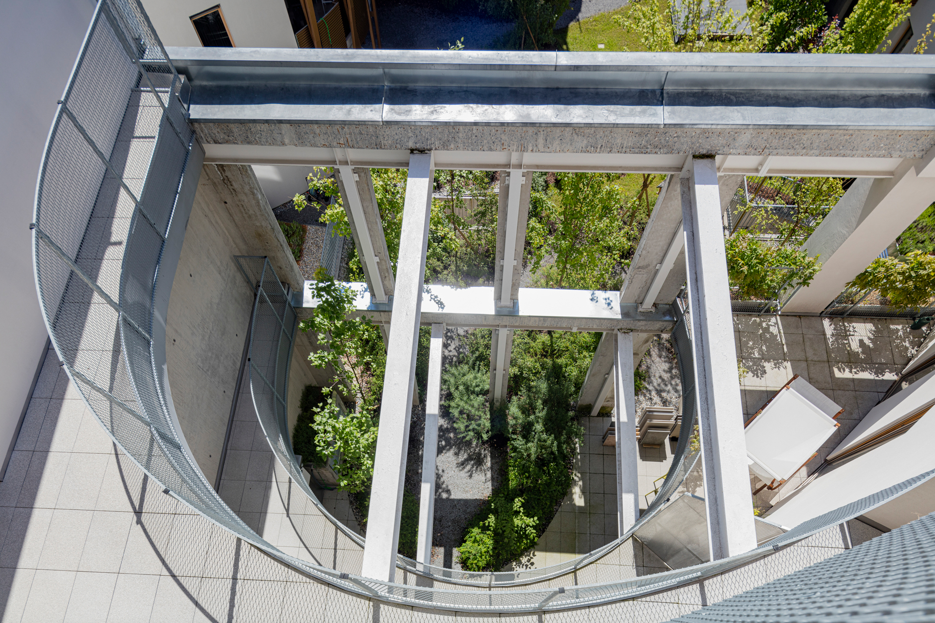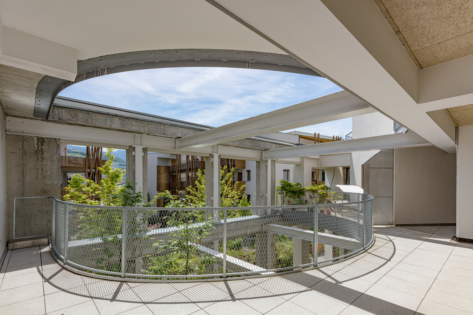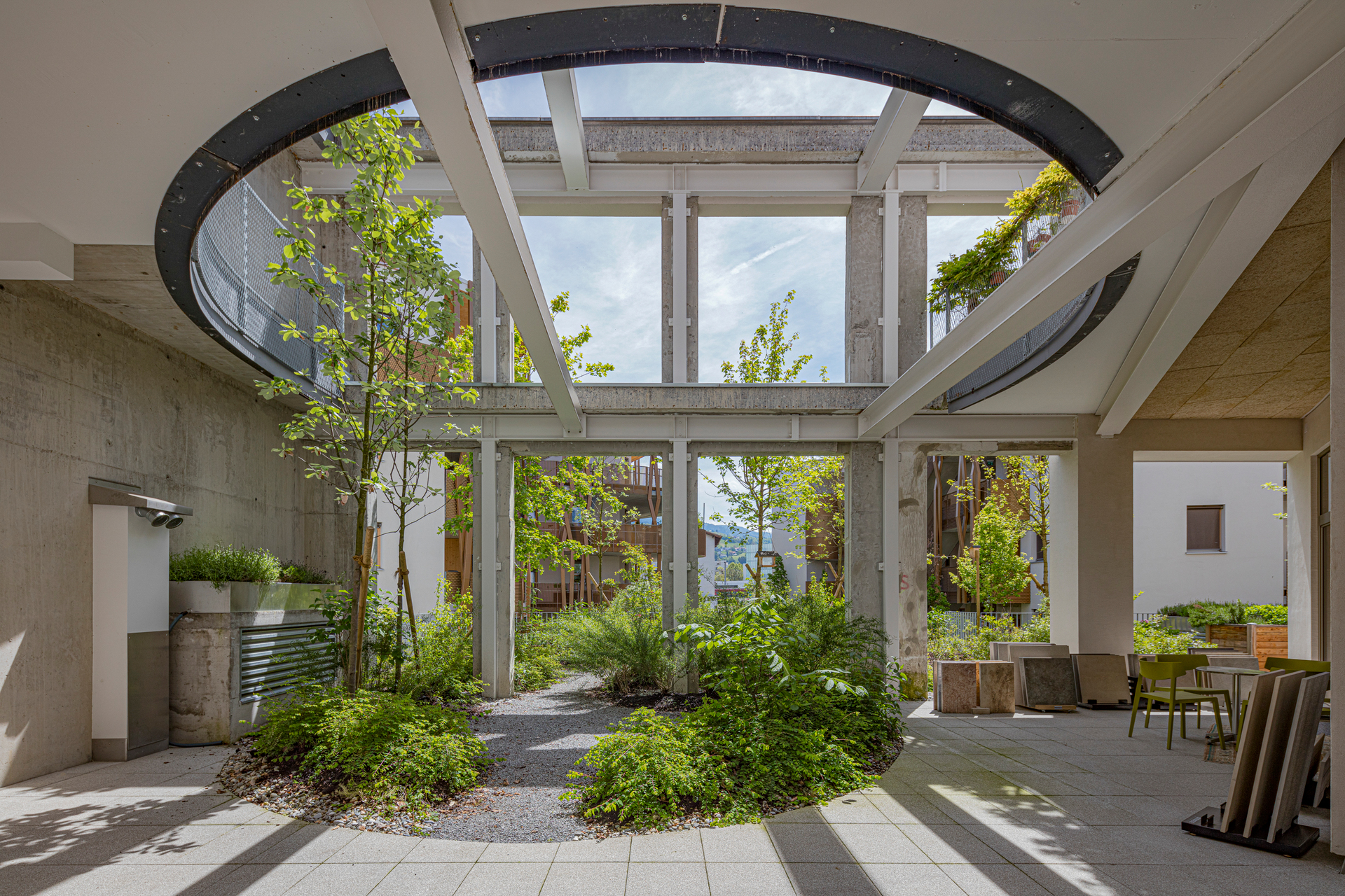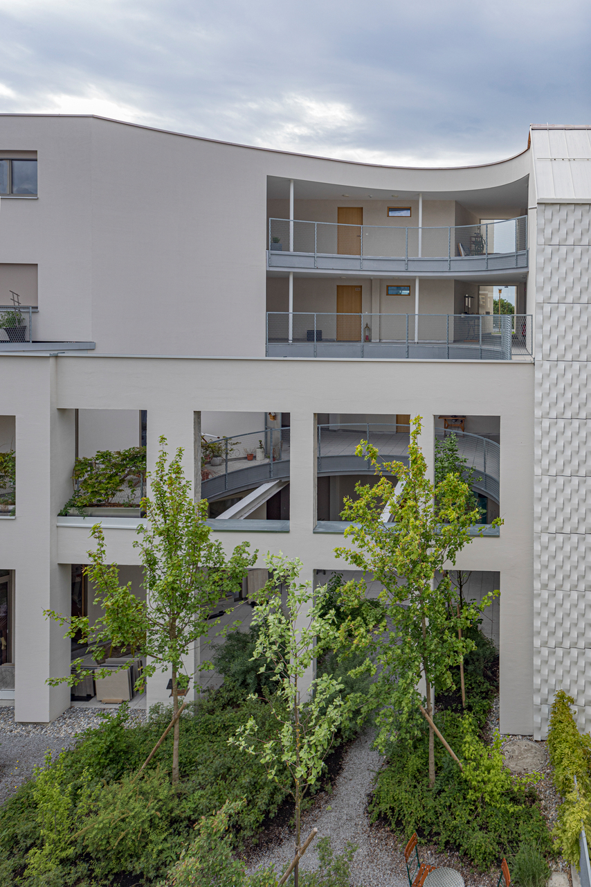 Die Gebäude sind so gesetzt, dass ein innenliegender Garten entsteht, den ein großer Einschnitt im ausgebauten Bestand um einen intimeren Innenhof erweitert. Dieser lädt als gemeinsamer überdachter Freiraum mit Blick ins Grüne zum Verweilen ein und durchzieht als Lichthof das ganze Haus. So bringt er auch Sonne und Außenbezug in die Erschließungsbereiche. Der angrenzende Gemeinschaftsraum ist von allen nutz- und für besondere Anlässe zu buchbar.