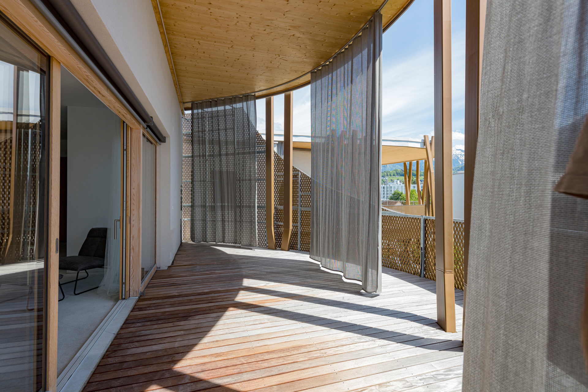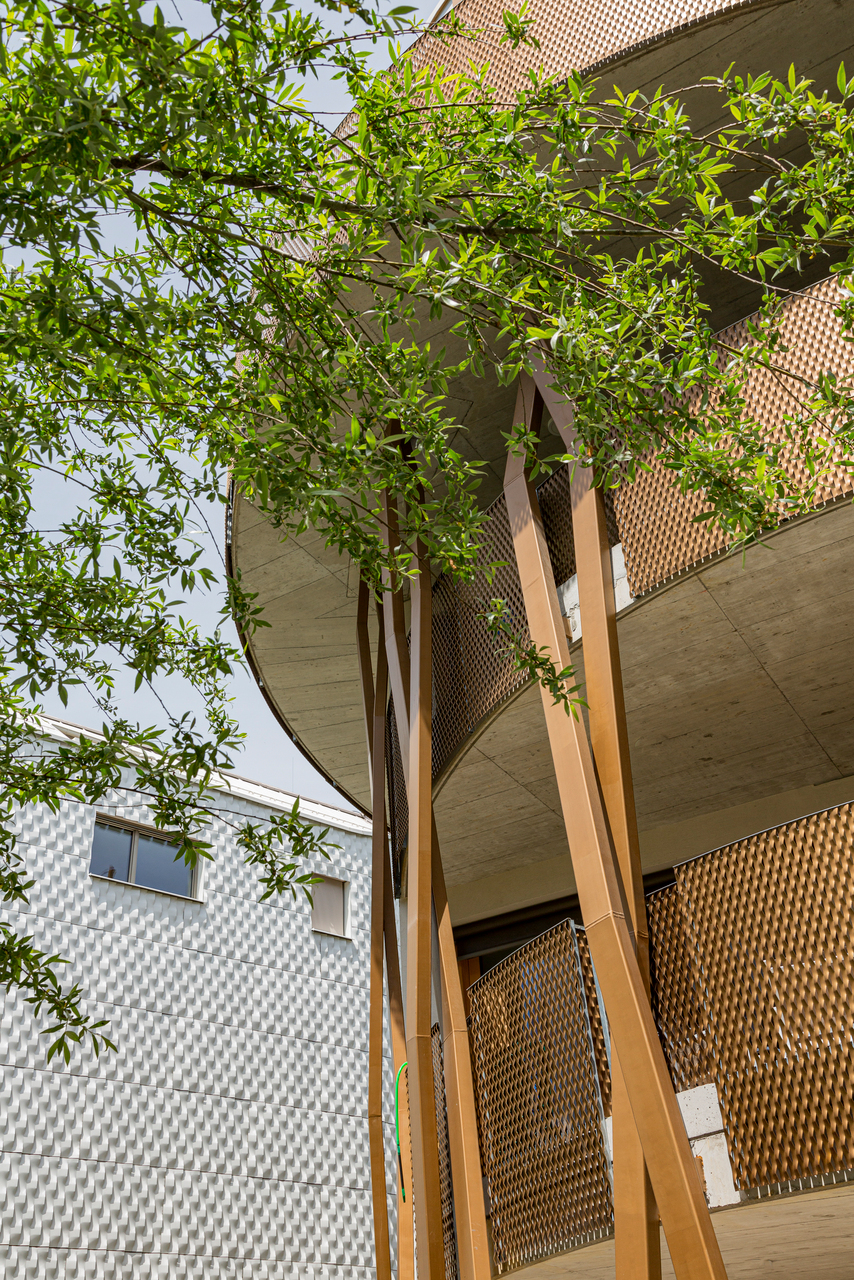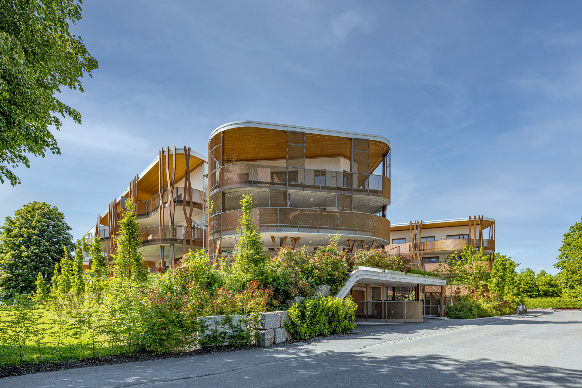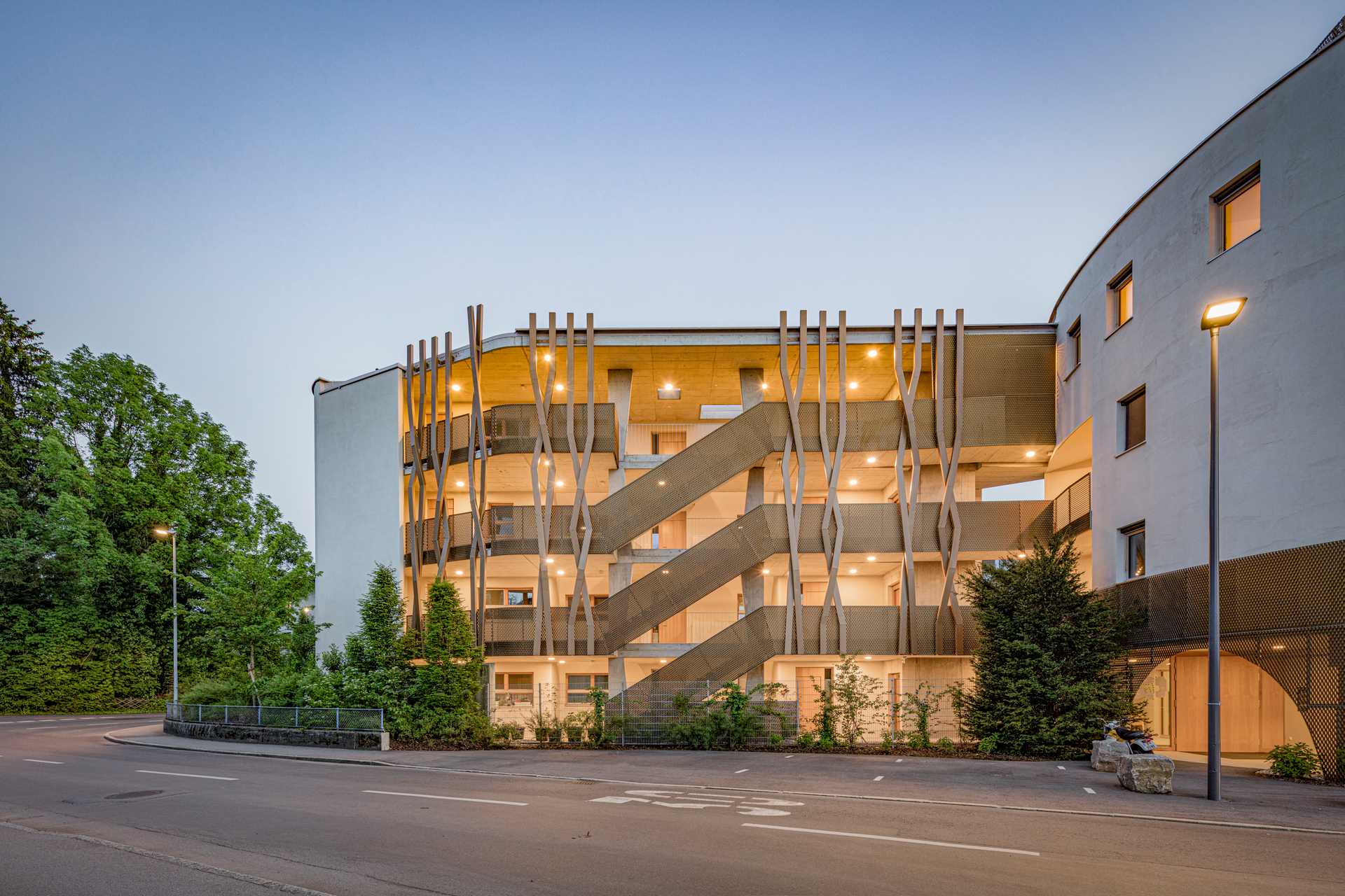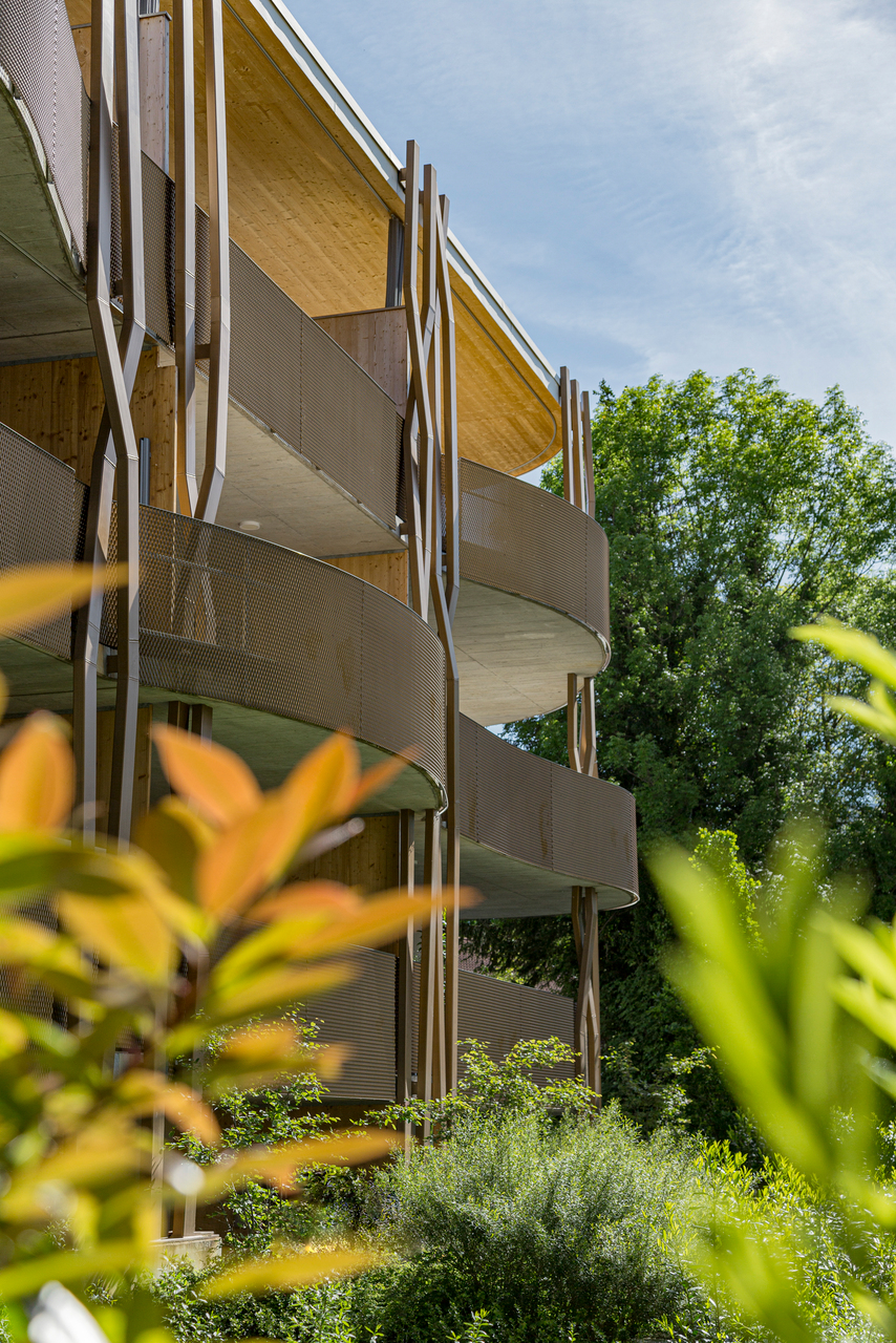 Die Gebäude sind so gesetzt, dass ein innenliegender Garten entsteht, den ein großer Einschnitt im ausgebauten Bestand um einen intimeren Innenhof erweitert. Dieser lädt als gemeinsamer überdachter Freiraum mit Blick ins Grüne zum Verweilen ein und durchzieht als Lichthof das ganze Haus. So bringt er auch Sonne und Außenbezug in die Erschließungsbereiche. Der angrenzende Gemeinschaftsraum ist von allen nutz- und für besondere Anlässe zu buchbar.