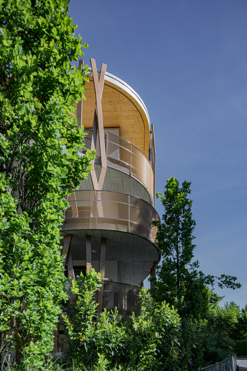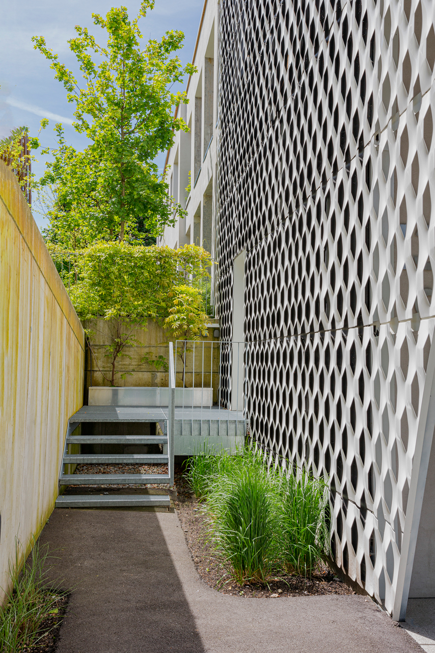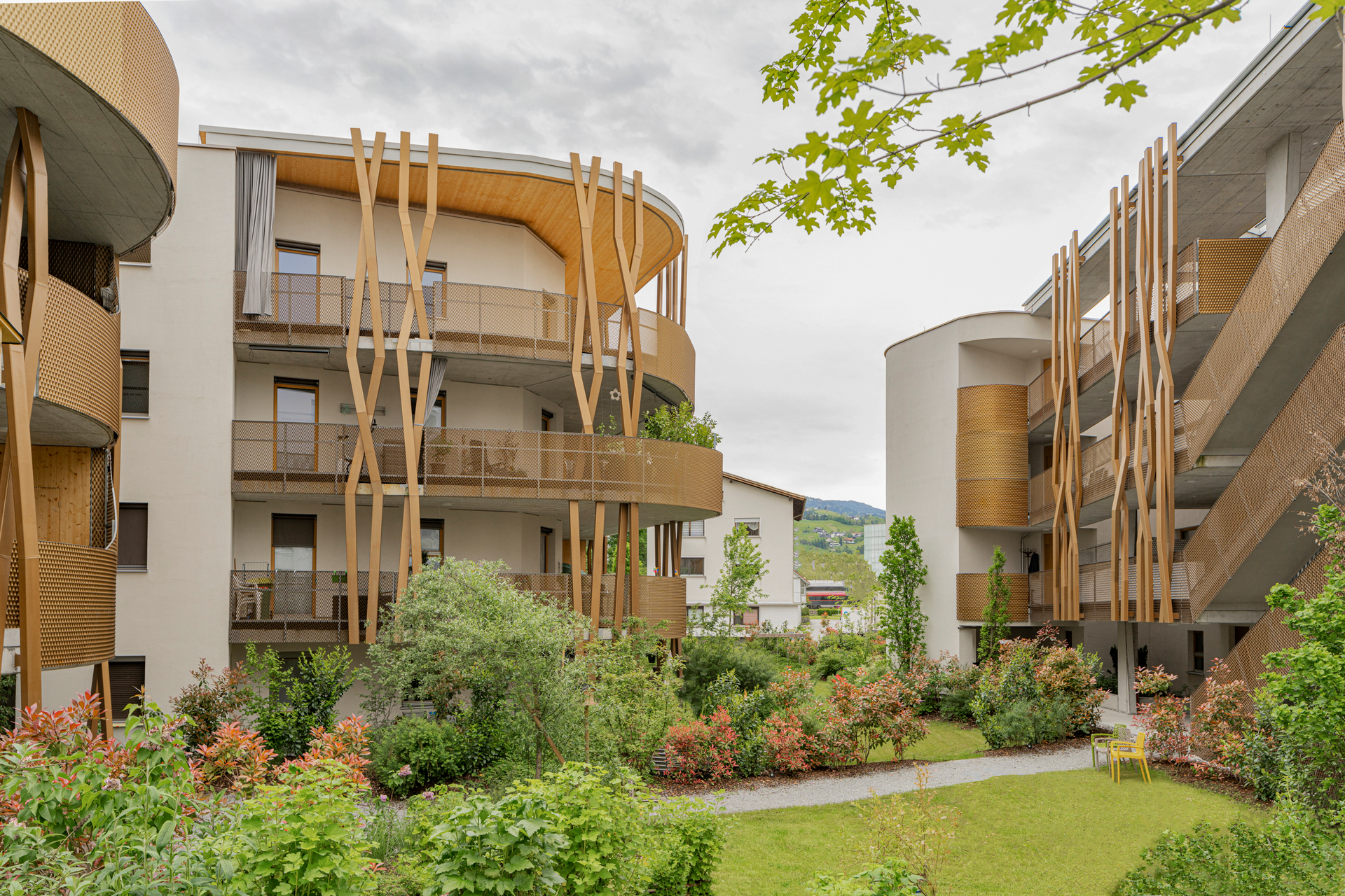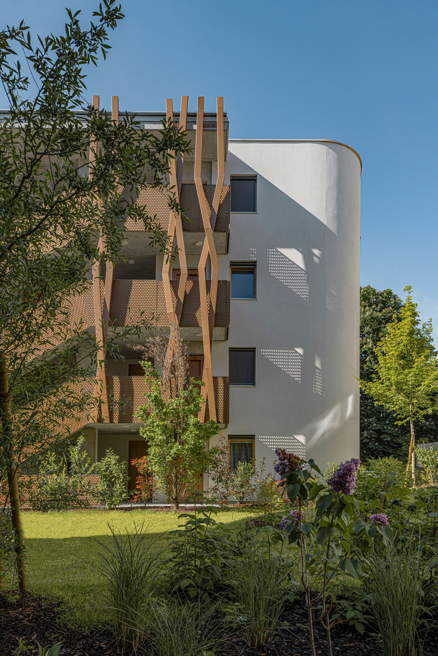 Die Gebäude schaffen einander gegenseitig spezifische Blickachsen und erzeugen Rückzugsorte im Garten. Die Wohnungen haben in den oberen Geschoßen eine Raumhöhe von 2,80 m, ihre Zugänge sind zusätzlich durch Brücken abgesetzt, Lichtöffnungen leiten das Licht bis in das Erdgeschoß. Die großzügigen Stiegenhausbereiche erzeugen Privatheit und ermöglichen Begegnung. Zwei Elektroautos in der Garage runden das Angebot ab. (Text: Isabella Marboe, nach einem Text der Architekten)