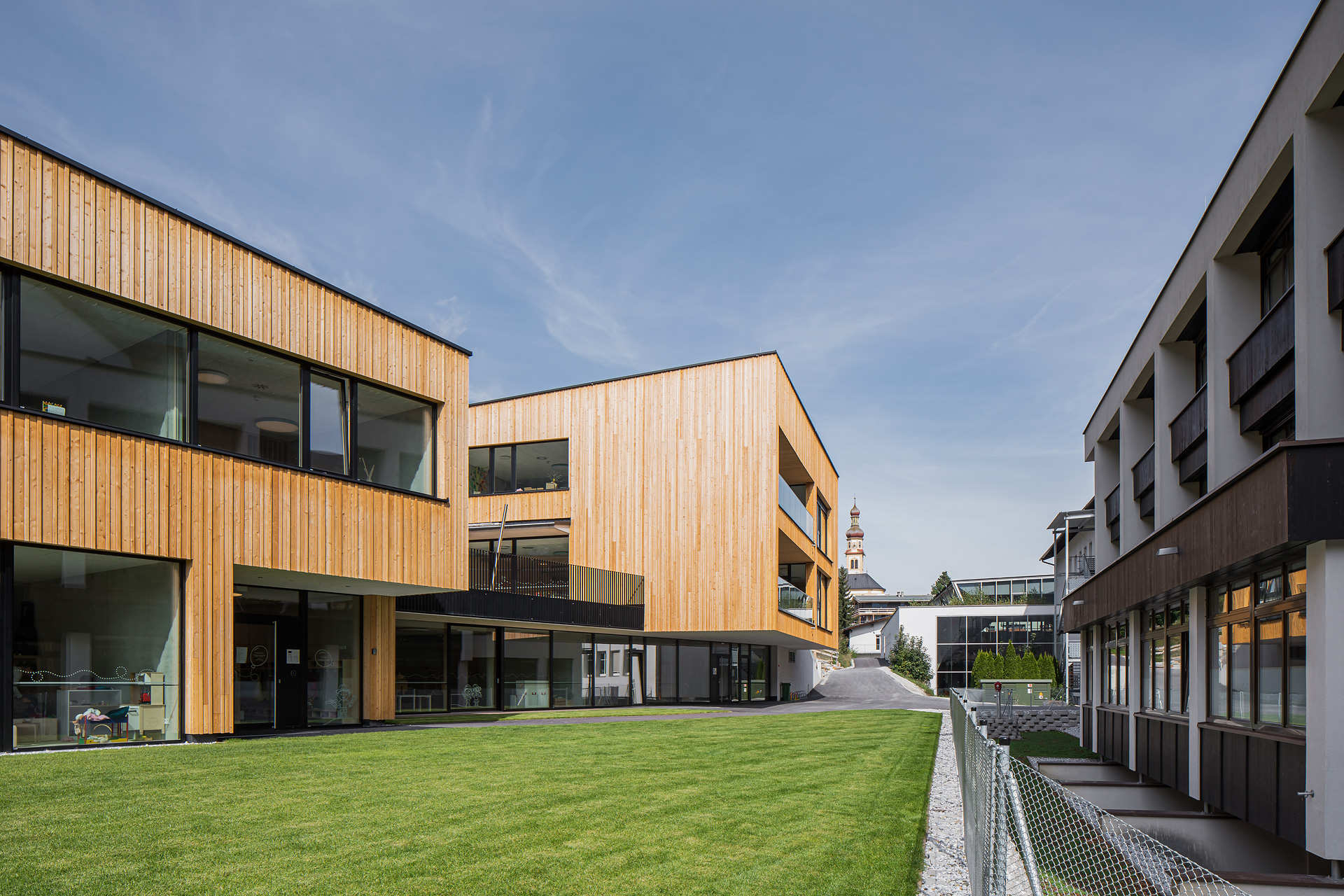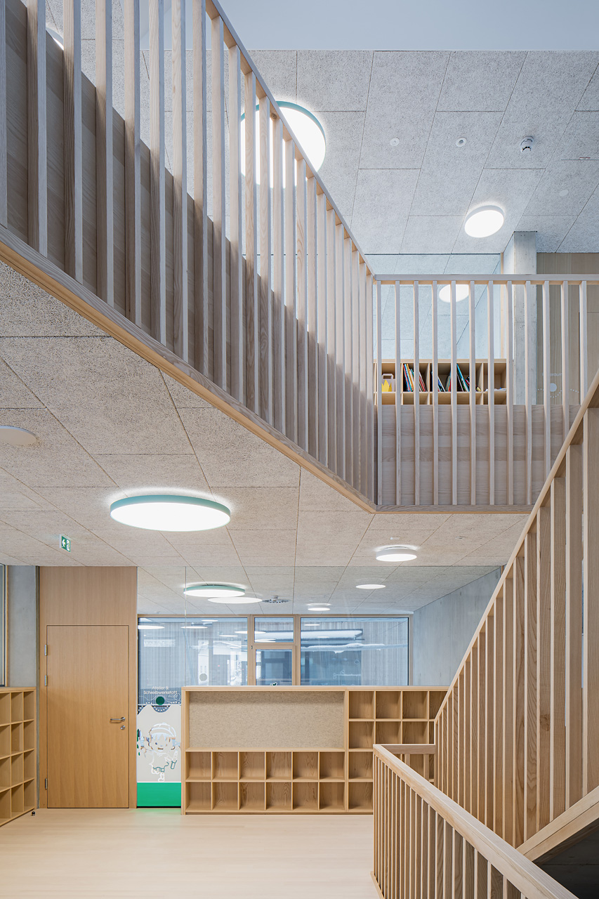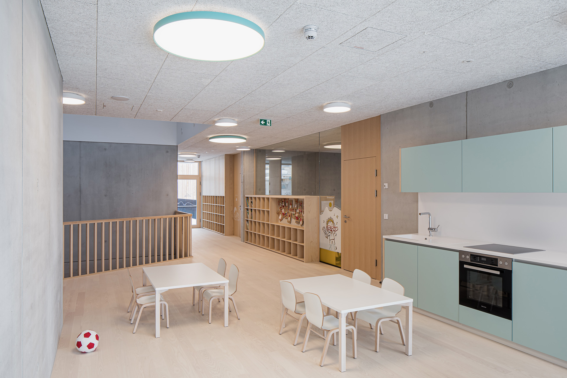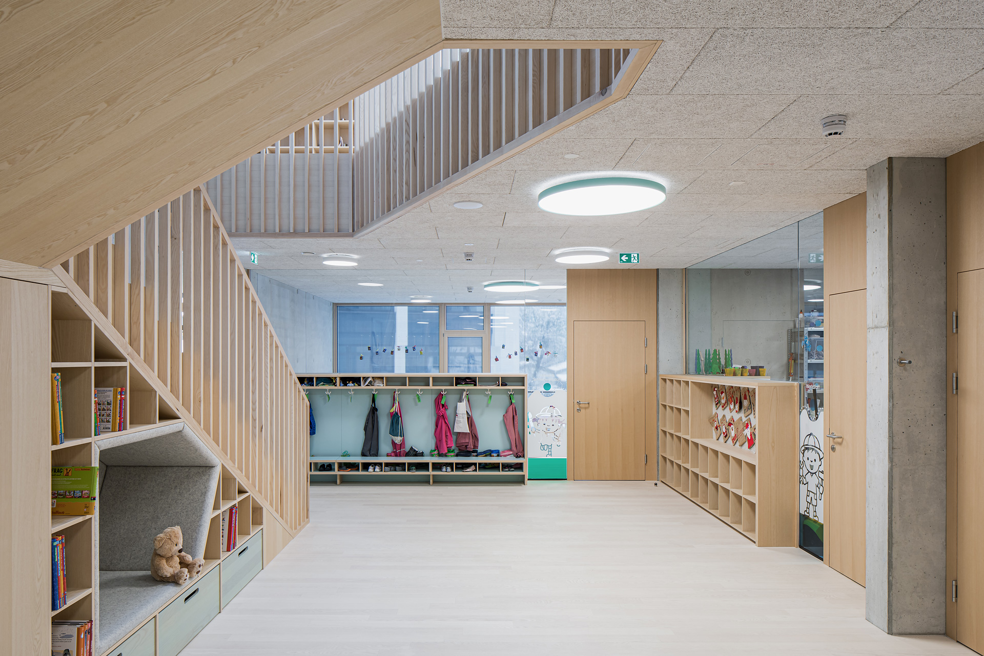 Der Hauptzugang und die gemeinsamen Bereiche wie Mittagstisch und Verwaltung liegen in einer massiven Sockelzone, jeweils vier Kindergartengruppen sind in zwei in sich autarken und versetzt nebeneinander angeordneten Holzbaukörpern untergebracht. Damit konnte zum einen der Wunsch der Betreiber:innen nach zwei getrennten Einheiten erfüllt werden, zum anderen fügt sich der Neubau durch die Aufgliederung des Volumens in zwei Häuser in das kleinteilig strukturierte Umfeld ein. Indem der nördliche Baukörper erhöht auf dem Sockel steht, konnte hier die Belichtungssituation wesentlich verbessert werden. Die Gruppen- und Nebenräume verteilen sich jeweils über die beiden Geschoße, in deren Kern eine über den Luftraum natürlich belichtete, geschoßübergreifende Bewegungszone liegt. Den Übergang zu den Gruppenräumen bilden raumhohe Möbelelemente, die Durchblicke zwischen Innen- und Außenraum erlauben.