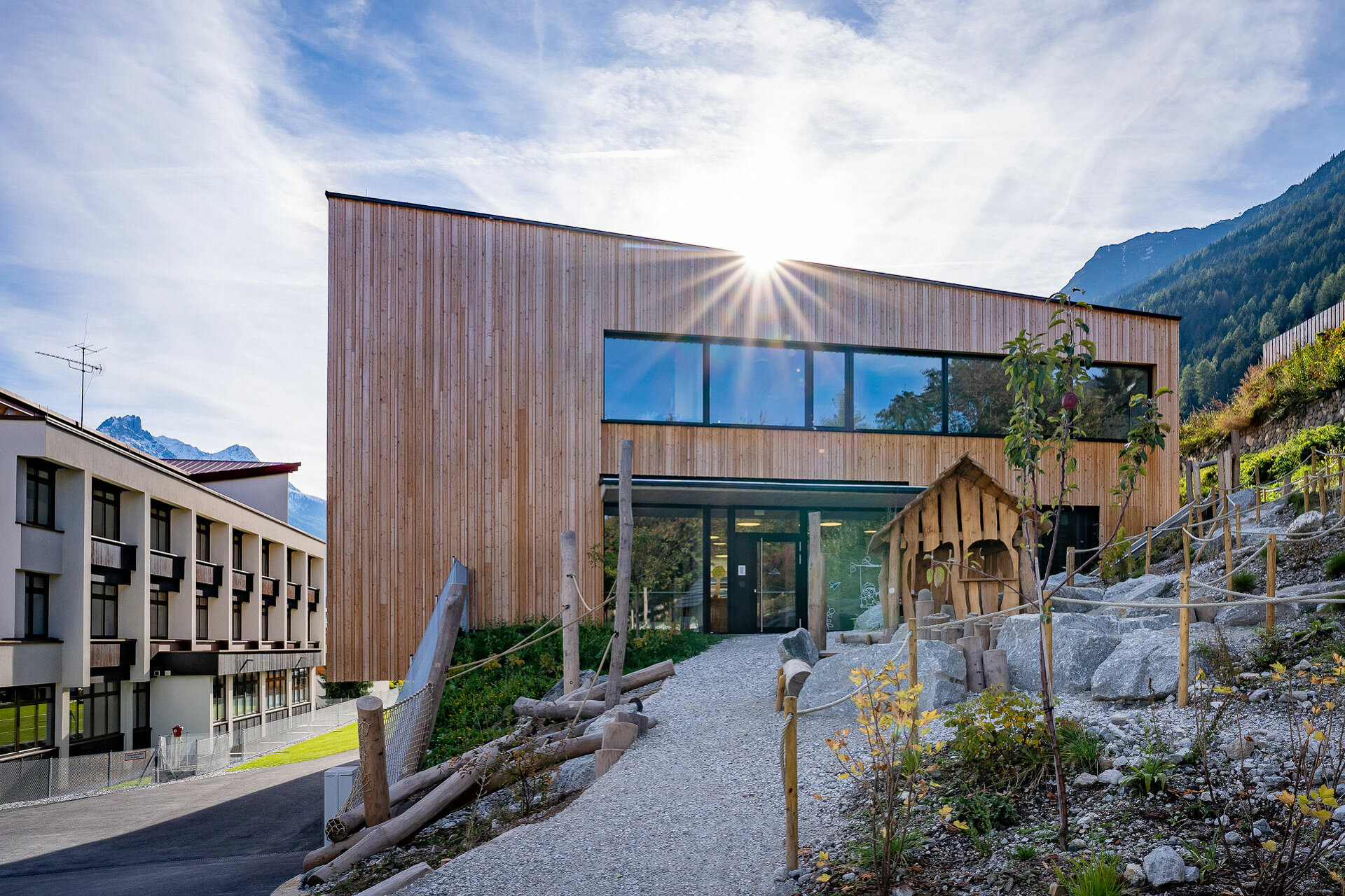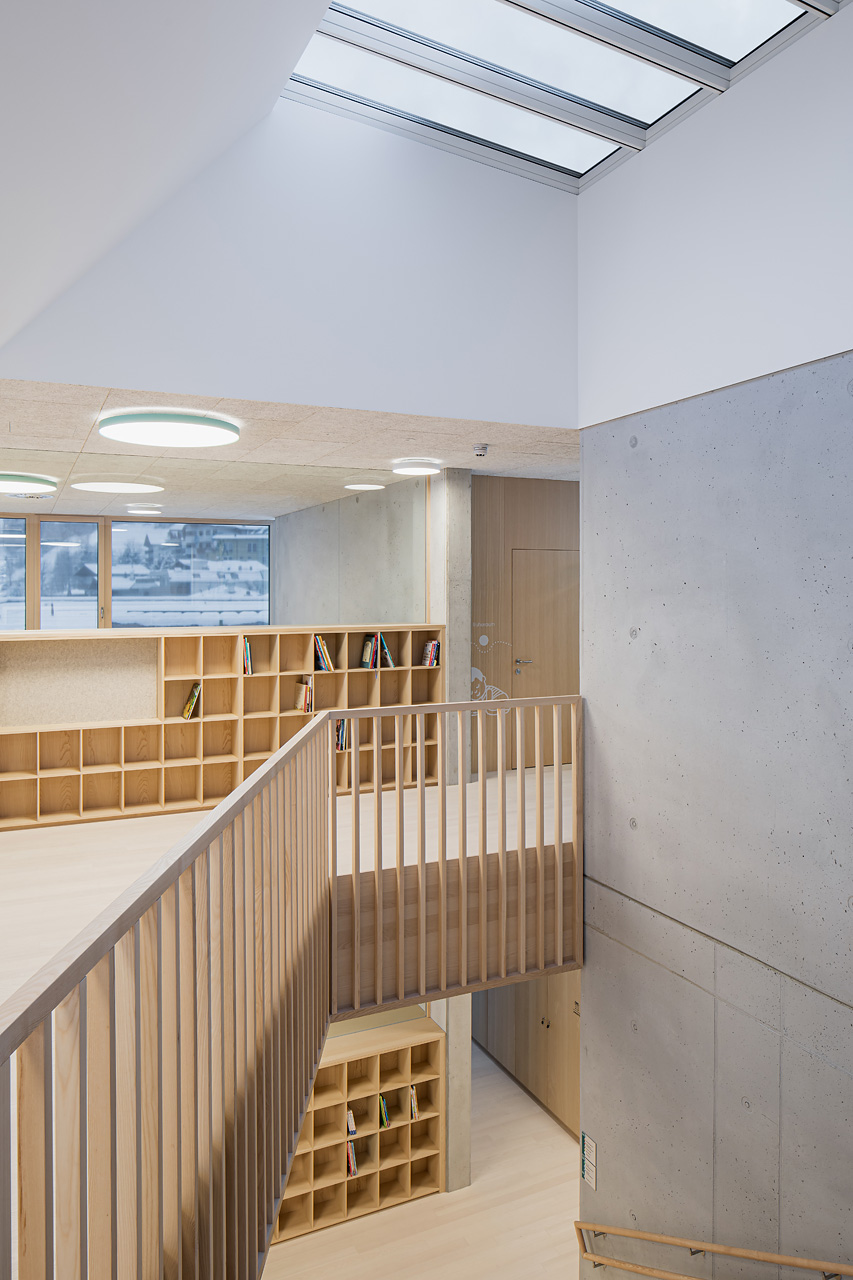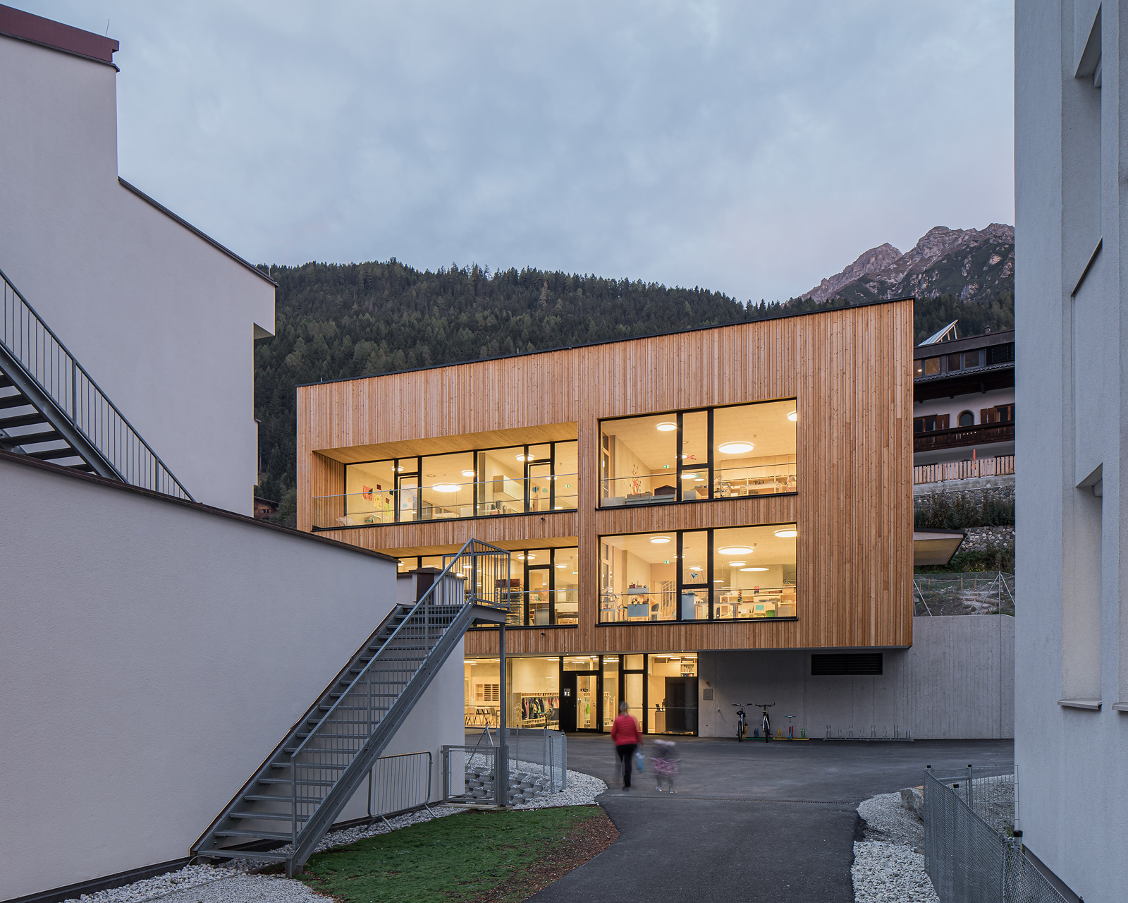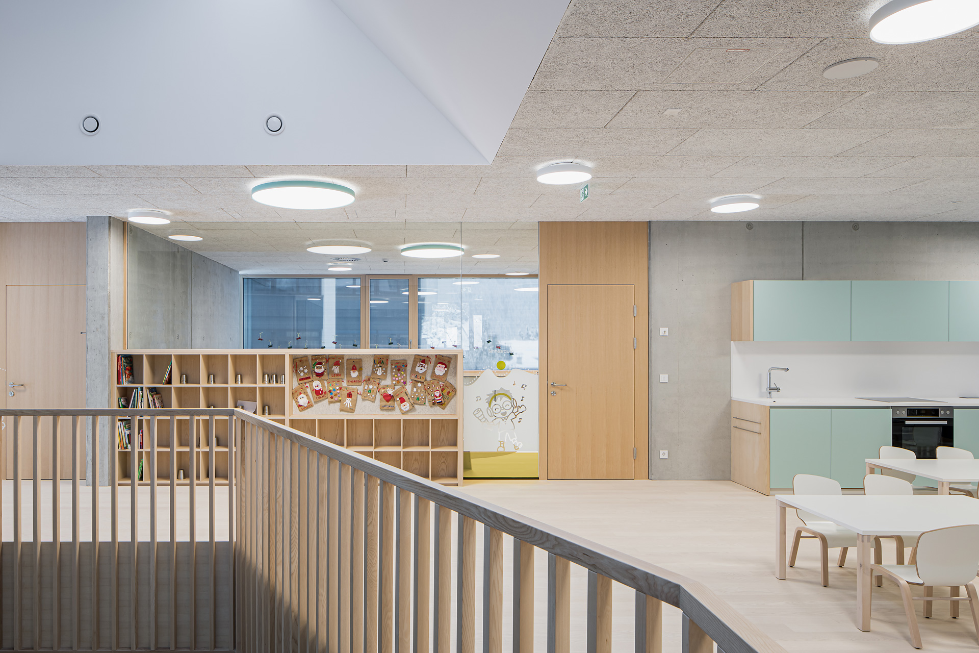 Der Hauptzugang und die gemeinsamen Bereiche wie Mittagstisch und Verwaltung liegen in einer massiven Sockelzone, jeweils vier Kindergartengruppen sind in zwei in sich autarken und versetzt nebeneinander angeordneten Holzbaukörpern untergebracht. Damit konnte zum einen der Wunsch der Betreiber:innen nach zwei getrennten Einheiten erfüllt werden, zum anderen fügt sich der Neubau durch die Aufgliederung des Volumens in zwei Häuser in das kleinteilig strukturierte Umfeld ein. Indem der nördliche Baukörper erhöht auf dem Sockel steht, konnte hier die Belichtungssituation wesentlich verbessert werden. Die Gruppen- und Nebenräume verteilen sich jeweils über die beiden Geschoße, in deren Kern eine über den Luftraum natürlich belichtete, geschoßübergreifende Bewegungszone liegt. Den Übergang zu den Gruppenräumen bilden raumhohe Möbelelemente, die Durchblicke zwischen Innen- und Außenraum erlauben.