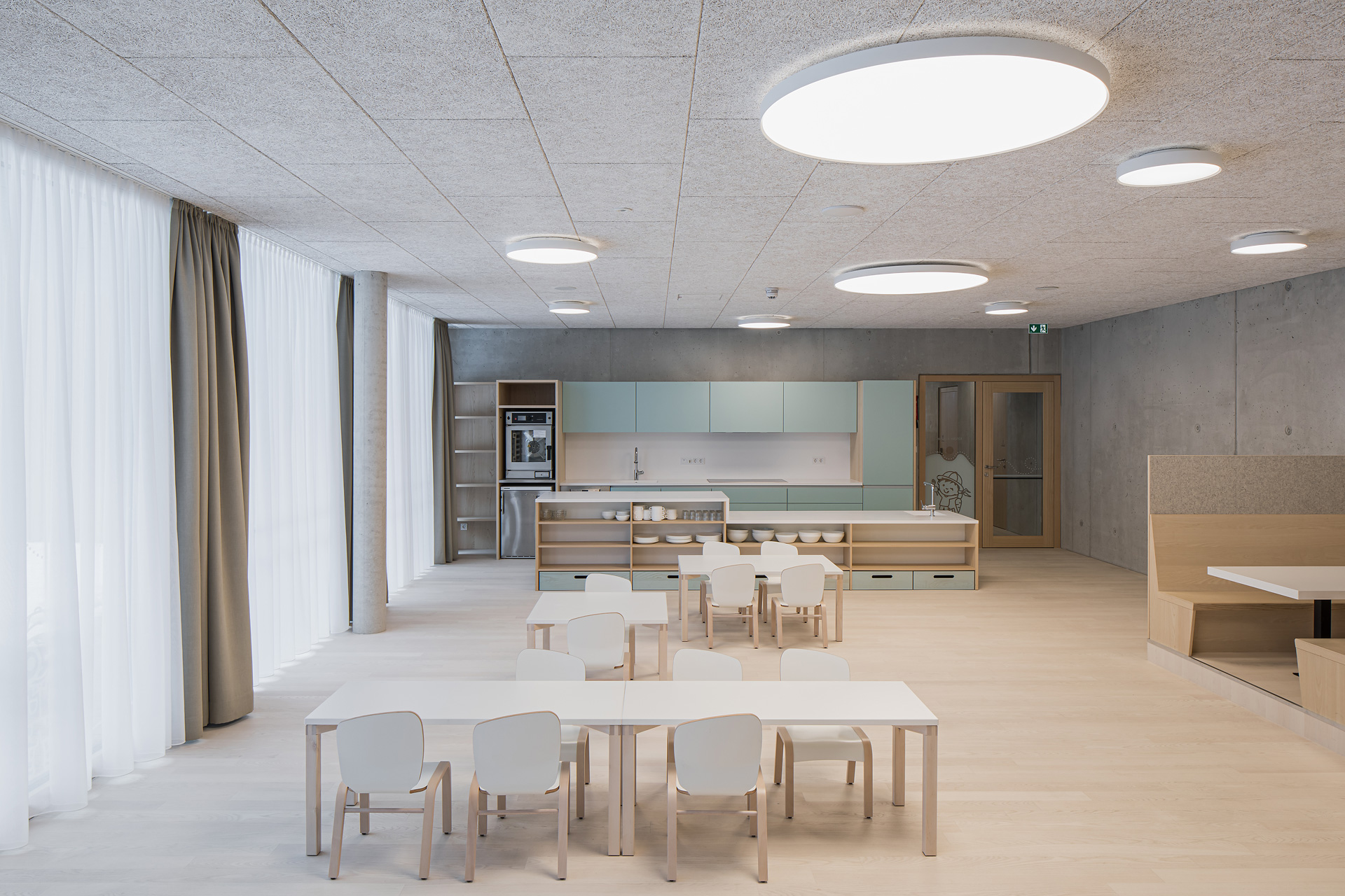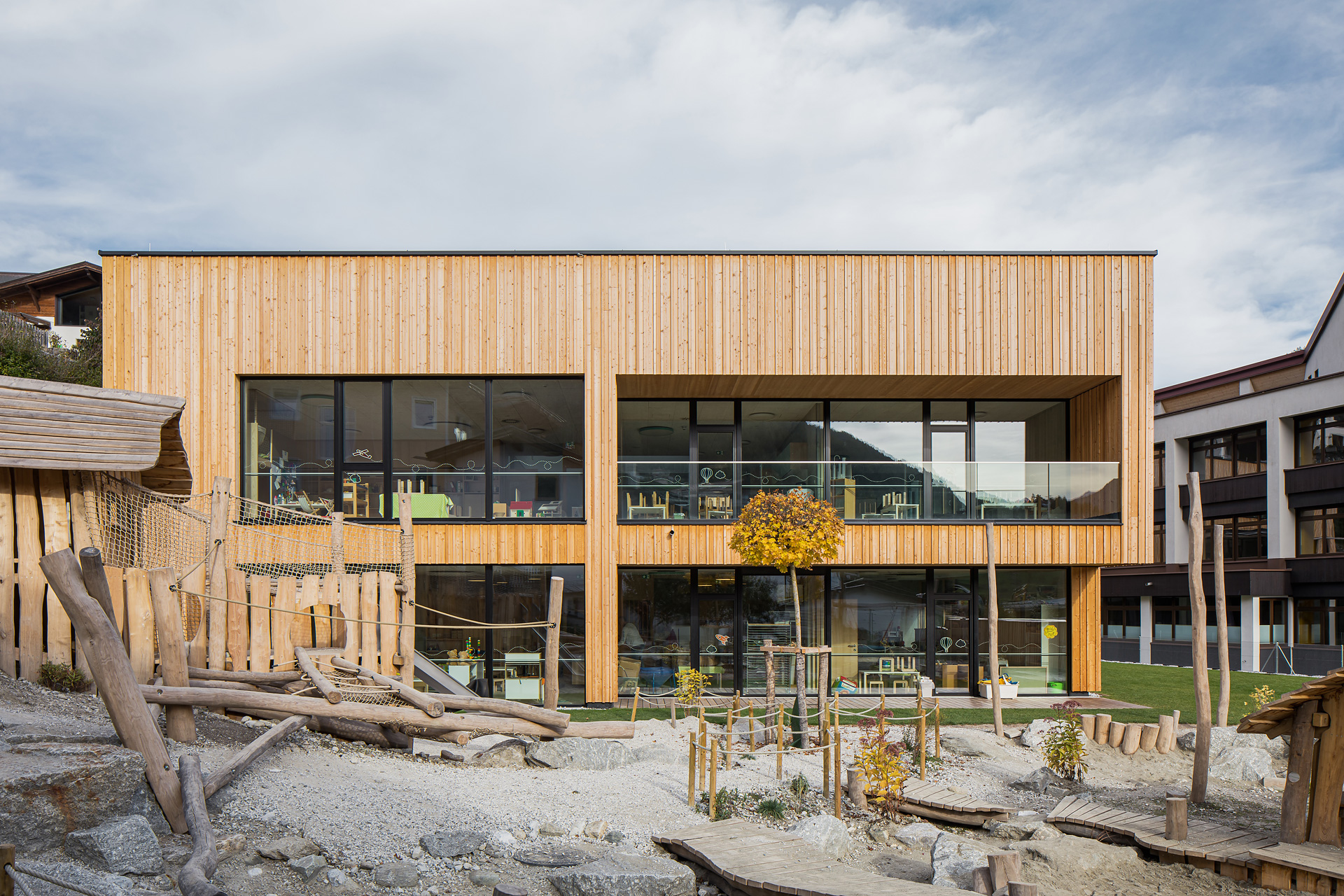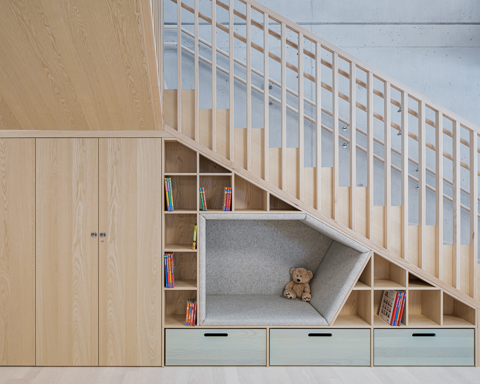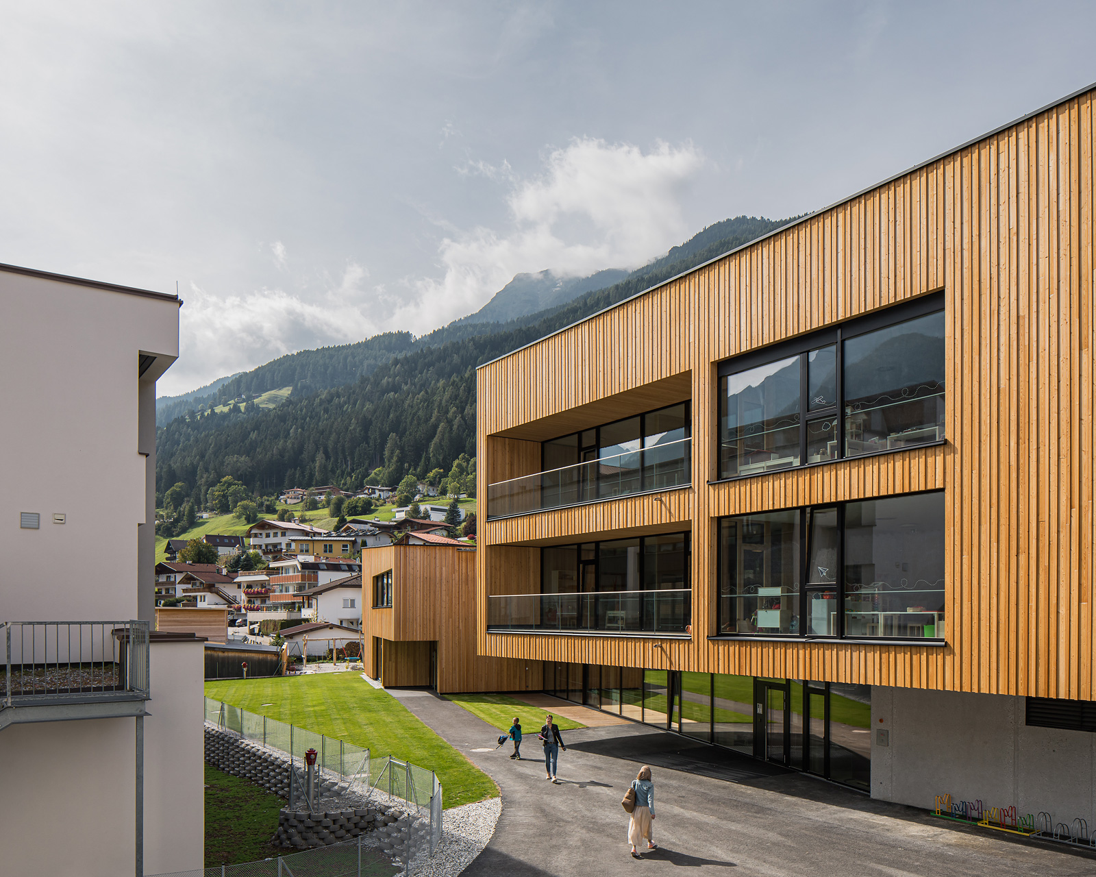 Der Hauptzugang und die gemeinsamen Bereiche wie Mittagstisch und Verwaltung liegen in einer massiven Sockelzone, jeweils vier Kindergartengruppen sind in zwei in sich autarken und versetzt nebeneinander angeordneten Holzbaukörpern untergebracht. Damit konnte zum einen der Wunsch der Betreiber:innen nach zwei getrennten Einheiten erfüllt werden, zum anderen fügt sich der Neubau durch die Aufgliederung des Volumens in zwei Häuser in das kleinteilig strukturierte Umfeld ein. Indem der nördliche Baukörper erhöht auf dem Sockel steht, konnte hier die Belichtungssituation wesentlich verbessert werden. Die Gruppen- und Nebenräume verteilen sich jeweils über die beiden Geschoße, in deren Kern eine über den Luftraum natürlich belichtete, geschoßübergreifende Bewegungszone liegt. Den Übergang zu den Gruppenräumen bilden raumhohe Möbelelemente, die Durchblicke zwischen Innen- und Außenraum erlauben.