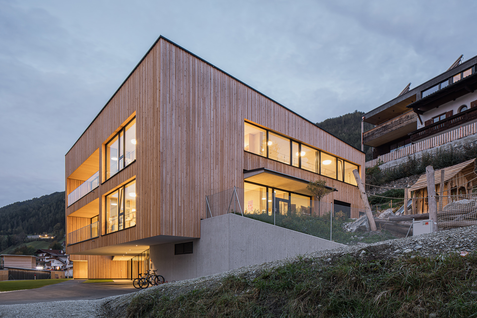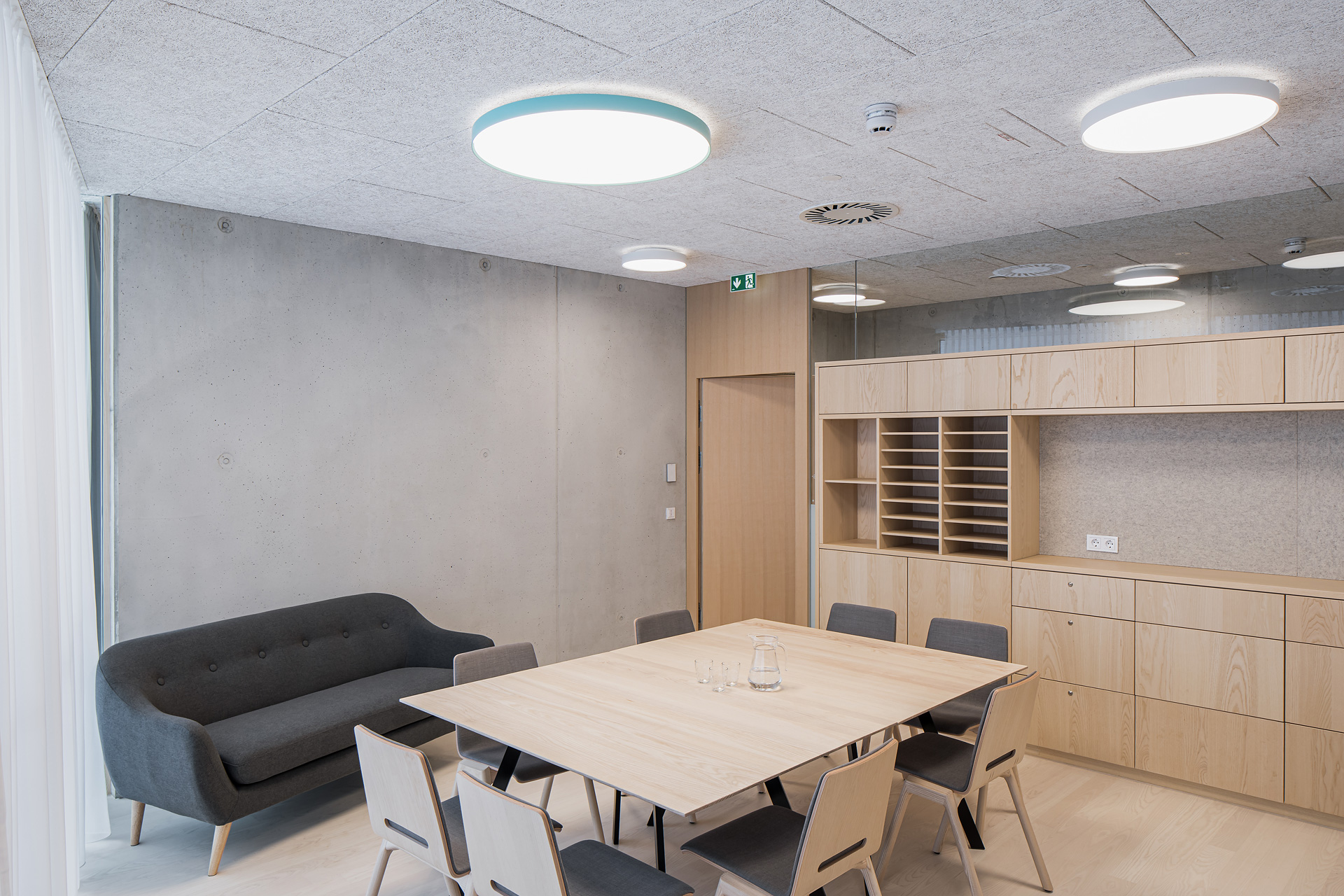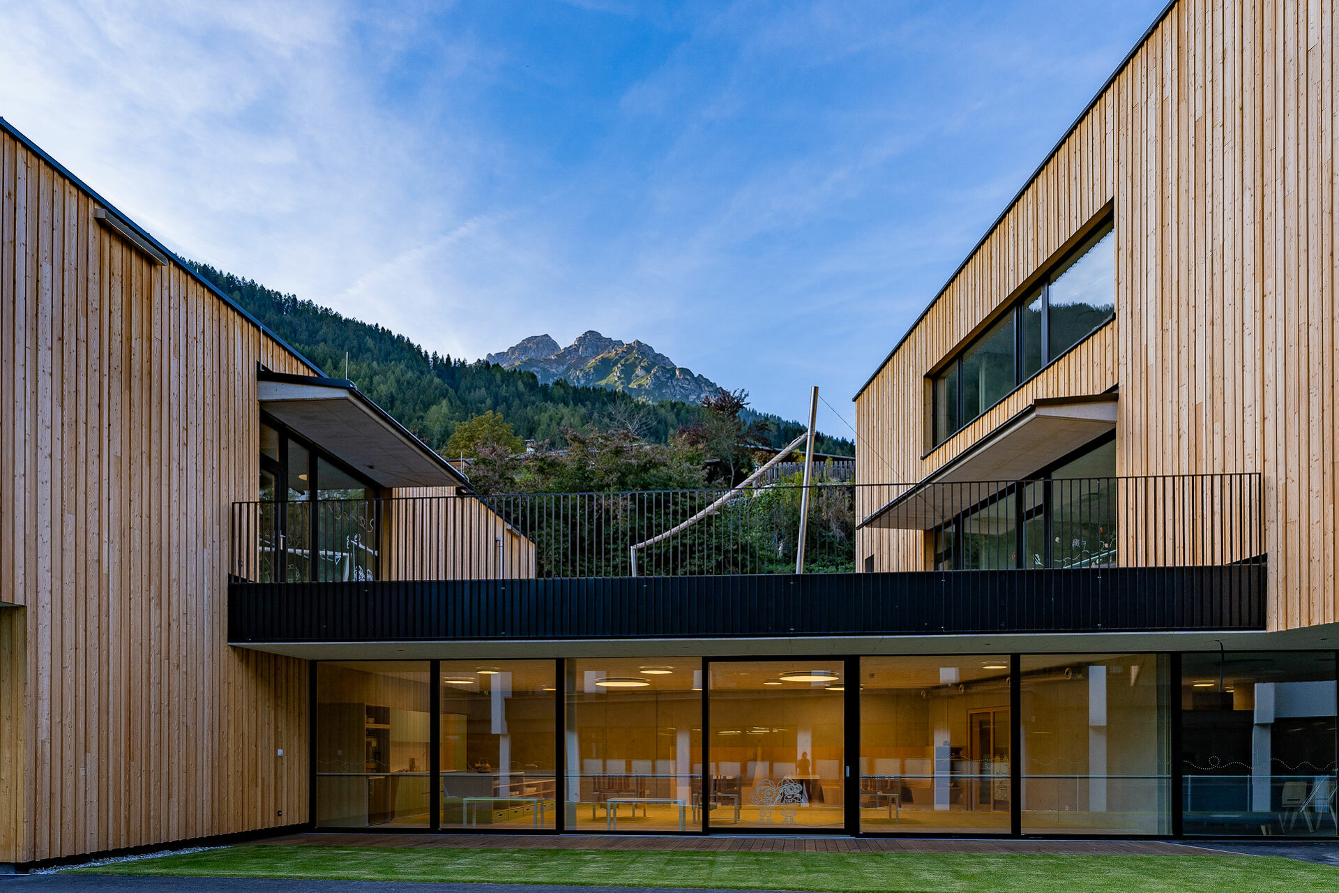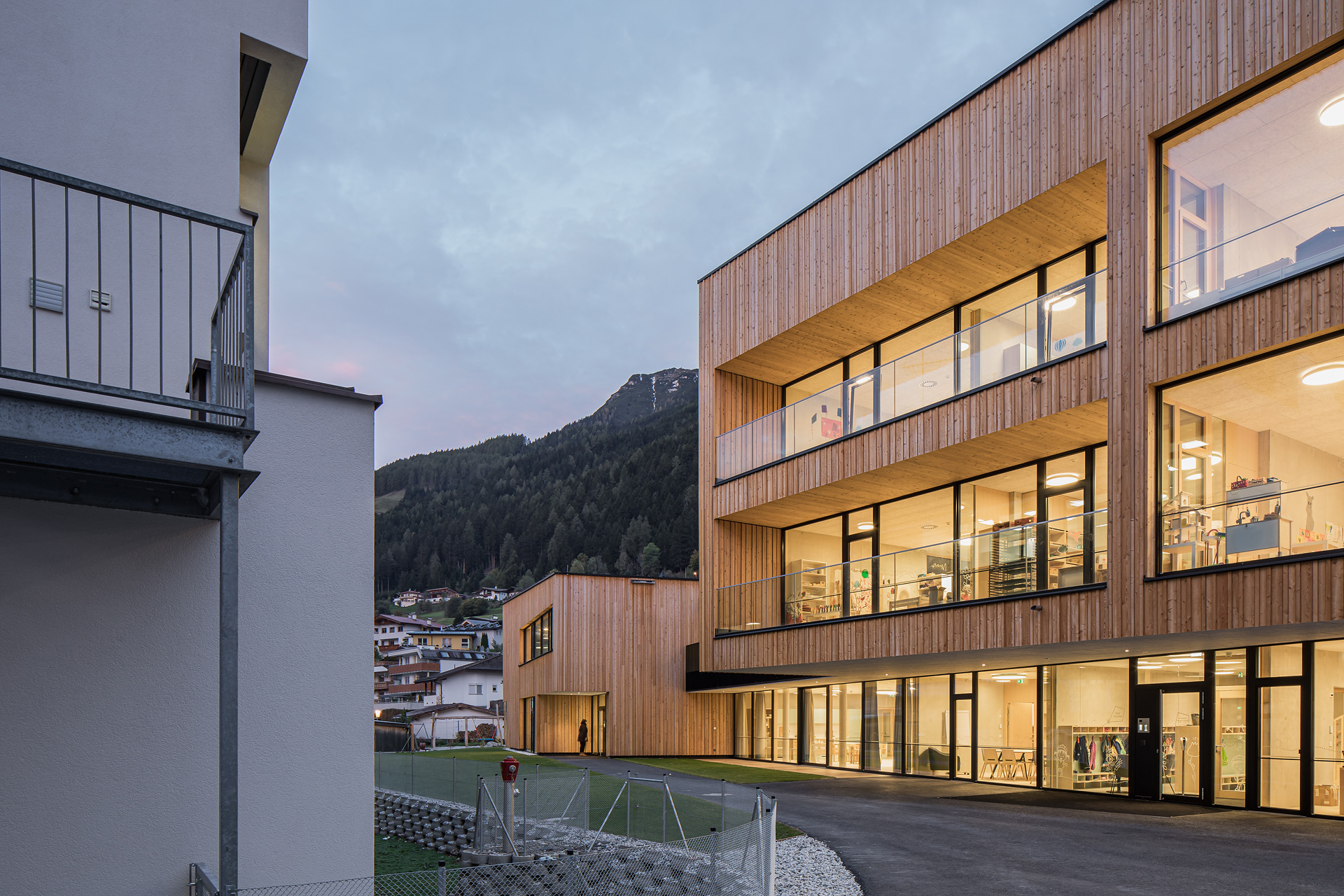 Der Hauptzugang und die gemeinsamen Bereiche wie Mittagstisch und Verwaltung liegen in einer massiven Sockelzone, jeweils vier Kindergartengruppen sind in zwei in sich autarken und versetzt nebeneinander angeordneten Holzbaukörpern untergebracht. Damit konnte zum einen der Wunsch der Betreiber:innen nach zwei getrennten Einheiten erfüllt werden, zum anderen fügt sich der Neubau durch die Aufgliederung des Volumens in zwei Häuser in das kleinteilig strukturierte Umfeld ein. Indem der nördliche Baukörper erhöht auf dem Sockel steht, konnte hier die Belichtungssituation wesentlich verbessert werden. Die Gruppen- und Nebenräume verteilen sich jeweils über die beiden Geschoße, in deren Kern eine über den Luftraum natürlich belichtete, geschoßübergreifende Bewegungszone liegt. Den Übergang zu den Gruppenräumen bilden raumhohe Möbelelemente, die Durchblicke zwischen Innen- und Außenraum erlauben.