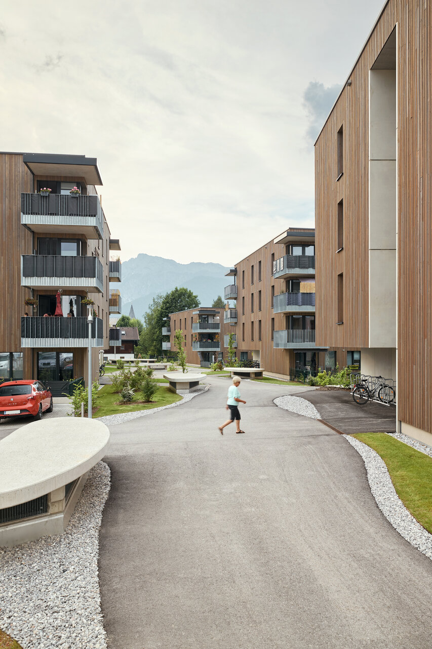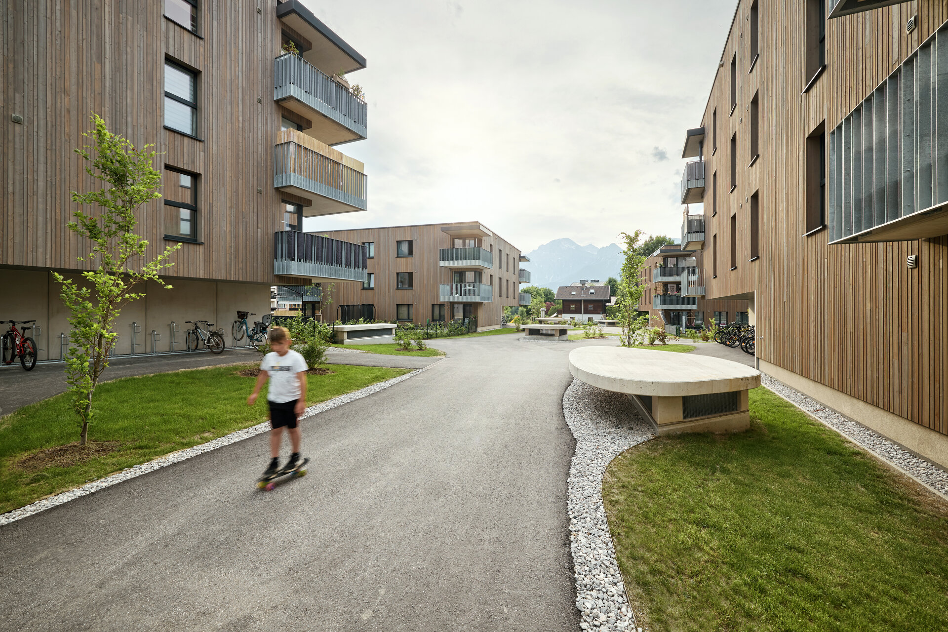 Die fünf auf Lücke gesetzten Würfelhäuser sind durch einen geschwungenen, mit vielen Sitz- und Liegegelegenheiten ausgestatteten Grün- und Begegnungsbereich miteinander verwoben. Es ergeben sich vielerlei Durchblicke zu den umliegenden Bergen.
