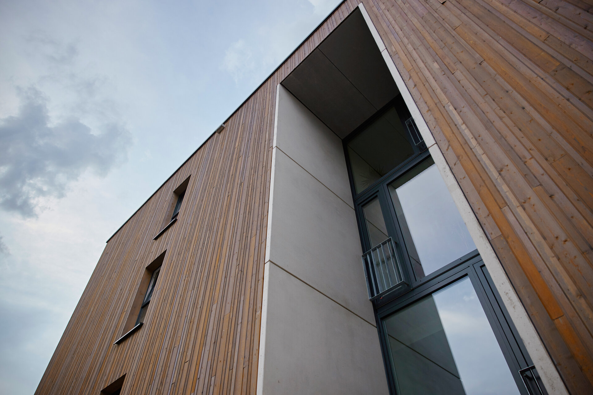 Die Baukörper haben keine Rückseite, sondern zeigen nach allen vier Richtungen eine offene gleichwertige Gestaltung mit vorvergrauten Holzfassaden. Die zweiseitig belichteten „Über-Eck-Wohnungen“ bieten weite diagonale Blicke sowie Sonne morgens und abends. Die Dächer sind extensiv begrünt und tragen Photovoltaik-Anlagen. (Autor: Achim Geissinger, nach einem Text der Architekten)