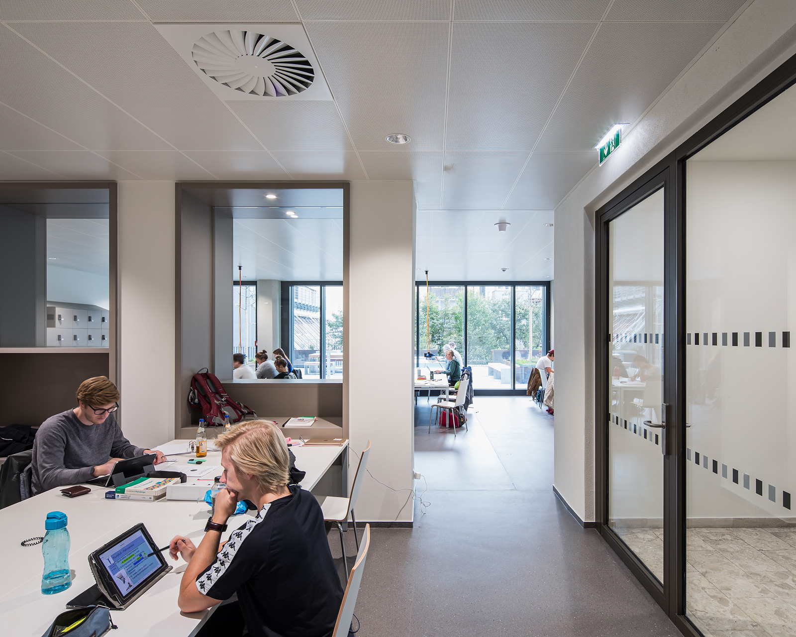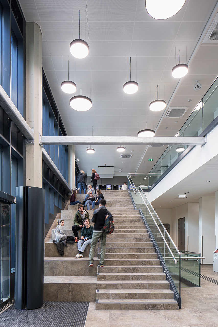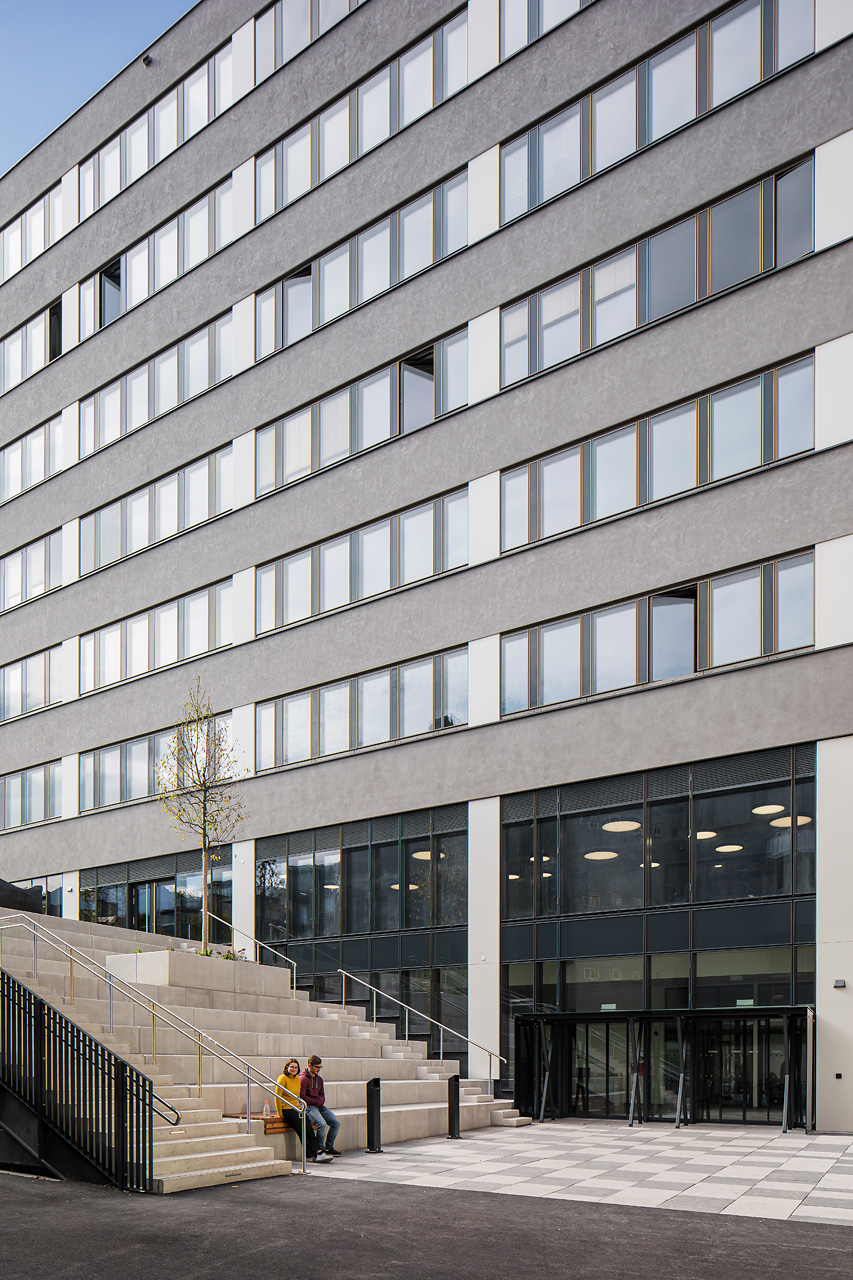 Das vorher komplett unterirdisch liegende Audimax wurde ein Geschoß höhergelegt und auf Erdgeschoßebene über ein Foyer in Sichtverbindung zur Stadt gesetzt. Auf dem Dach des Audimax entstand eine vor den Bibliotheken liegende Aufenthalts- und Lernzone im Freien, die über eine Außentreppe mit Sitzstufen vom Hof aus erreichbar ist und einen neuen, attraktiven Zugang bildet. Der eigentliche Hauptzugang verblieb an der nordwestlichen Gebäudeecke und wurde durch seine Zweigeschoßigkeit klar hervorhoben. Hier wurde ein Zwischentrakt abgebrochen, wodurch zum einen das Lehr- und Lerngebäude freigestellt wurde und zum anderen der Durchgang nach Osten in den von sämtlichen nicht mehr notwendigen Nebenbauten bereinigten Hof und zum „Bibliotheksgarten“ möglich wurde.