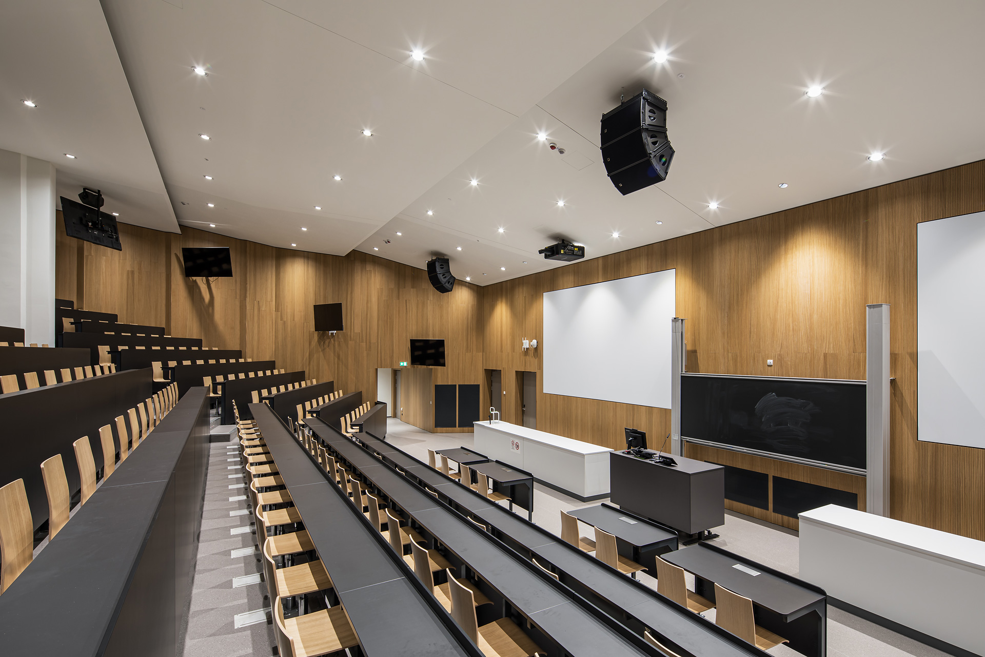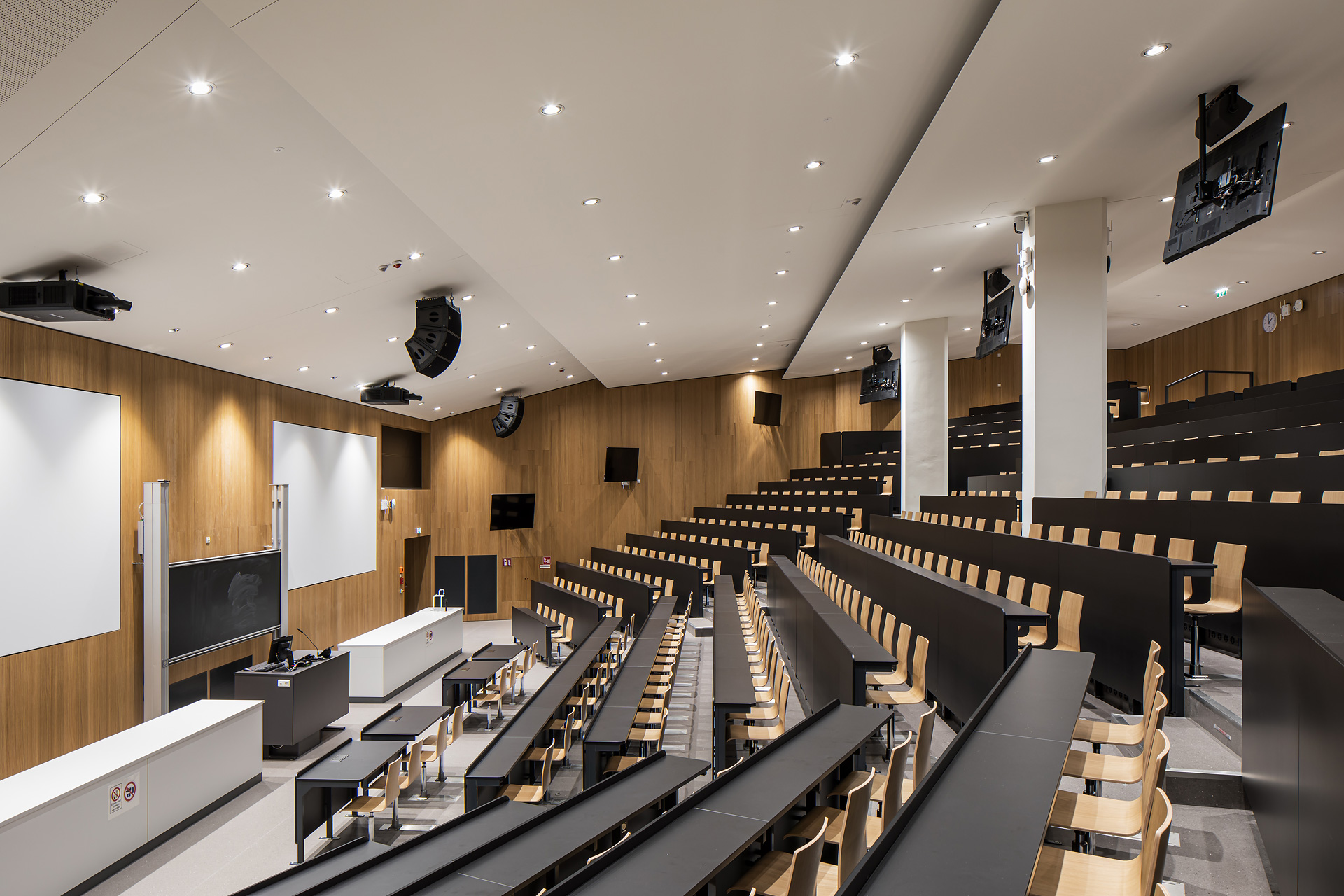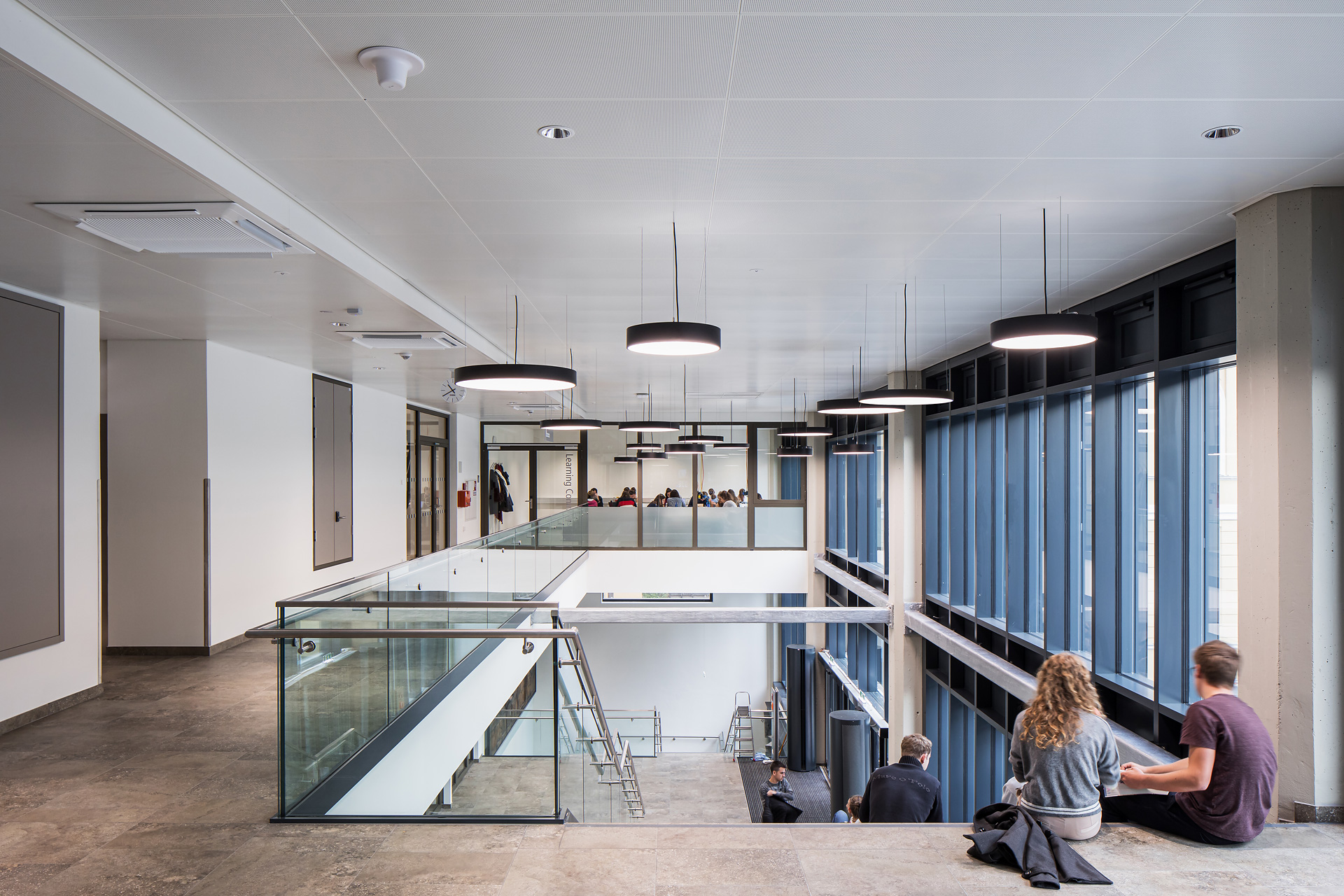 Das vorher komplett unterirdisch liegende Audimax wurde ein Geschoß höhergelegt und auf Erdgeschoßebene über ein Foyer in Sichtverbindung zur Stadt gesetzt. Auf dem Dach des Audimax entstand eine vor den Bibliotheken liegende Aufenthalts- und Lernzone im Freien, die über eine Außentreppe mit Sitzstufen vom Hof aus erreichbar ist und einen neuen, attraktiven Zugang bildet. Der eigentliche Hauptzugang verblieb an der nordwestlichen Gebäudeecke und wurde durch seine Zweigeschoßigkeit klar hervorhoben. Hier wurde ein Zwischentrakt abgebrochen, wodurch zum einen das Lehr- und Lerngebäude freigestellt wurde und zum anderen der Durchgang nach Osten in den von sämtlichen nicht mehr notwendigen Nebenbauten bereinigten Hof und zum „Bibliotheksgarten“ möglich wurde.