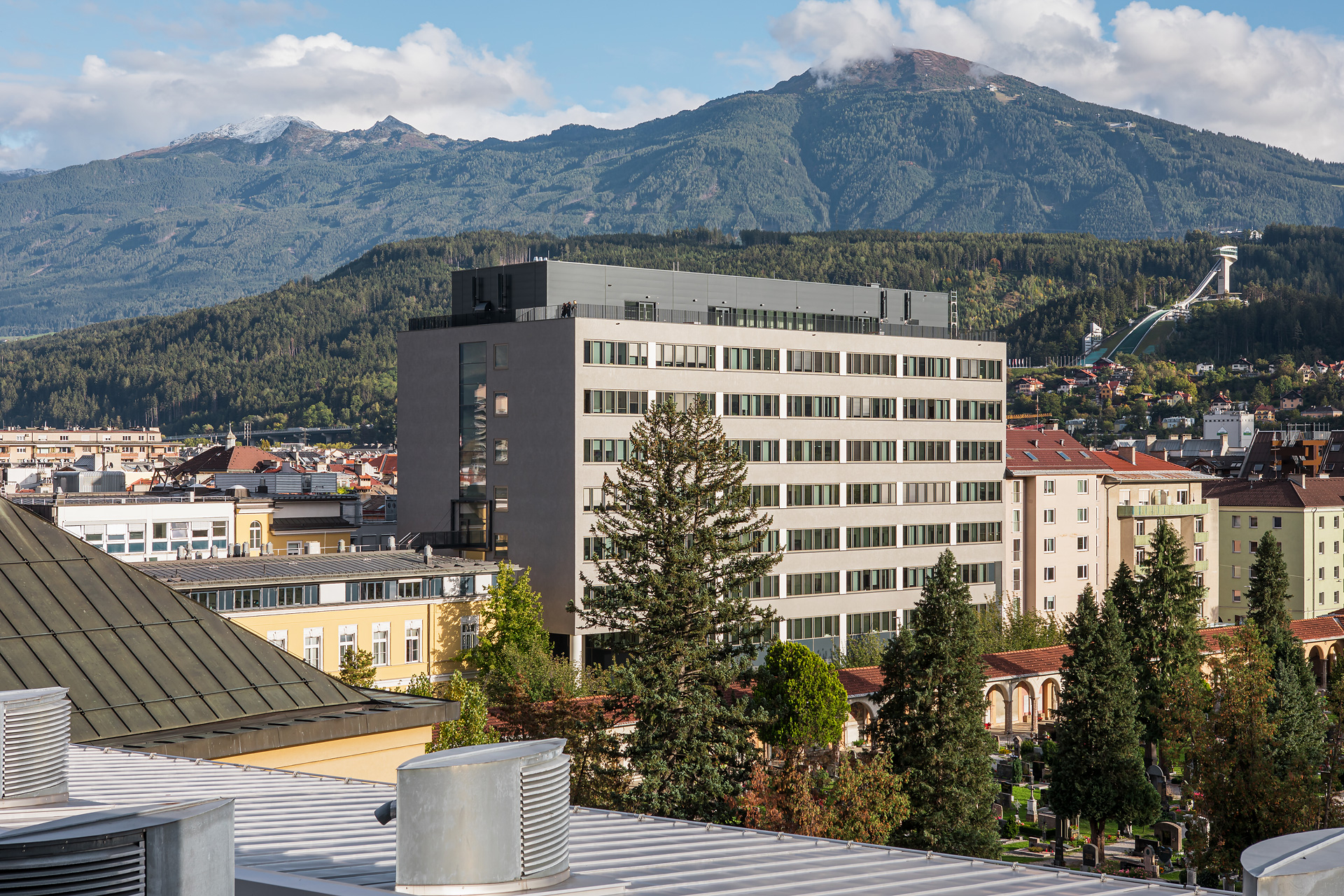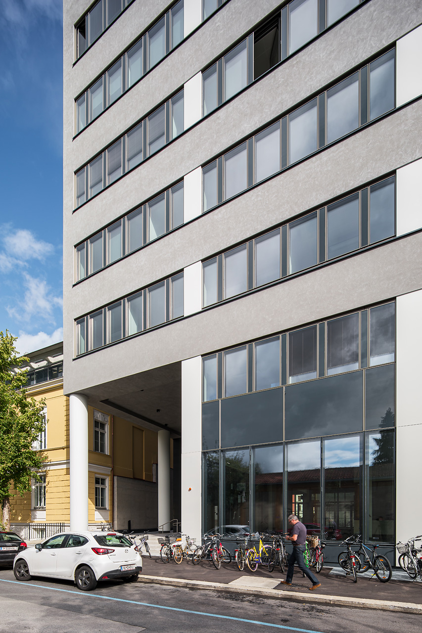 Als Teil eines größeren Gebäudekomplexes der Medizinischen Universität Innsbruck zwischen Fritz-Pregl-Straße, Peter-Mayer-Straße und Schöpfstraße wurde in den 1970er-Jahren von Hubert Prachensky ein Labor-, Büro- und Hörsaalgebäude errichtet. Der aufgrund seiner Dimensionen weithin sichtbare Baukörper – eine klassische Stahlbeton-Rahmenkonstruktion im Achsraster von 7,5 m mit aussteifenden Wandscheiben, deren konstruktive Elemente an der Fassade ablesbar blieben – beherbergte in den beiden Untergeschoßen Hörsäle und Großraumlabor sowie weitere Labors und Büros in den acht Obergeschoßen.Im Zuge der Sanierung und Erweiterung sollte dieses Laborgebäude zu einem Lehr- und Lerngebäude umgewandelt werden, in dem auch die vorher an mehreren Standorten dislozierte Verwaltung zusammengeführt wird. GSSG Architektur konnte den EU-weit offenen Realisierungswettbewerb mit einem Projekt gewinnen, das die Jury aufgrund der logischen Anordnung der wichtigsten neuen Funktionen in der Bestandstruktur überzeugte. Die Kernidee bestand darin, die von den Studierenden intensiv genutzten Räume wie Hörsäle, Bibliotheken, Kurs- und Praktikumsräume in den Sockelgeschoßen zu konzentrieren und über eine großzügige Erschließung zu verbinden.