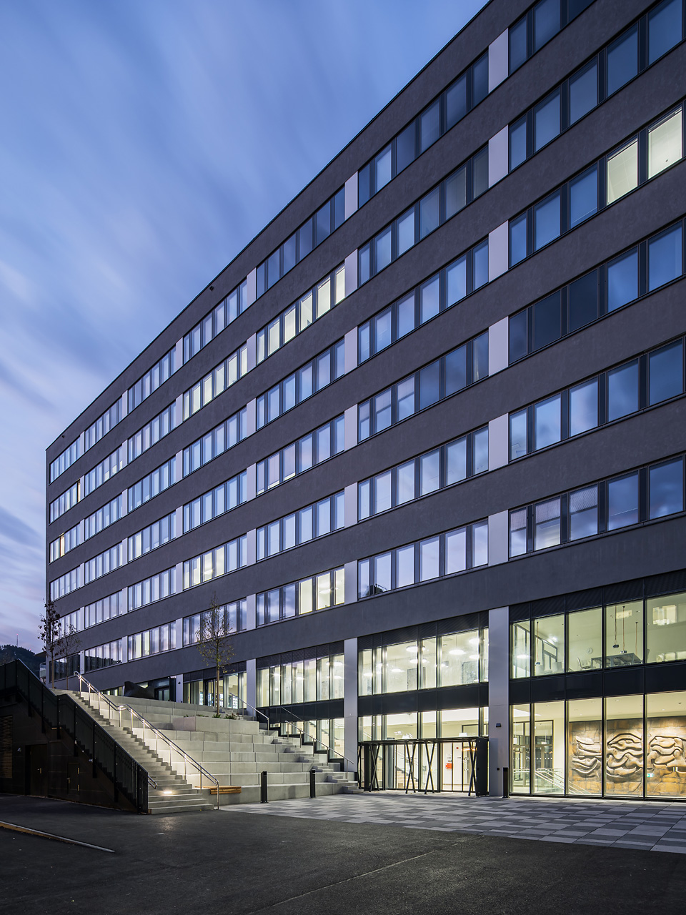 Im Zuge der thermischen Sanierung wurde der gesamte sichtbare Rohbau mit einer neuen Fassade umschlossen, womit die Raumtiefe sowohl an der West- als auch an der Ostseite entscheidend vergrößert und das geforderte Raumprogramm untergebracht werden konnte. Das Technikgeschoß ganz oben wurde komplett neu gestaltet und mit einer 200 m² großen Dachterrasse ausgestattet. (Text: Claudia Wedekind)