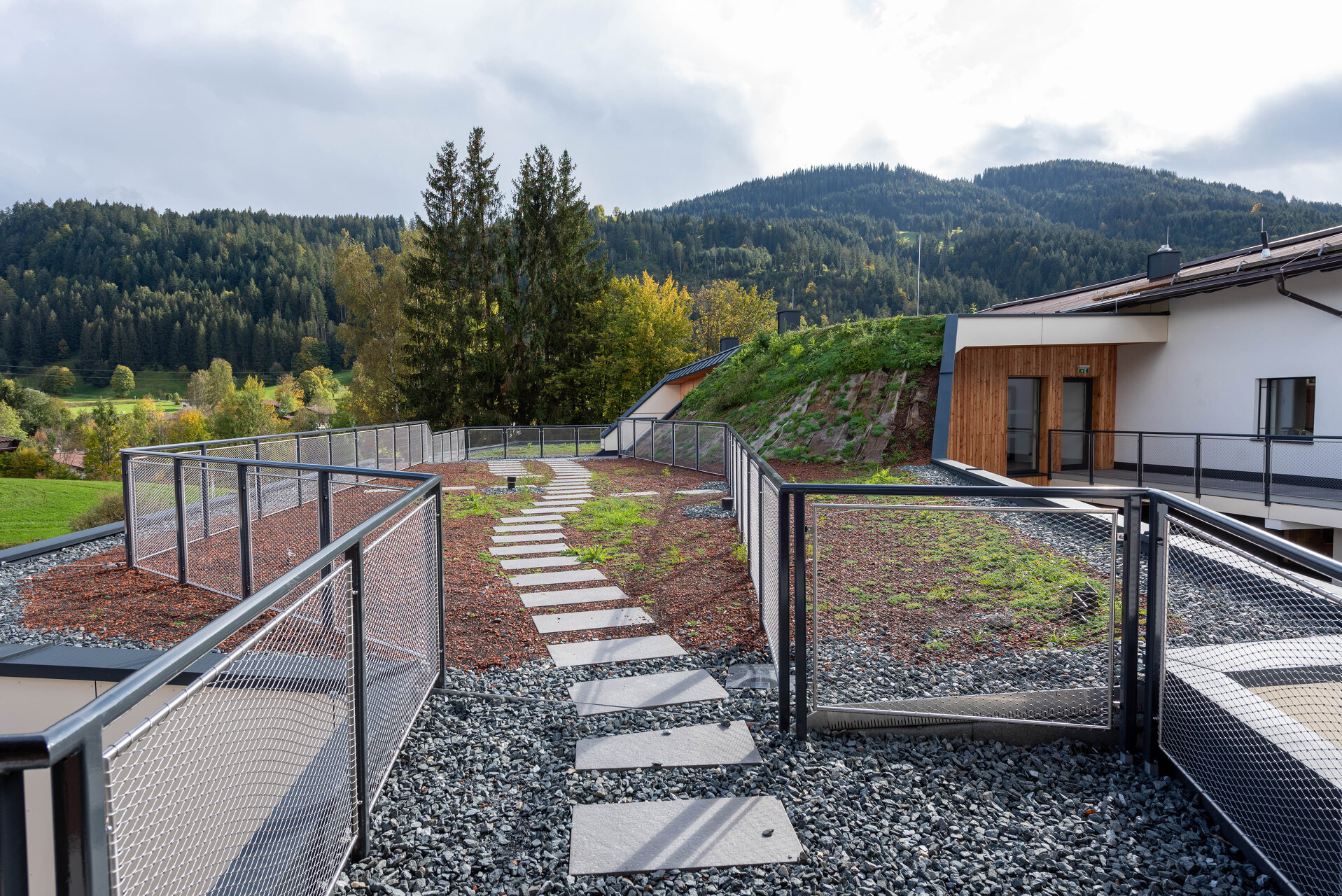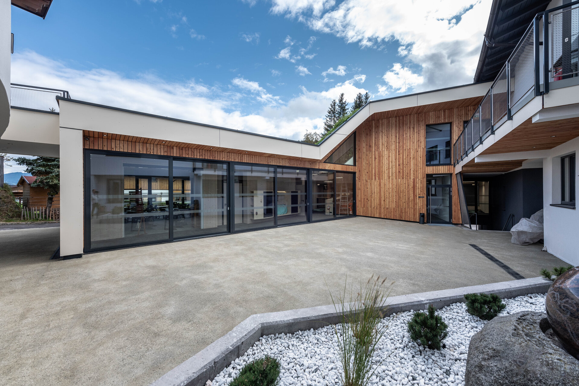 Die Architekten fügen an den erhalten gebliebenen Bauteil einen Baukörper mit zum Teil abgeschrägten Fassaden, der mit seinen weißen Fassadenplatten und dem unbehandelten Lärchenholz eine Verbindung zum Bestand herstellt. Im Untergeschoß, dass zum Teil aufgrund der Hanglage ebenerdig in Erscheinung tritt, befindet sich südseitig der Haupteingang mit der neuen, zentralen Erschließung und den Garderoben. Ebenfalls im südlichen Teil gibt es einen Werkraum mit eigenem Freibereich, im nördlichen – unterirdischen - Teil befinden sich die notwendigen Nebenräume. Eine überdachte Außentreppe führt hinauf in den Innenhof, der zu einem attraktiven Vorplatz für Schule und Dorfsaal ausgestaltet wurde.