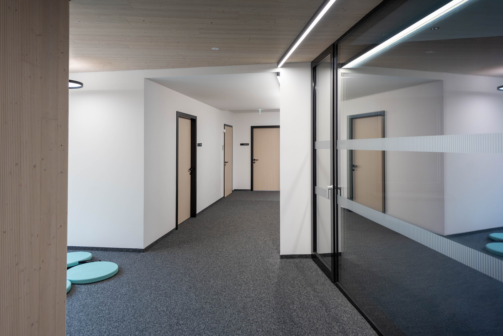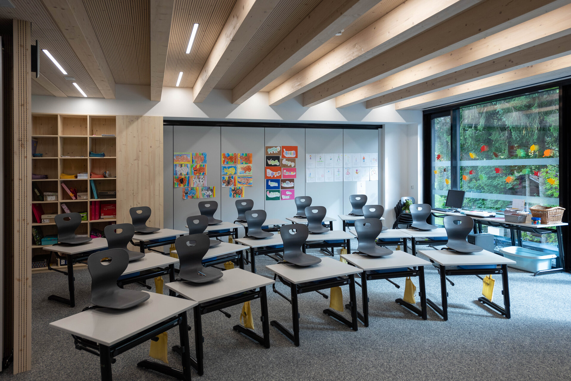 Im Erdgeschoß liegen alle durchgehend genutzten Arbeits- und Unterrichtsräume der Schule. Im Bestand wurde die ursprüngliche Aula für Konferenzraum, Direktion und Sanitärbereiche umgebaut. Im Neubau liegen vier Klassenzimmer, von denen jeweils zwei zu einer großen zusammengelegt werden können. Durch das Verdrehen von jeweils zwei Wandflächen wurden einerseits in der Erschließungszone großzügige Frei- und Rückzugsräume geschaffen, andererseits konnte damit die Akustik in den Klassen verbessert werden. Die Klassenzimmer können über mobile Trennwände zu den Erschließungszonen und über Hebeschiebeetüren weiter zum Schulhof hin geöffnet werden.