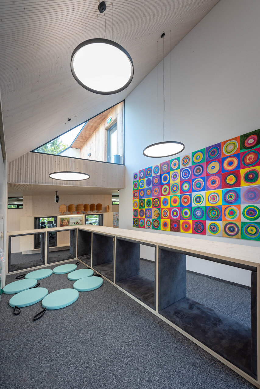 Der im obersten Geschoß des Bestandbaus liegende Dorfsaal erhielt durch die Positionierung des neuen Stiegenhauses einen eigenen Vorraum, Sanitäranlagen und eineGarderobe. Der Saal selbst blieb erhalten, wurde technisch nachgerüstet und durch eine Dachterrasse im Neubau aufgewertet. Für die ebenfalls in der Volksschule beheimatete Bundesmusikkapelle entstand im Keller ein neues Probelokal, die Garderoben und Aufenthaltsbereiche wurden in die frei gewordenen Flächen im Bestand übersiedelt. (Text: Claudia Wedekind, nach einem Text der Architekten)