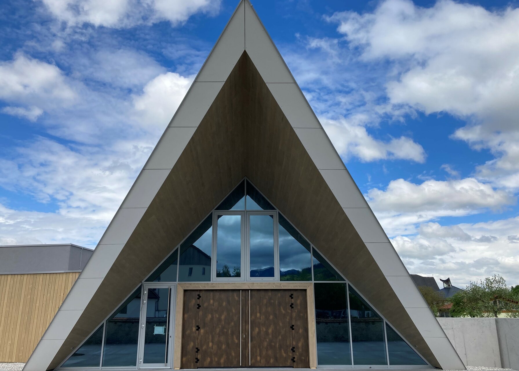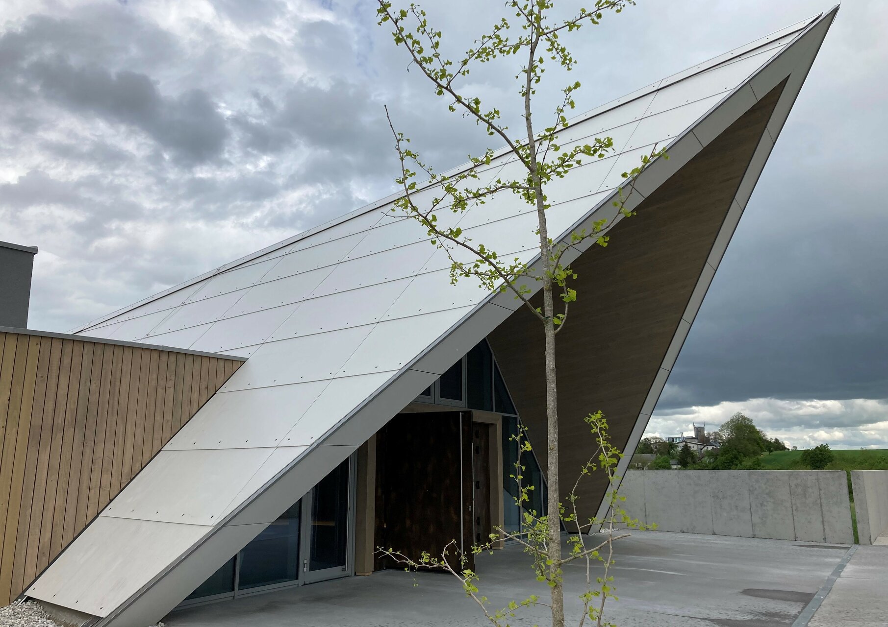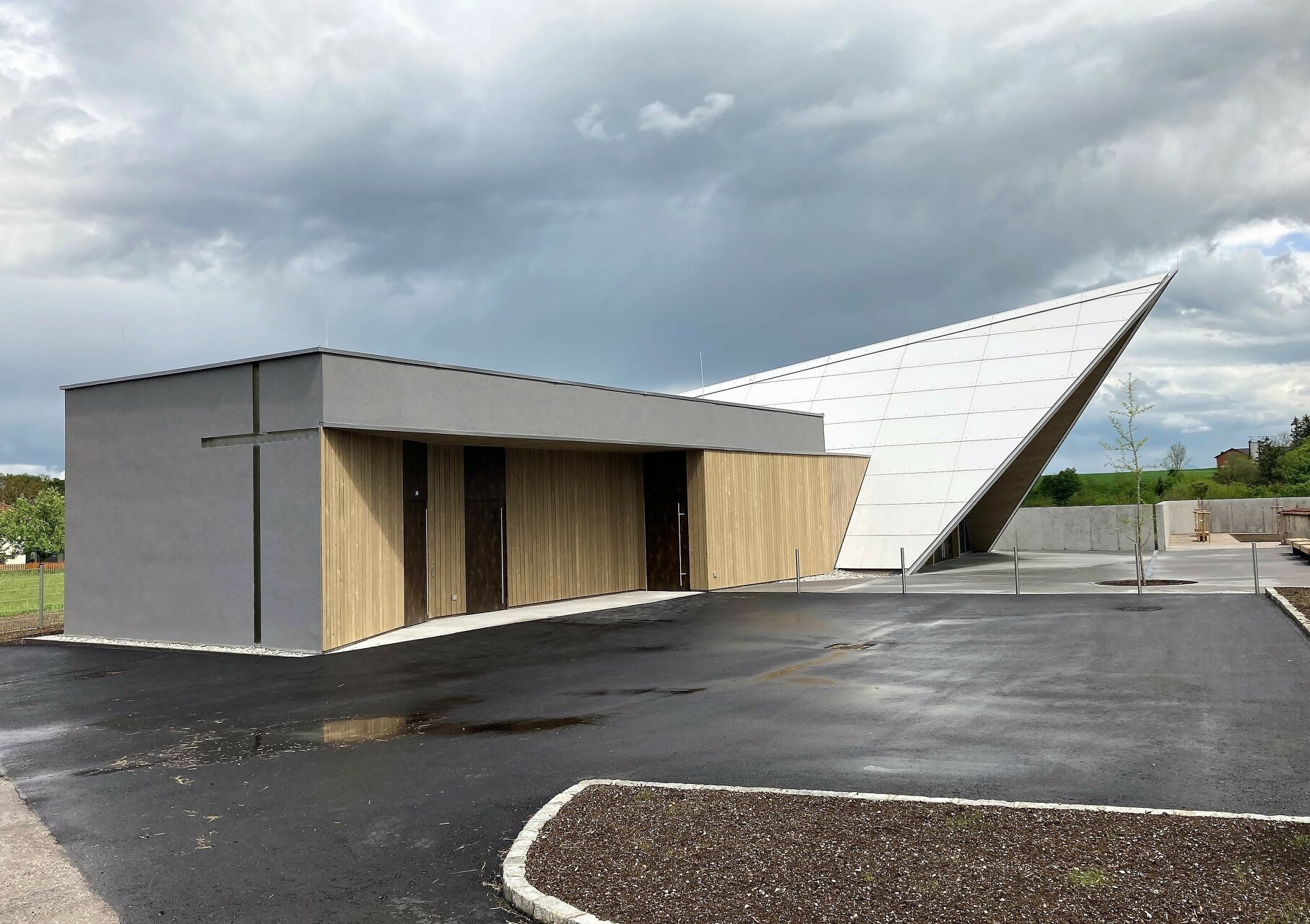 Im Zusammenspiel mit dem Geviert der bestehenden Anlage definiert der Neubau einen offenen Hof. Dieser ist lediglich durch eine Pollerreihe begrenzt, er verbindet mit der winkelförmigen Fläche des neu geschaffenen Urnenhains und verleiht dem Kondukt so einen angemessenen Rahmen. Die Fassadengestaltung ist geprägt von der betongrau verputzten Grundform des Würfels, von vertikalen Holzschalungselementen und rohweißen Faserzemenplatten. Der Kubus wurde in Ortbeton ausgeführt und mit bewusst gesetzten, minimalen Öffnungen versehen. Die massive Bauweise gewährleistet auch die statische Trag- und Haltefunktion für den anschließenden Flügel in Holzriegelbauweise.