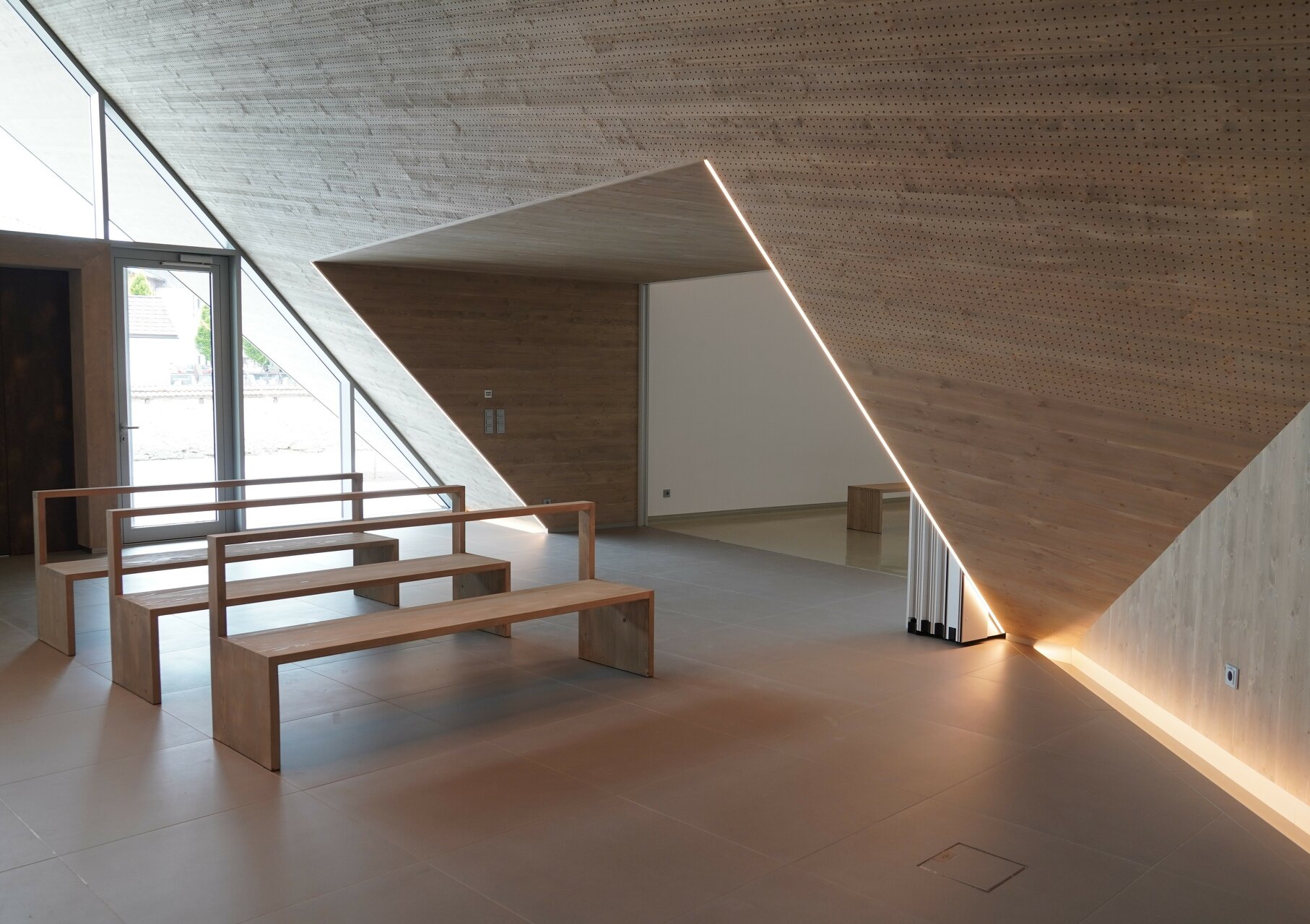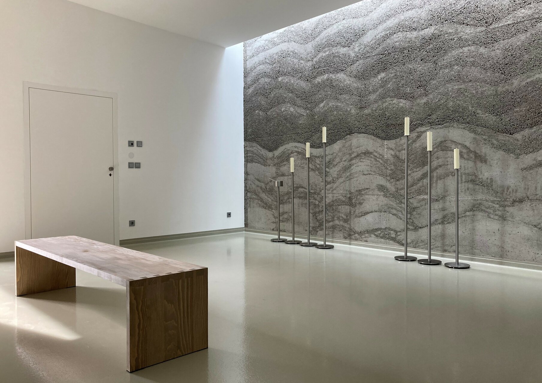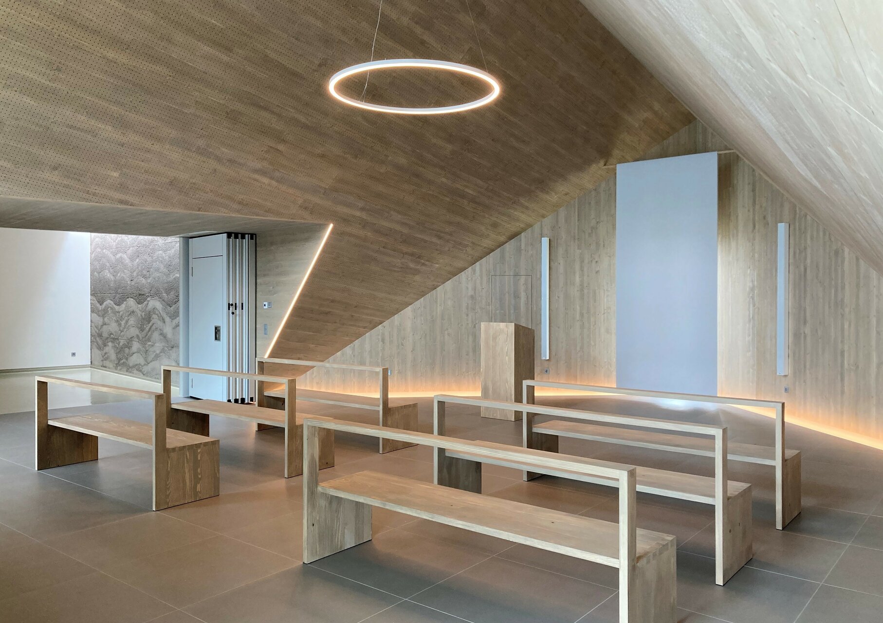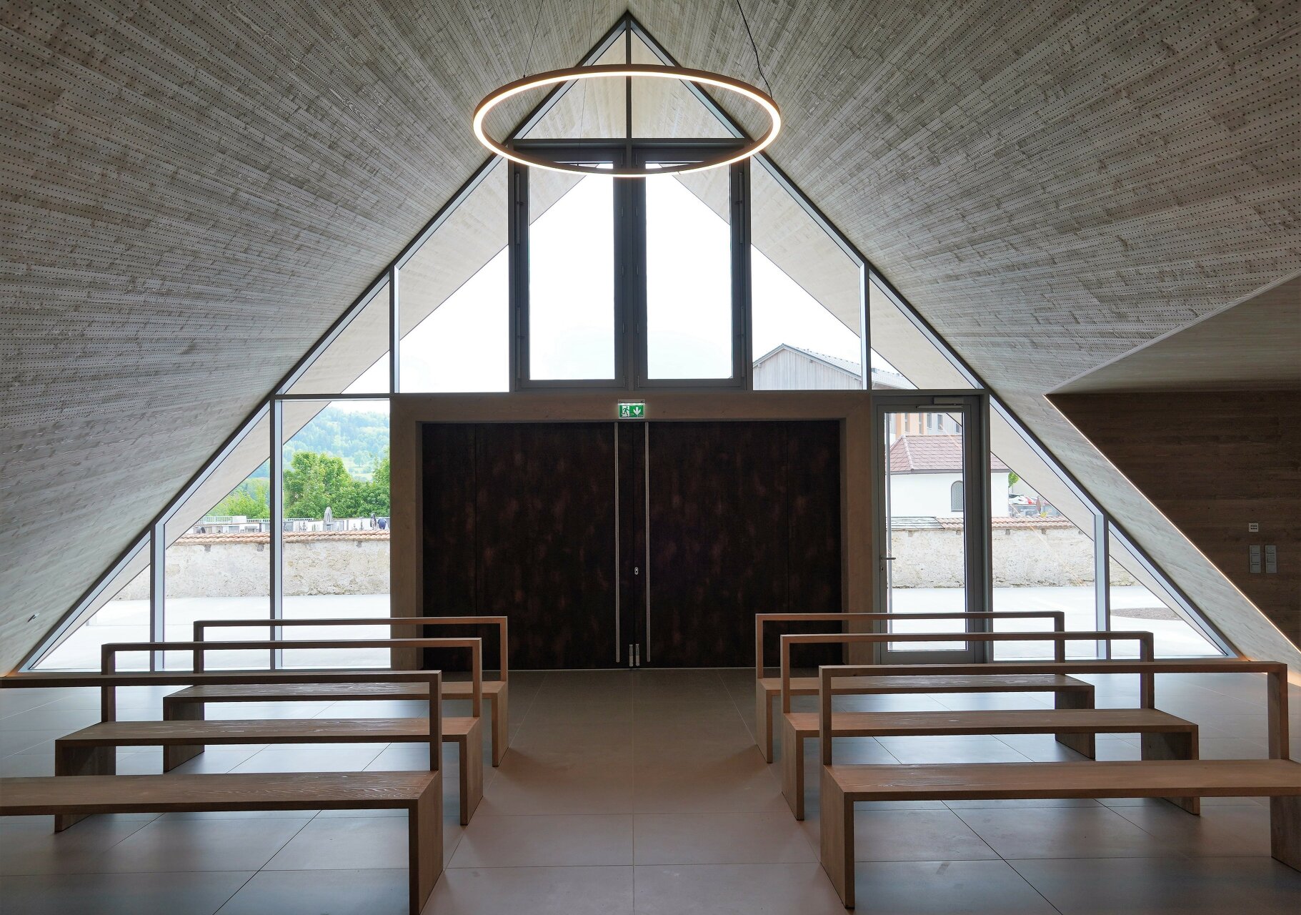 Das dialogische Entwurfskonzept spiegelt sich in der innenräumlichen Organisation. Der Aufbahrungsraum symbolisiert mit der raumprägenden Stampfbetonwand die „irdische“ Dimension. Seine besondere, reduzierte Lichtstimmung gibt der individuellen Trauer im Vorfeld der Bestattung einen würdigen Rahmen. Die passende Atmosphäre für die Aussegnungs- bzw. Verabschiedungsfeier bietet hingegen der luftige, lichte, ins Offene weisende Bauteil des Flügels. In seine Glasfassade ist das Hauptportal als „Pforte“ eingespannt. (Text: Tobias Hagleitner, nach einem Text des Architekten)