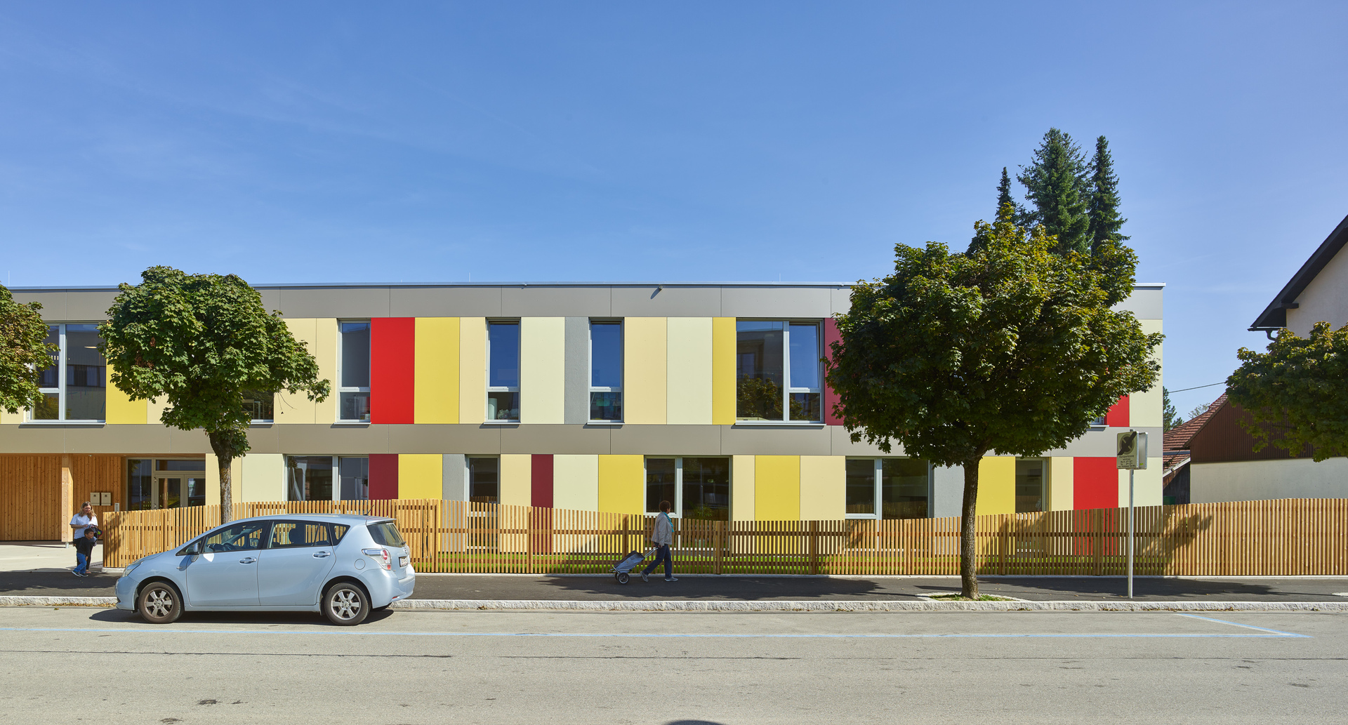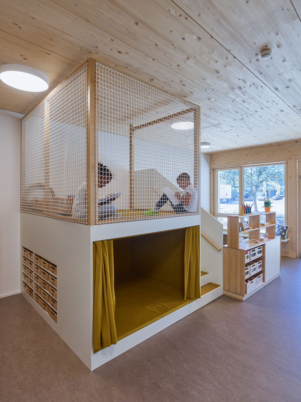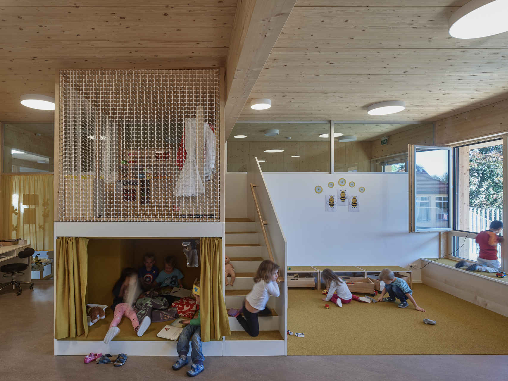 Der Haupteingang von Kindergarten und Krabbelstube befindet sich im Westen, wo auch die Busbucht liegt. Der Gebäudeeinschnitt kennzeichnet den Zugang und schützt vor Witterung. Von der gemeinsamen Eingangszone sind Krabbelstube und Kindergarten unmittelbar erreichbar. Der multifunktionale Gruppenraum liegt zwischen den beiden Bereichen und steht somit allen für unterschiedlichste Aktivitäten zur Verfügung. Das Zentrum des Kindergartens ist der großzügige Essbereich, der sich mit dem angrenzenden Bewegungsraum zusammenschließen und für Veranstaltungen aller Art nutzen lässt – mit direktem Gartenzugang. Die Erschließungszonen sind so gestaltet, dass sie sich jeweils an den Gruppeneingängen zu gemeinsam genutzten Spielecken erweitern. Sämtliche Gruppenräume sind gemäß ihren Nutzungszeiten nach Osten ausgerichtet. Die Servicezonen befinden sich hingegen im Westen, Richtung Straße.