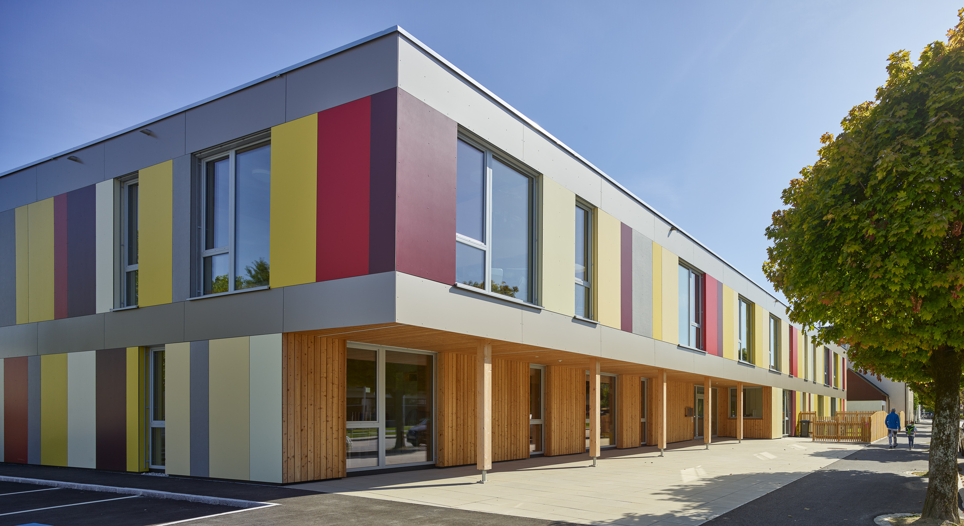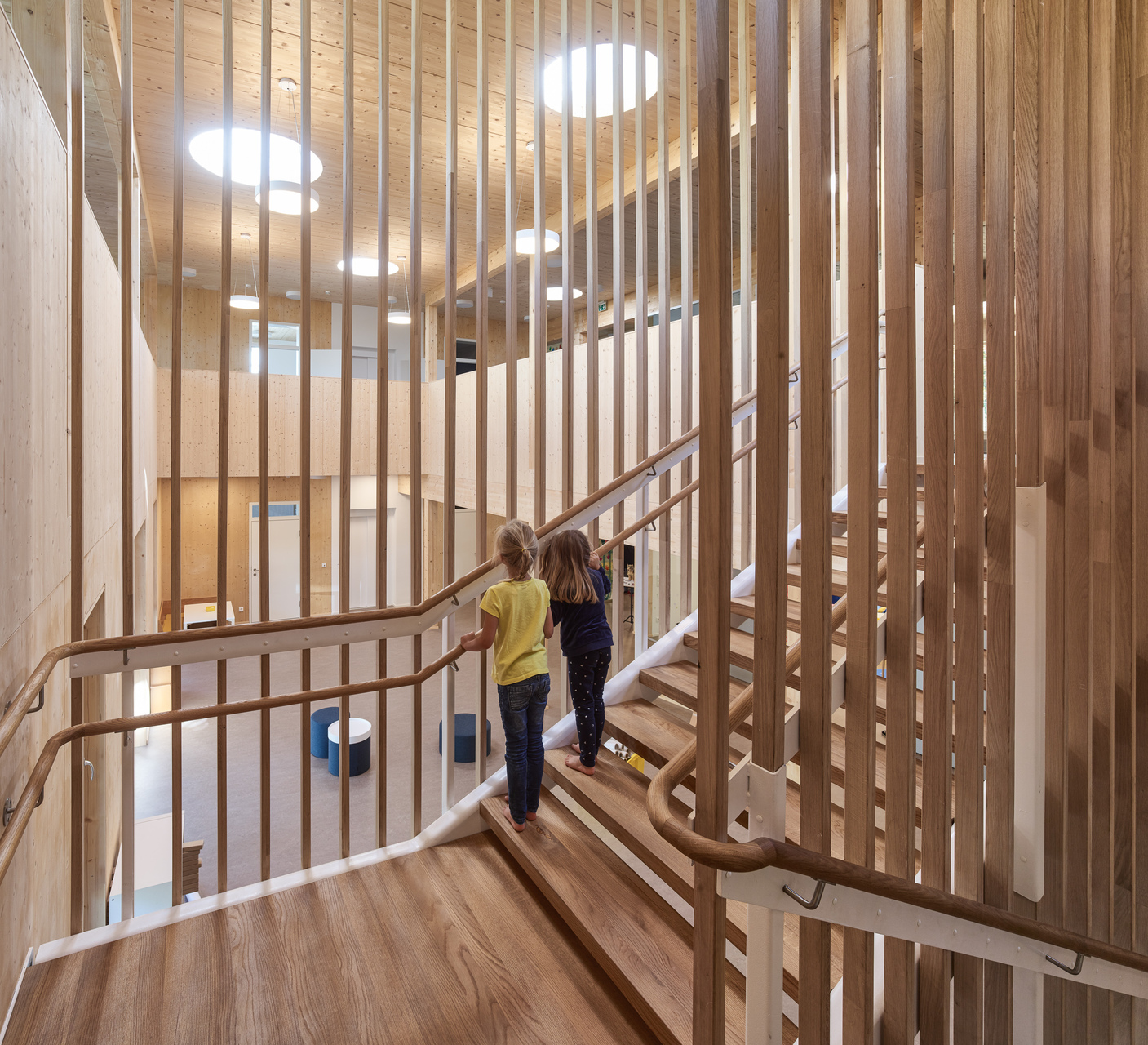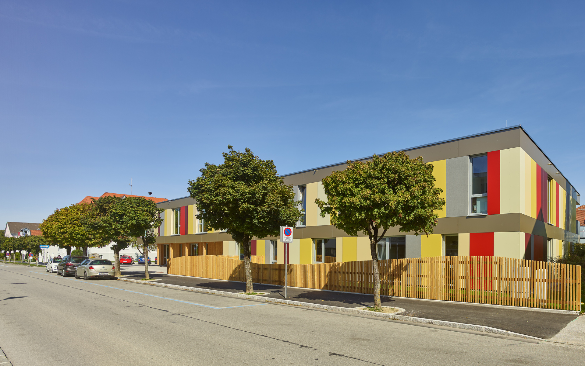 Der Haupteingang von Kindergarten und Krabbelstube befindet sich im Westen, wo auch die Busbucht liegt. Der Gebäudeeinschnitt kennzeichnet den Zugang und schützt vor Witterung. Von der gemeinsamen Eingangszone sind Krabbelstube und Kindergarten unmittelbar erreichbar. Der multifunktionale Gruppenraum liegt zwischen den beiden Bereichen und steht somit allen für unterschiedlichste Aktivitäten zur Verfügung. Das Zentrum des Kindergartens ist der großzügige Essbereich, der sich mit dem angrenzenden Bewegungsraum zusammenschließen und für Veranstaltungen aller Art nutzen lässt – mit direktem Gartenzugang. Die Erschließungszonen sind so gestaltet, dass sie sich jeweils an den Gruppeneingängen zu gemeinsam genutzten Spielecken erweitern. Sämtliche Gruppenräume sind gemäß ihren Nutzungszeiten nach Osten ausgerichtet. Die Servicezonen befinden sich hingegen im Westen, Richtung Straße.